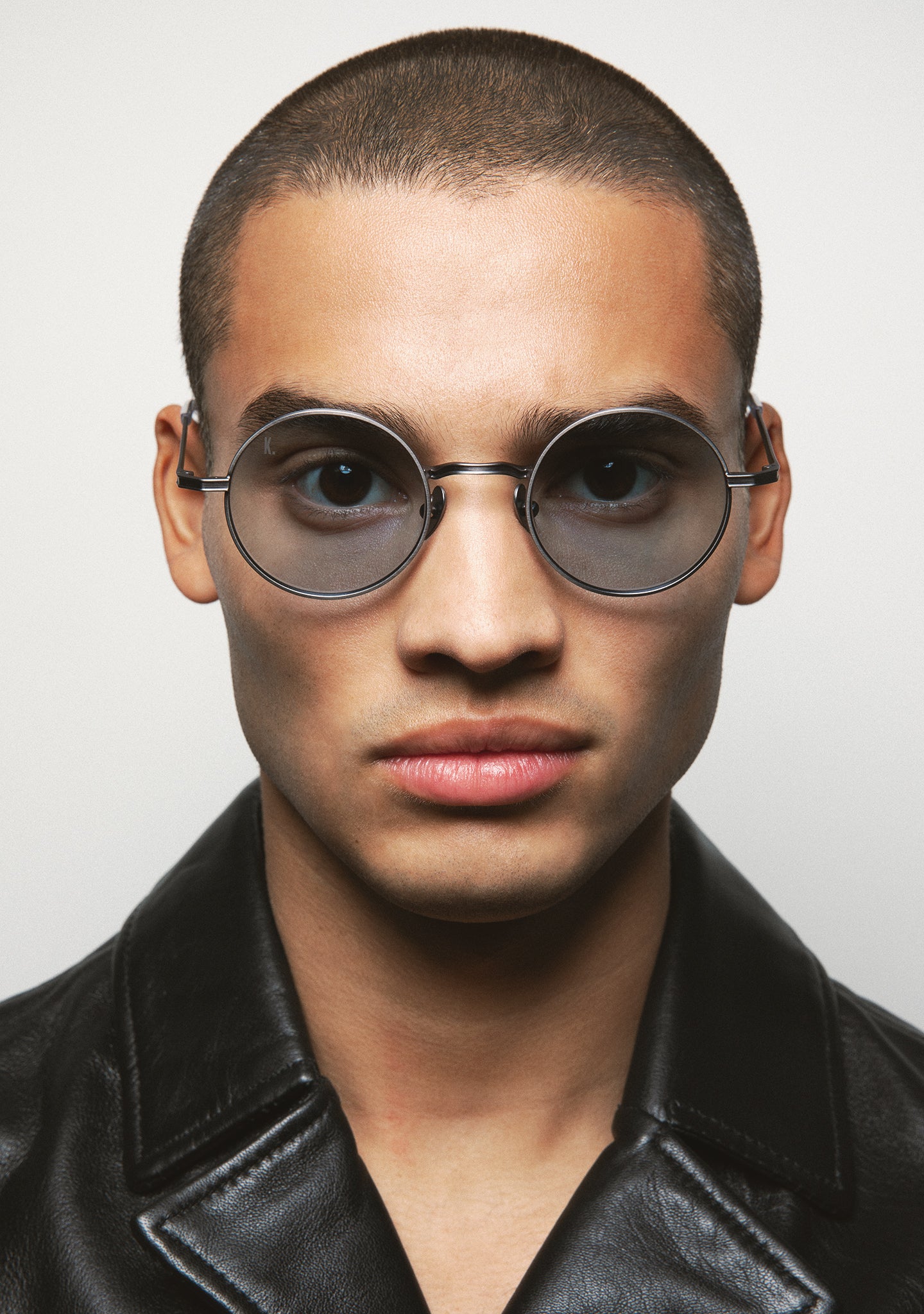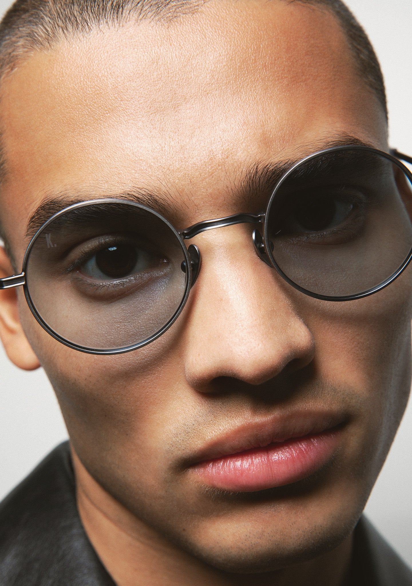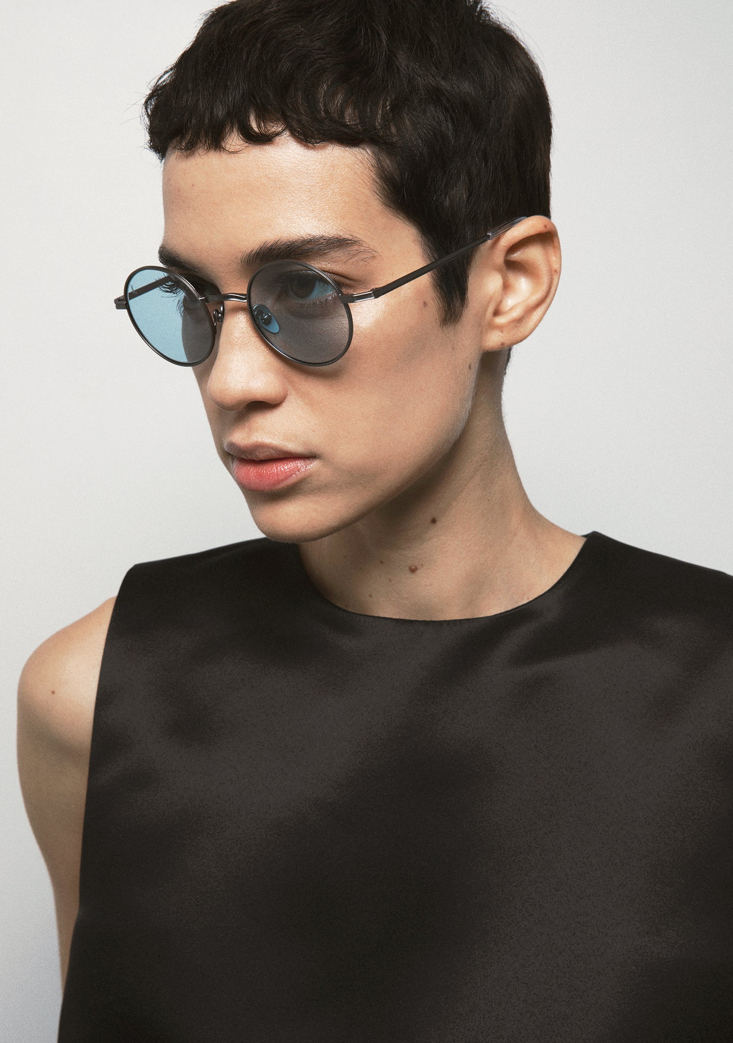 Round sunglasses. Brushed dark grey stainless steel structure. Temples and bridge with grooves along the profile. Temples with acetate tips. Blue tint gradient 2-base photochromatic lenses. Category 1 3 lenses. Built-in stainless steel nose pads. Handmade.