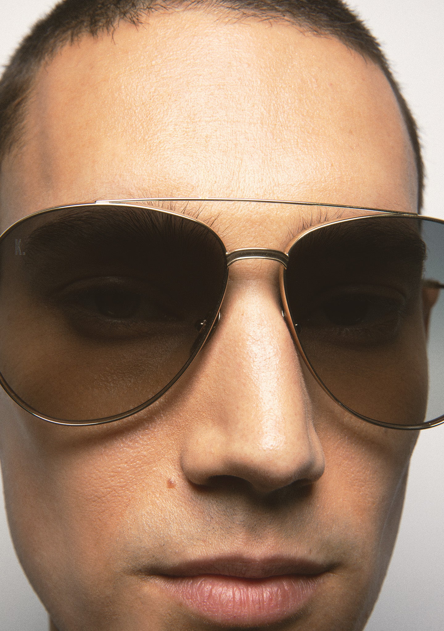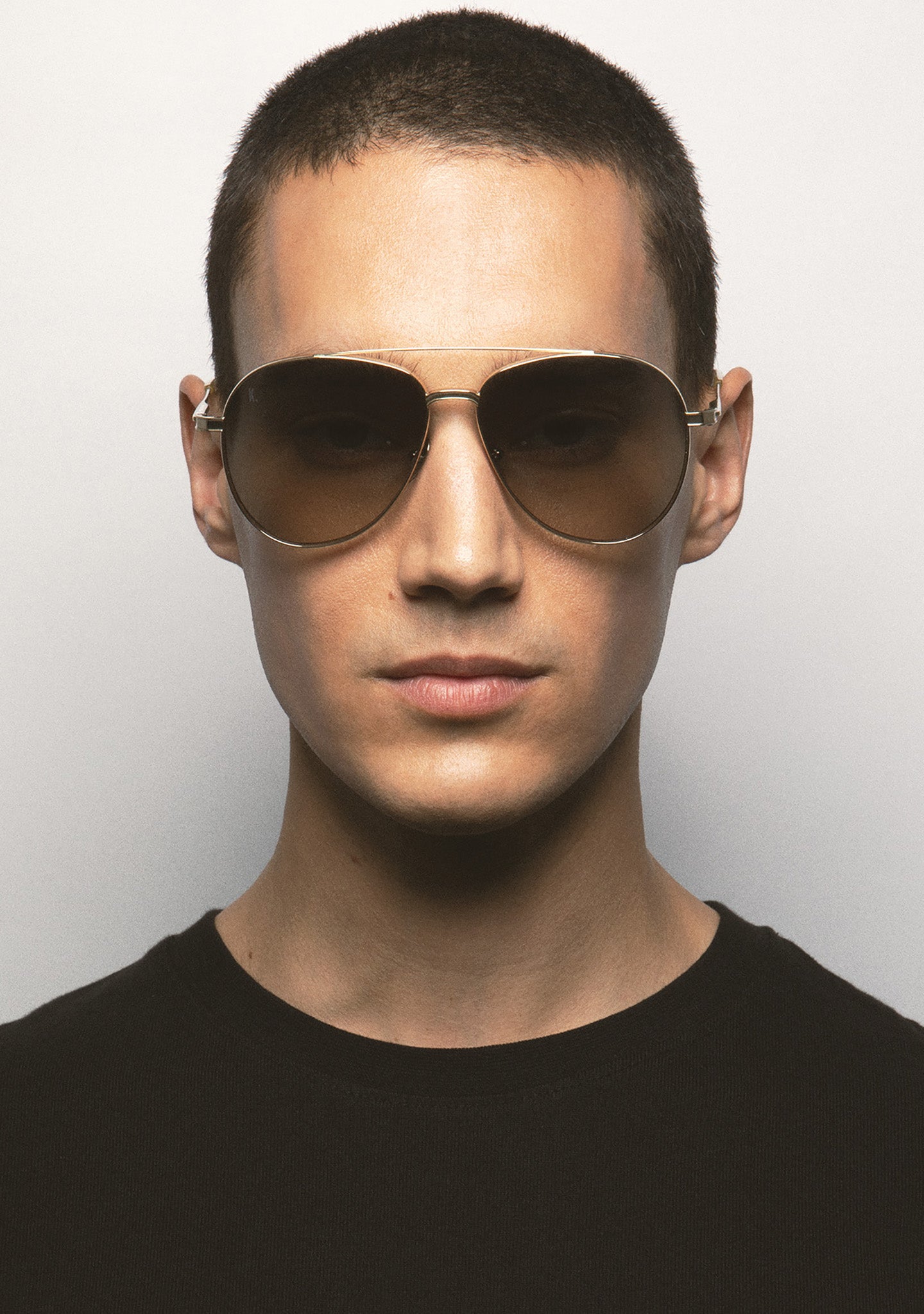 Aviator-shaped sunglasses. Matte black titanium front and temples. Matte black acetate temple tips. Black gradient 2-base lens with 100% UV protection and anti-reflective treatment. Category 3 lens. Built-in nose pads. Handmade.