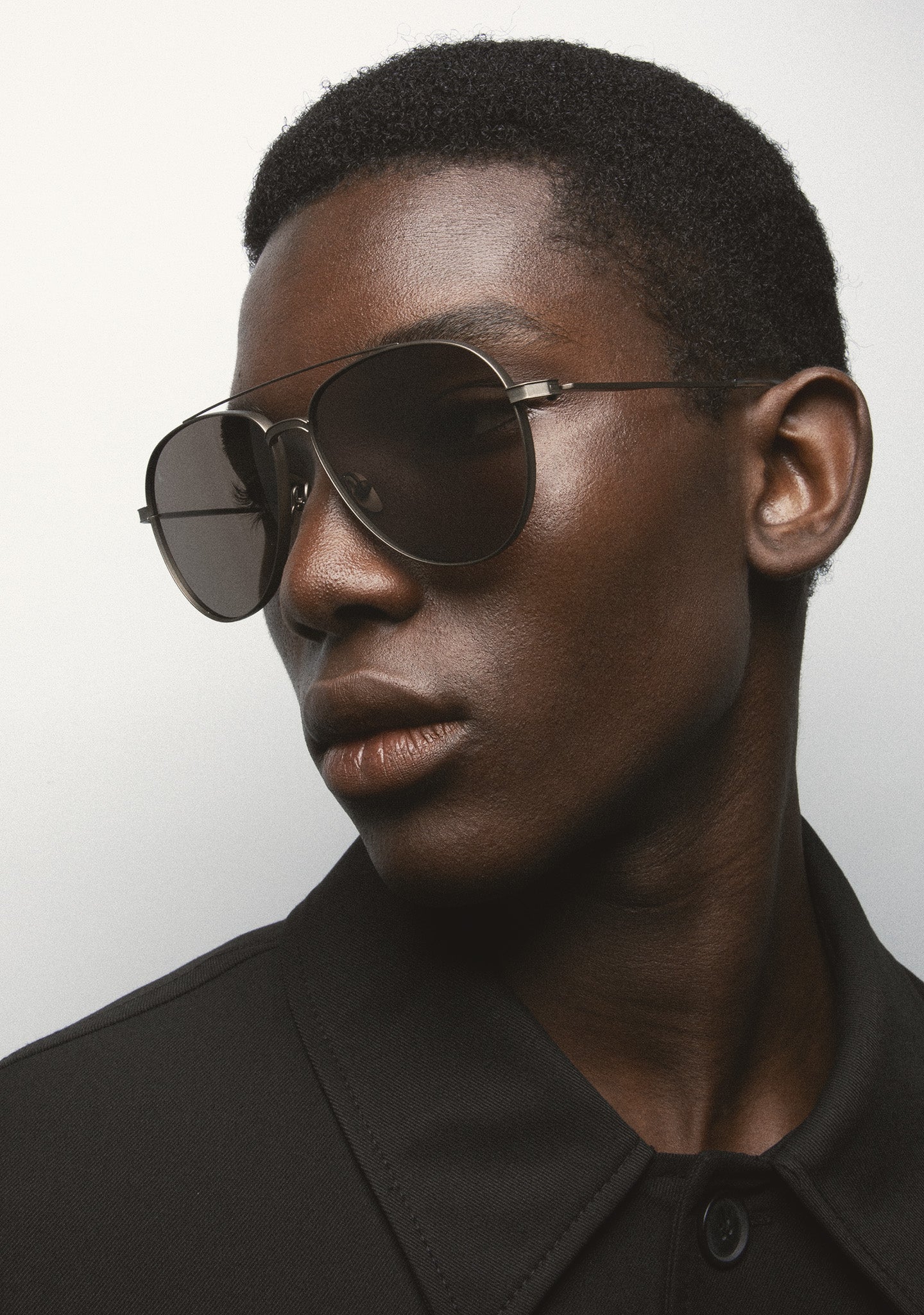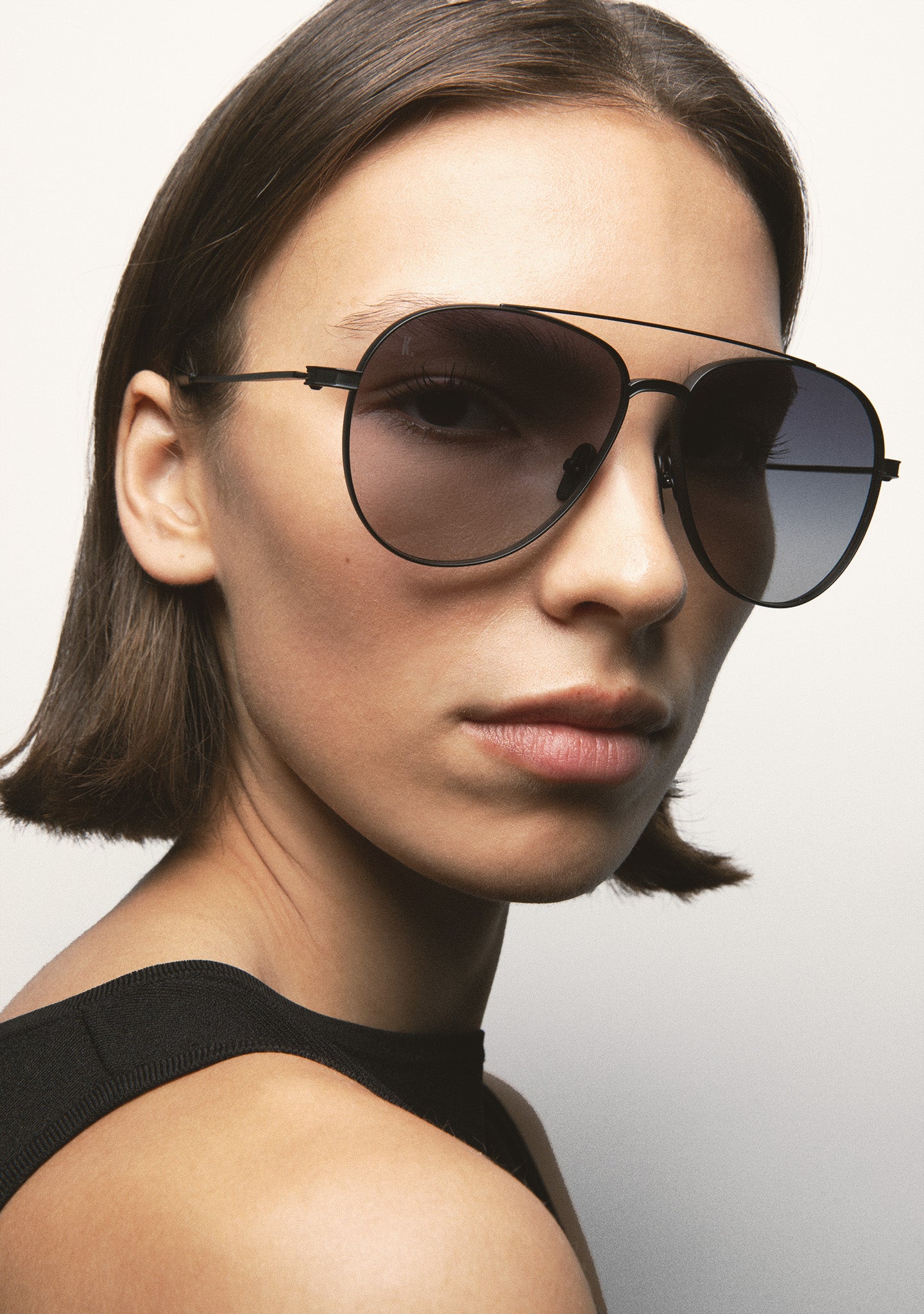 Aviator-shaped sunglasses. Matte black titanium front and temples. Matte black acetate temple tips. Black gradient 2-base lens with 100% UV protection and anti-reflective treatment. Category 3 lens. Built-in nose pads. Handmade.