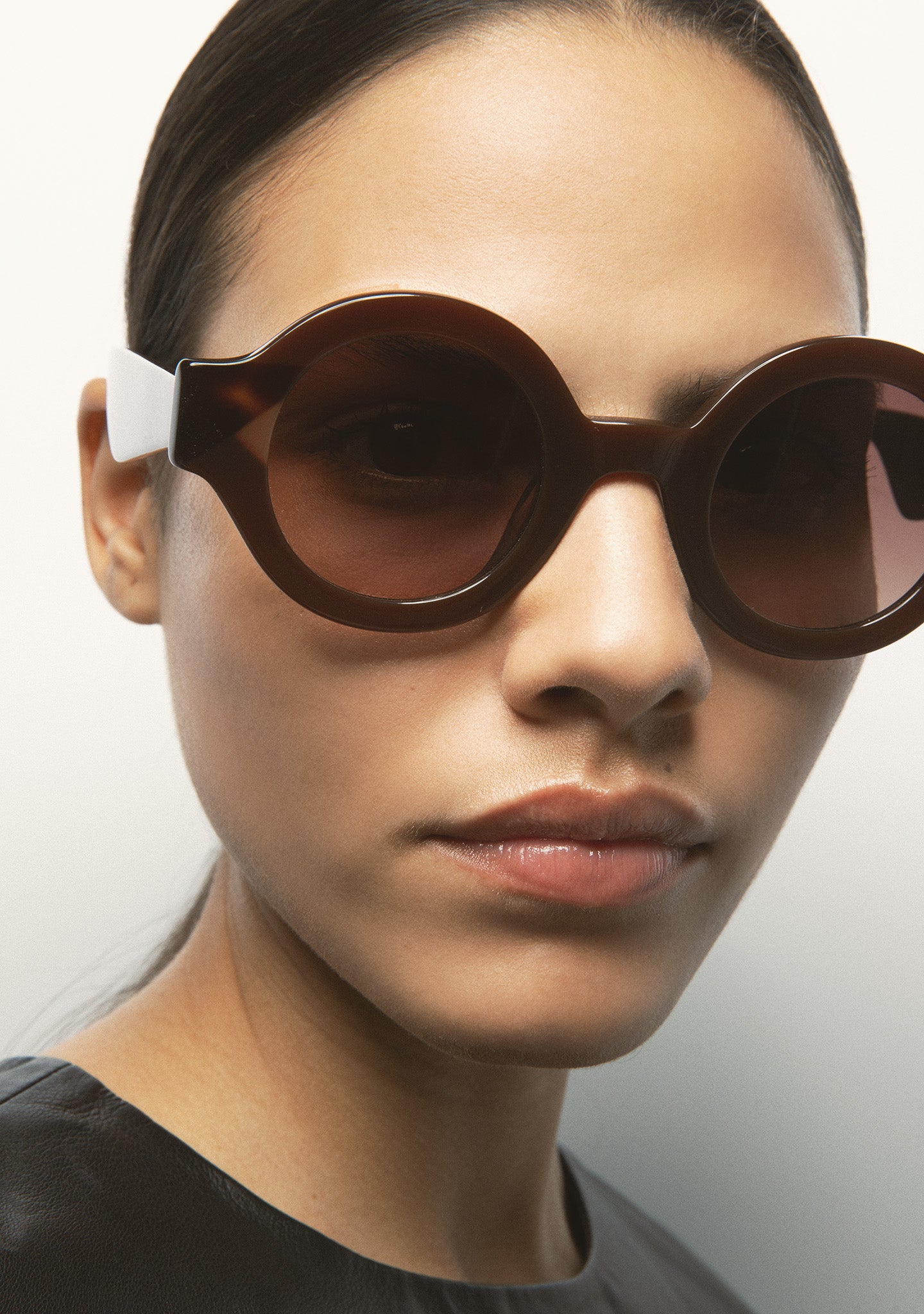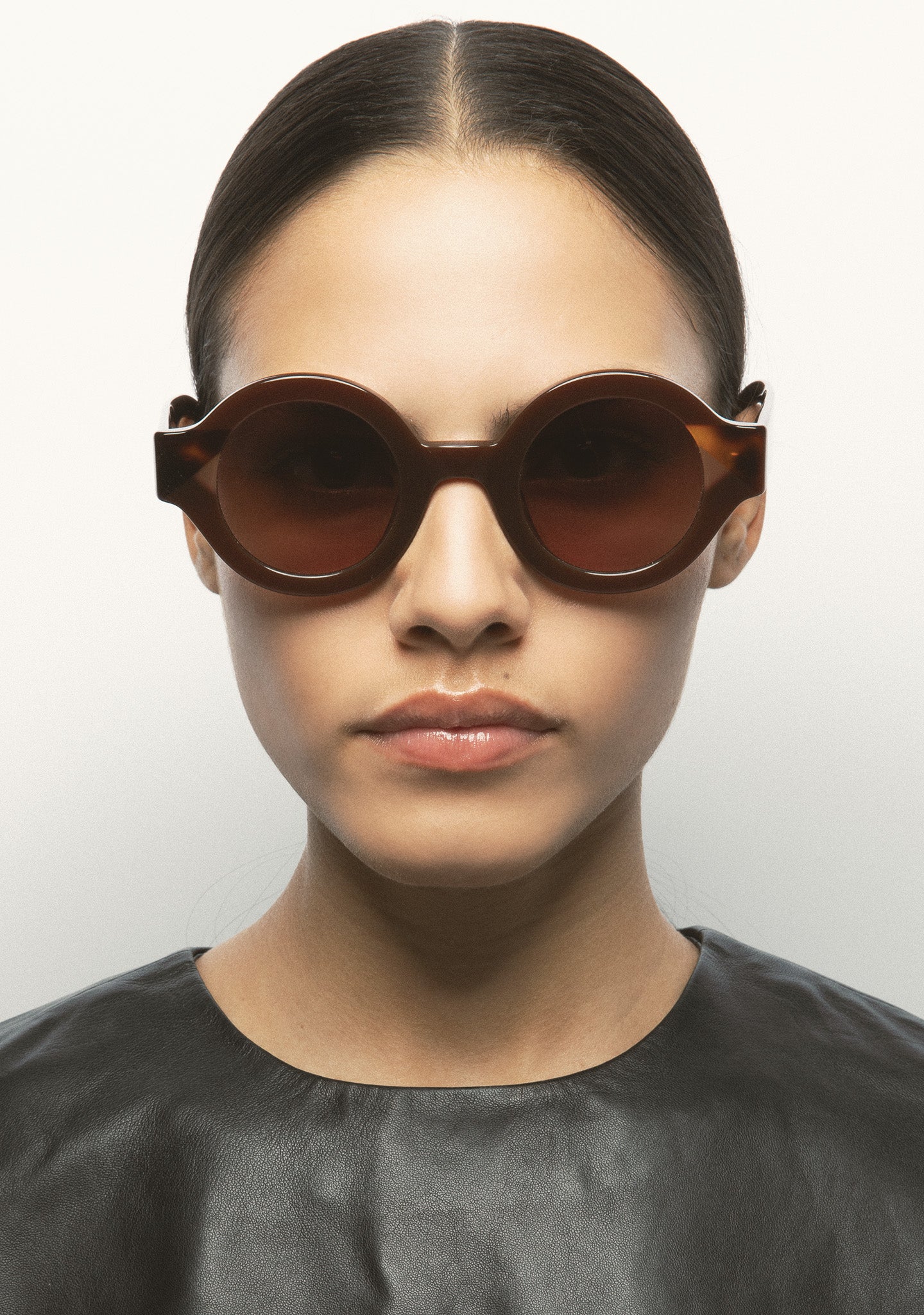 Round-shaped sunglasses. Front made of black acetate with double laminate of Havana brown and translucent beige. Black acetate temples. Grey gradient lens, category 2, with 100% UV protection and anti-reflective coating. Category 3 lens. Integrated acetate nose pads. Handmade.