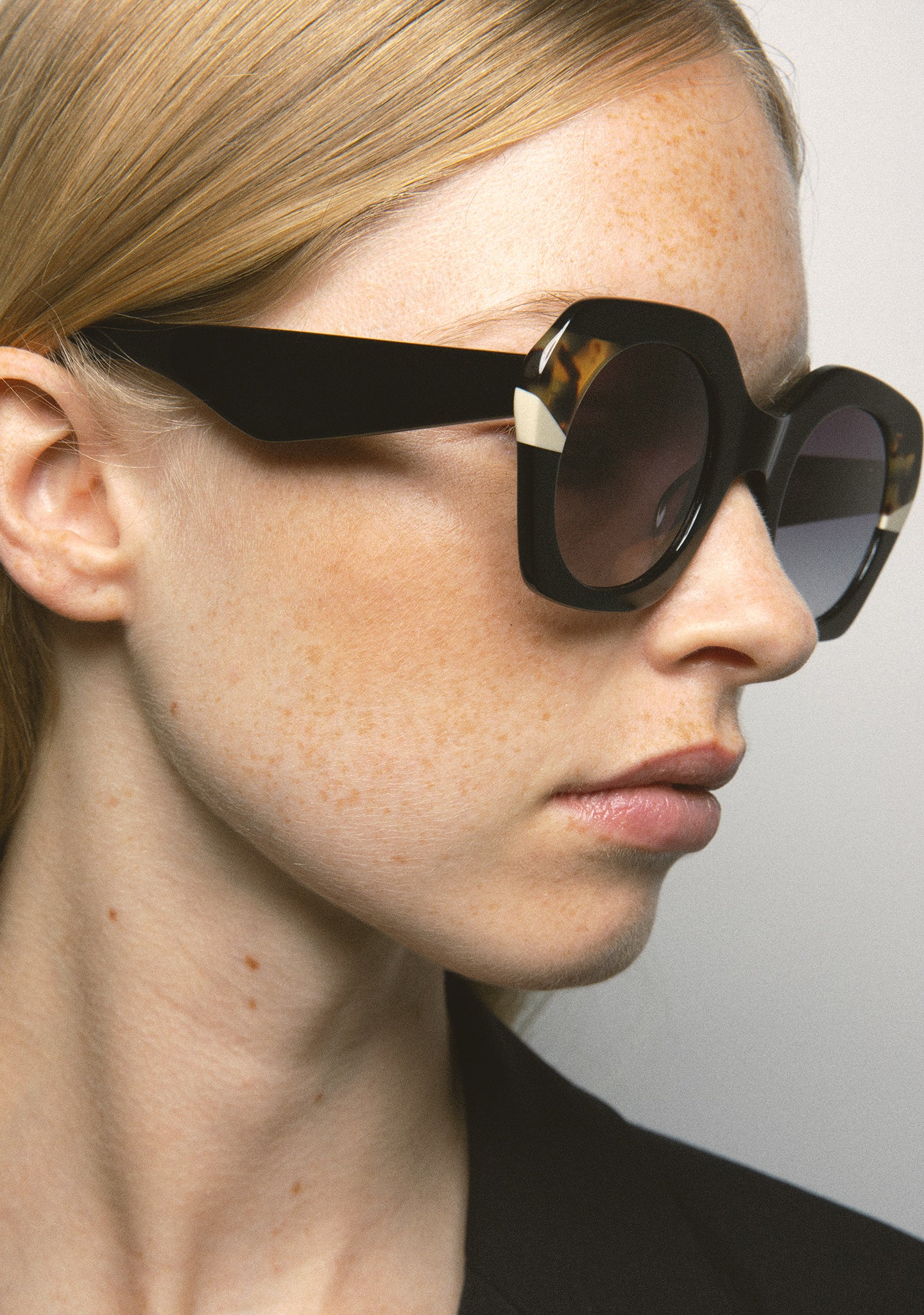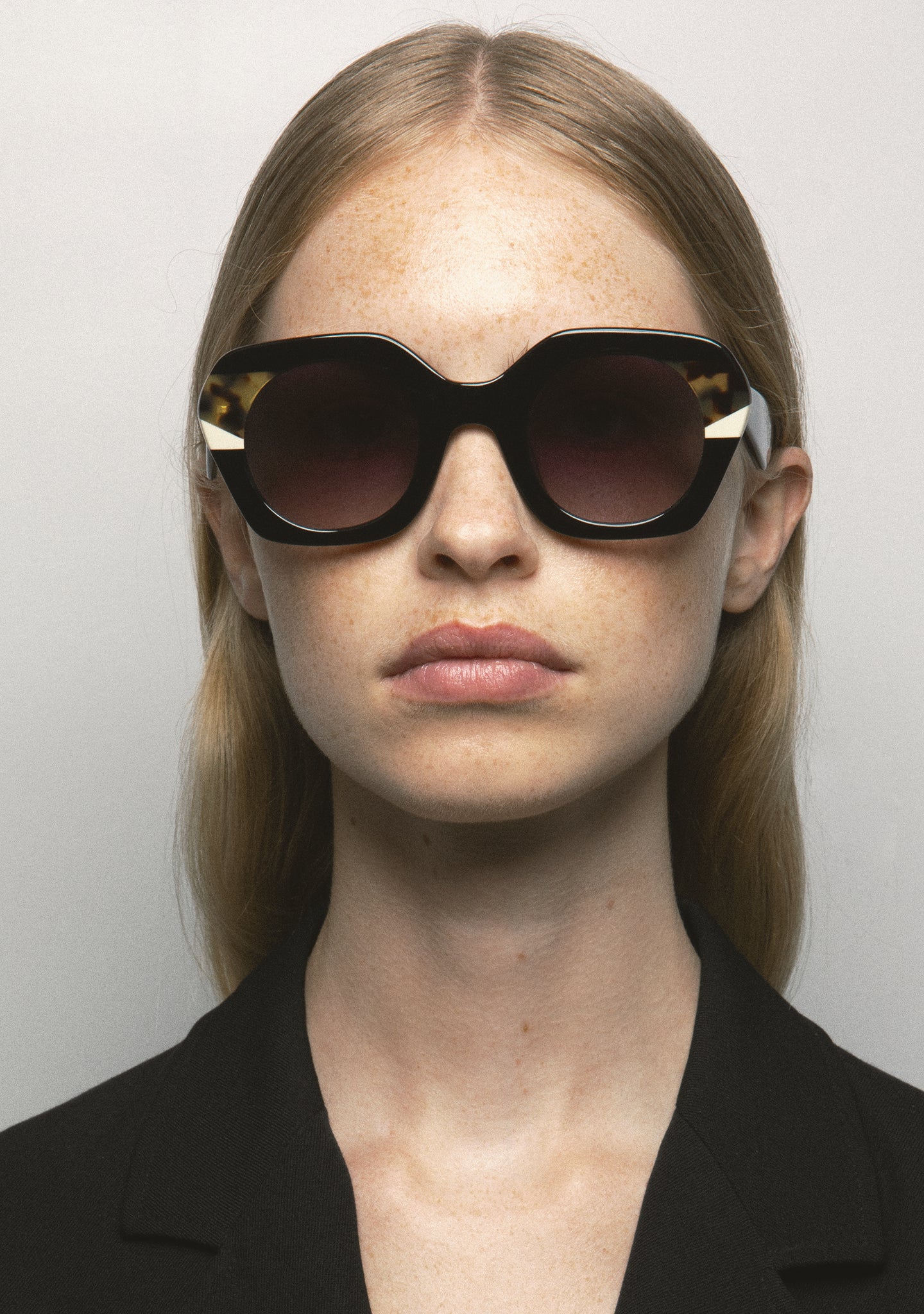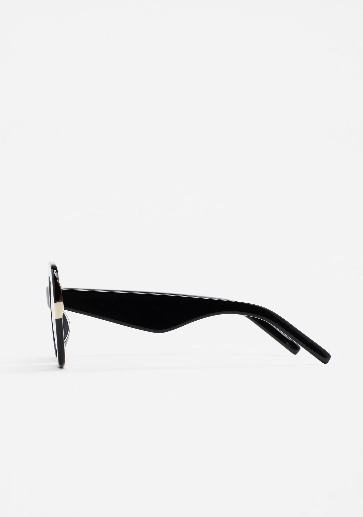 Hexagonal-shaped sunglasses. Black acetate front with double laminate in brown tortoiseshell and white. Black acetate temples. Black gradient 2-base lens with 100% UV protection and anti-reflective treatment. Category 3 lens. Built-in acetate nose pads. Handmade.