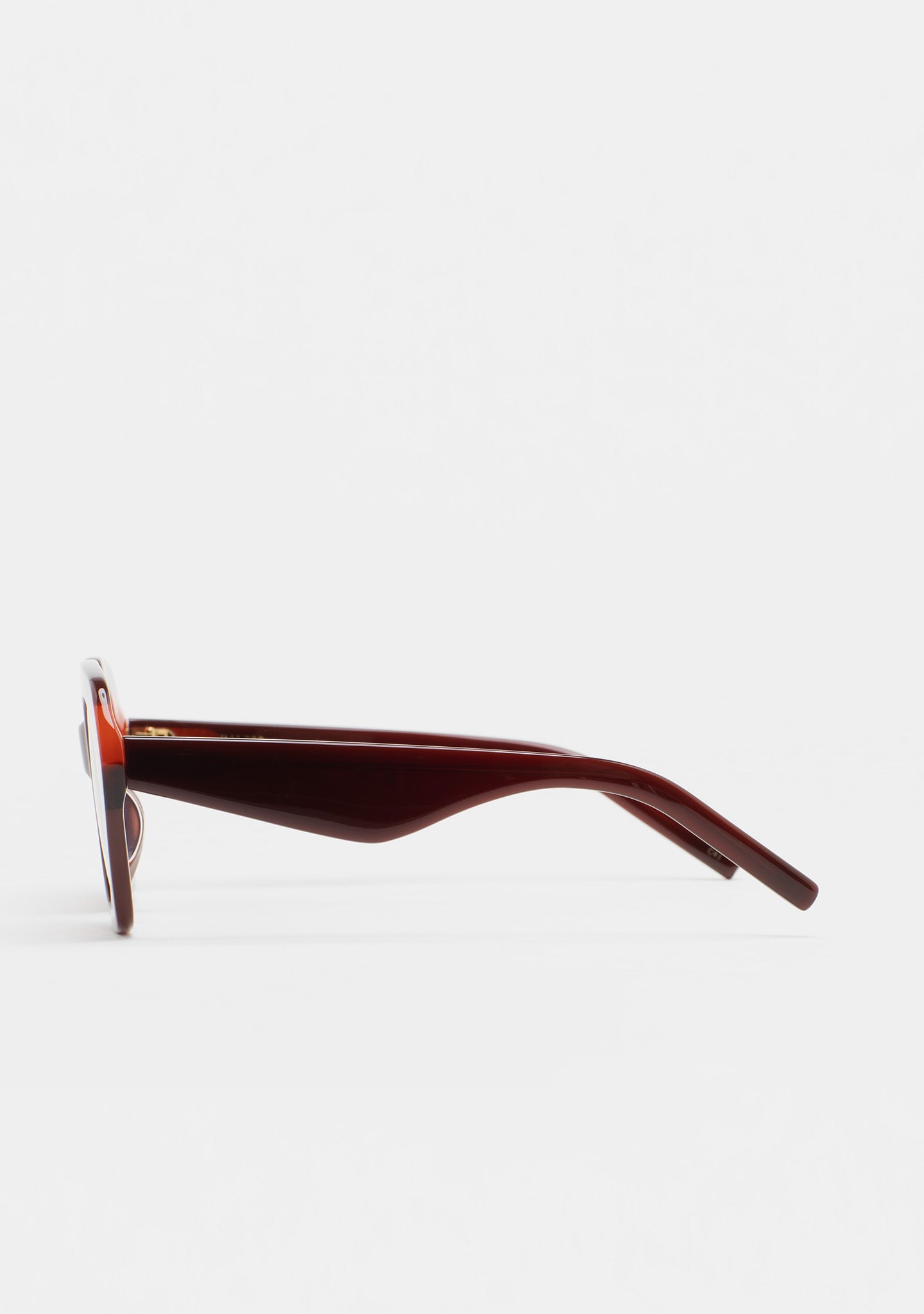 Hexagonal-shaped sunglasses. Black acetate front with double laminate in brown tortoiseshell and white. Black acetate temples. Black gradient 2-base lens with 100% UV protection and anti-reflective treatment. Category 3 lens. Built-in acetate nose pads. Handmade.
