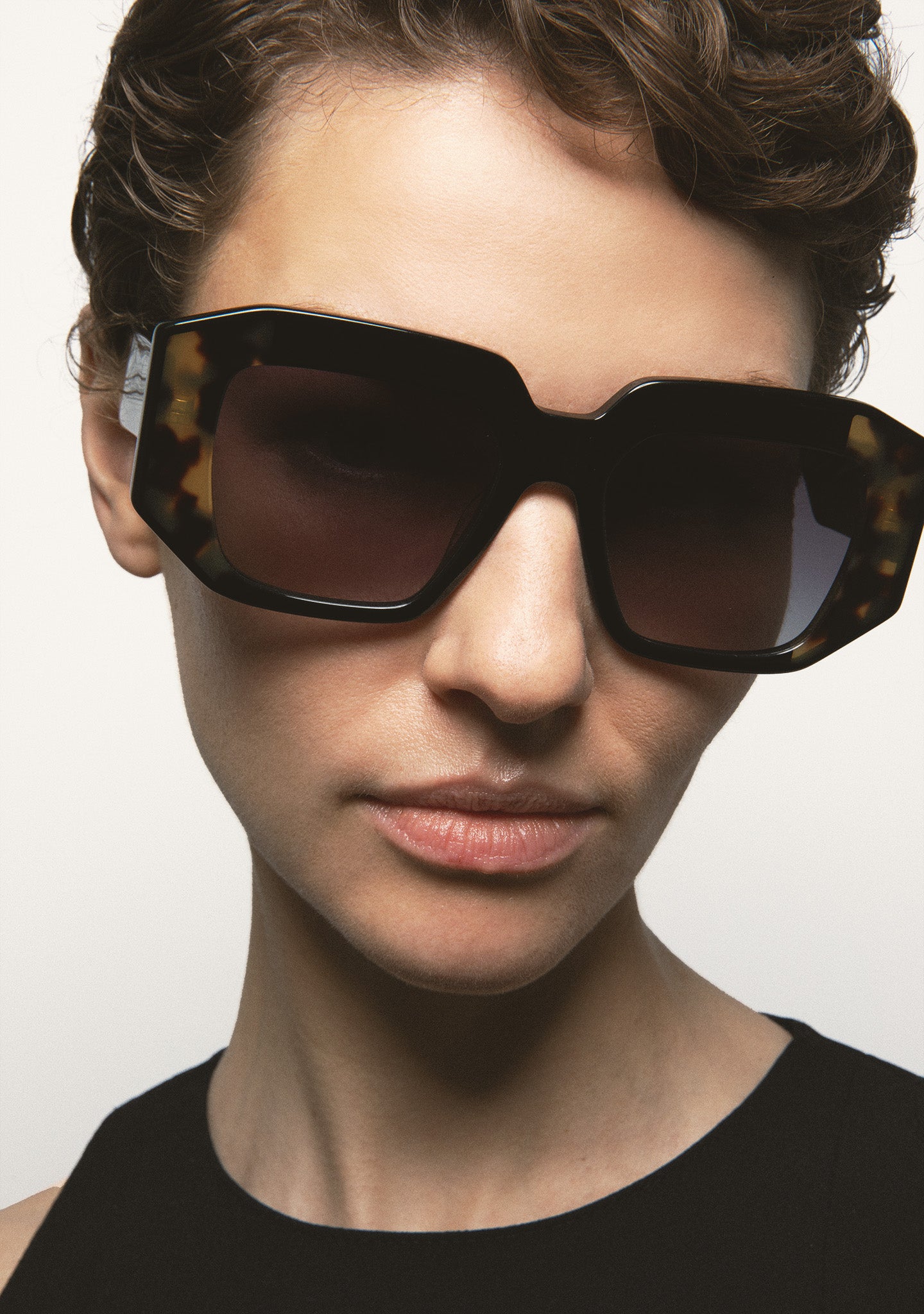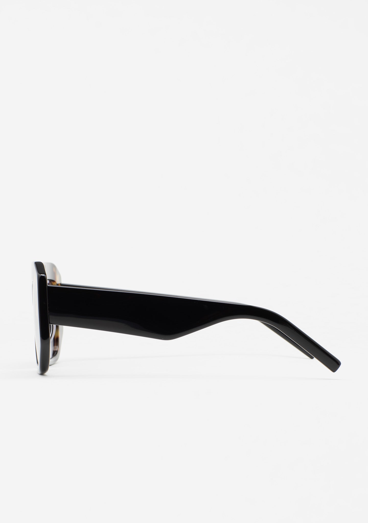 Rectangular-shaped sunglasses. Front of black acetate with Havana brown laminate. Black acetate temples. Black gradient lens, base 2, with 100% UV protection and anti-reflective coating. Lens Category 3. Acetate nose pads incorporated. Handmade.