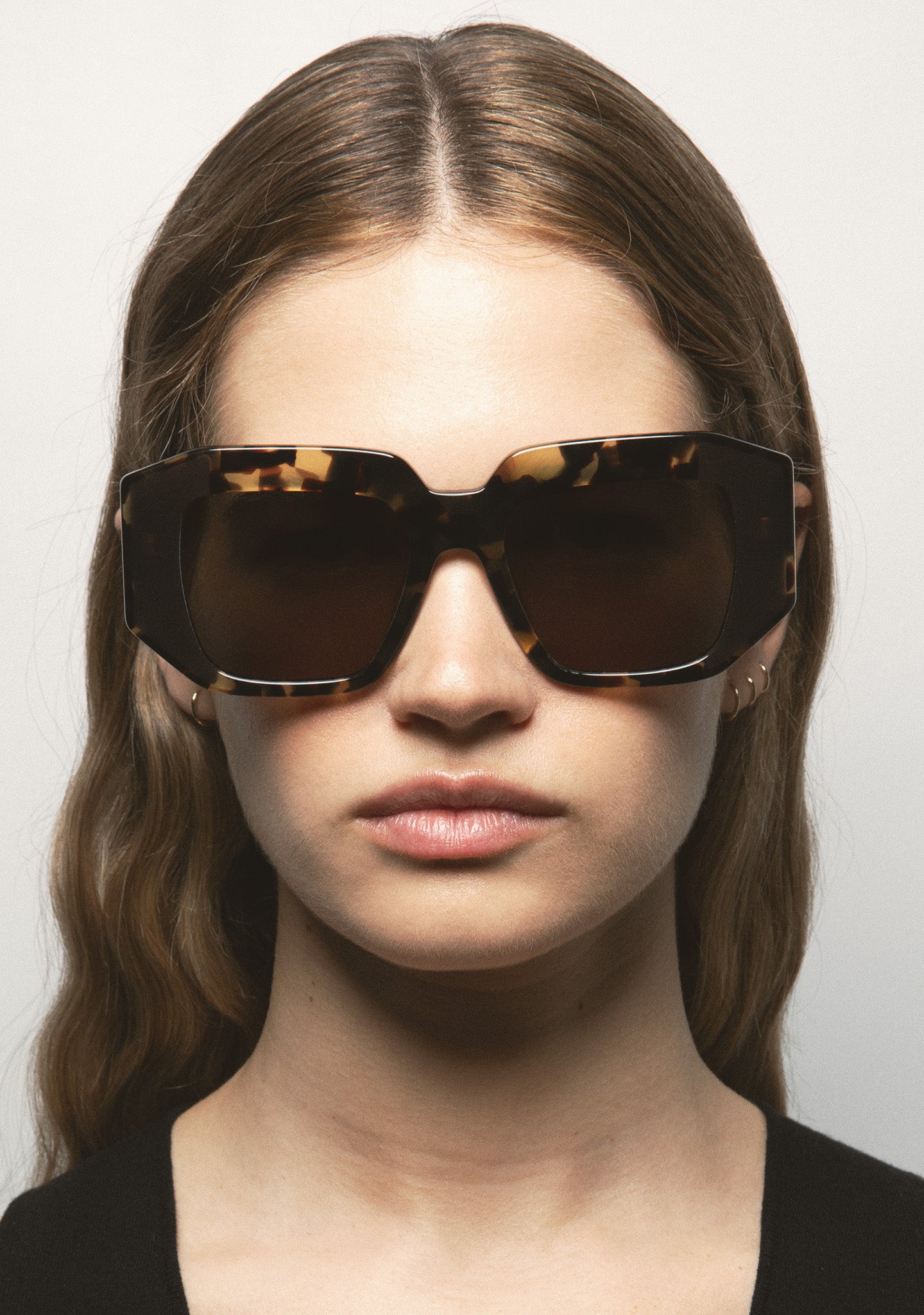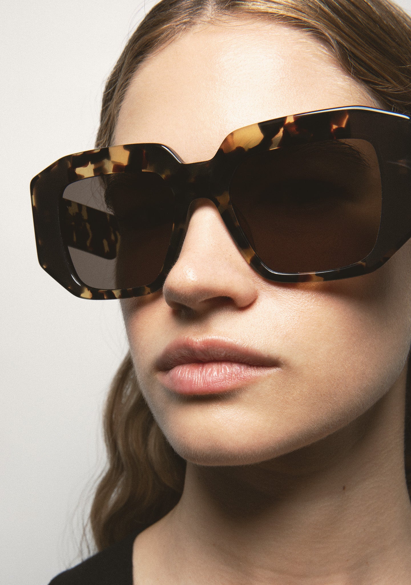 Rectangular-shaped sunglasses. Front of black acetate with Havana brown laminate. Black acetate temples. Black gradient lens, base 2, with 100% UV protection and anti-reflective coating. Lens Category 3. Acetate nose pads incorporated. Handmade.