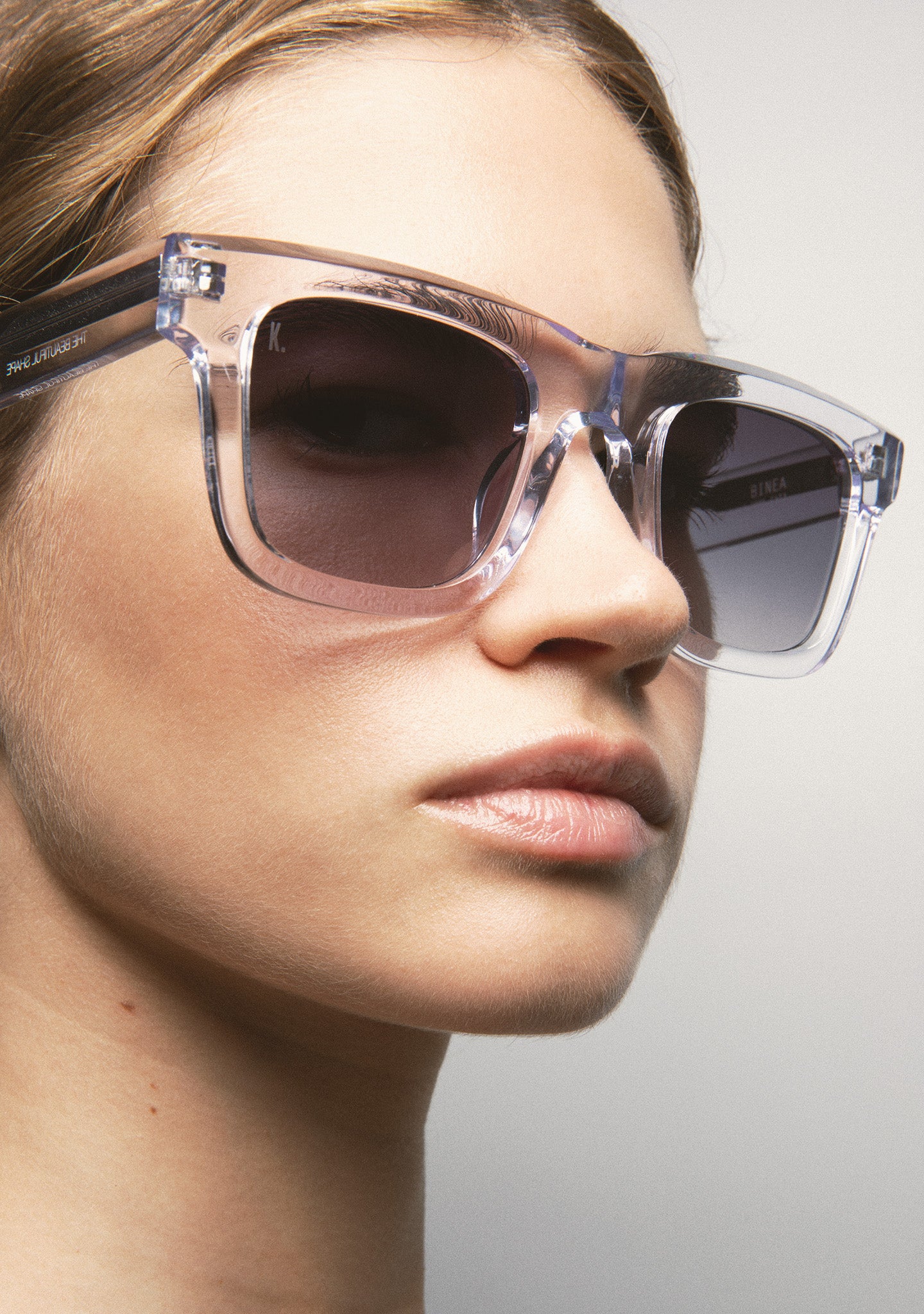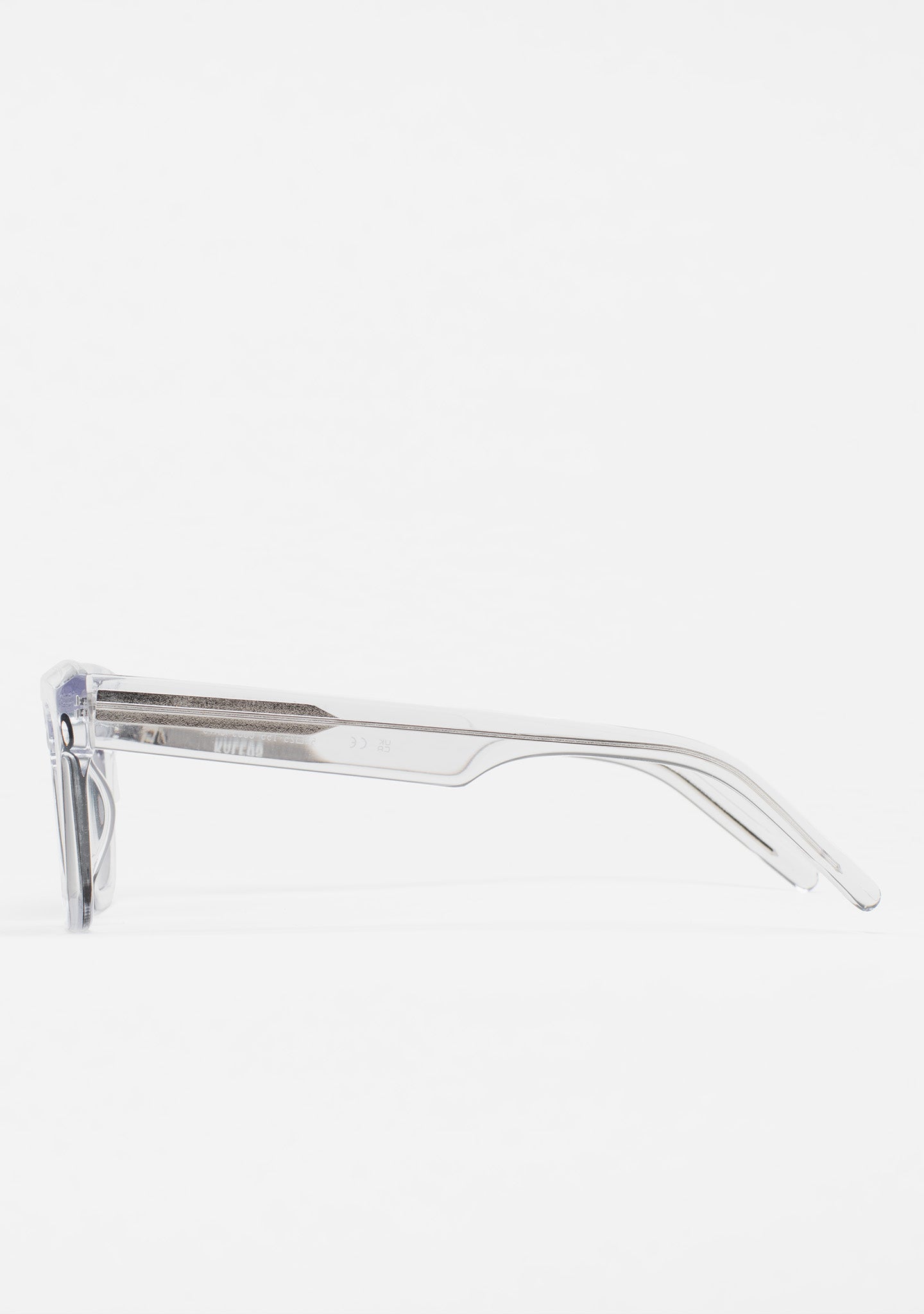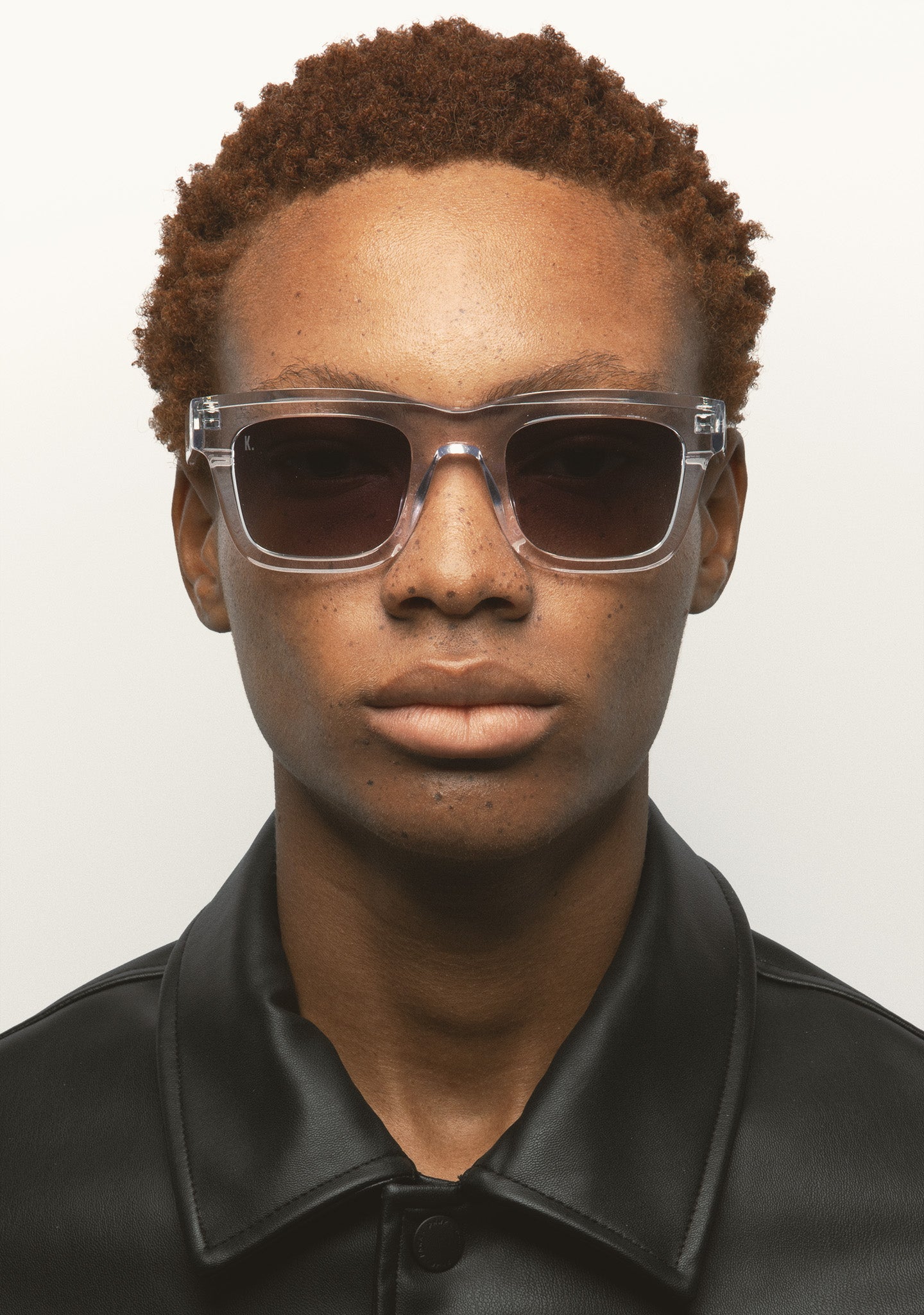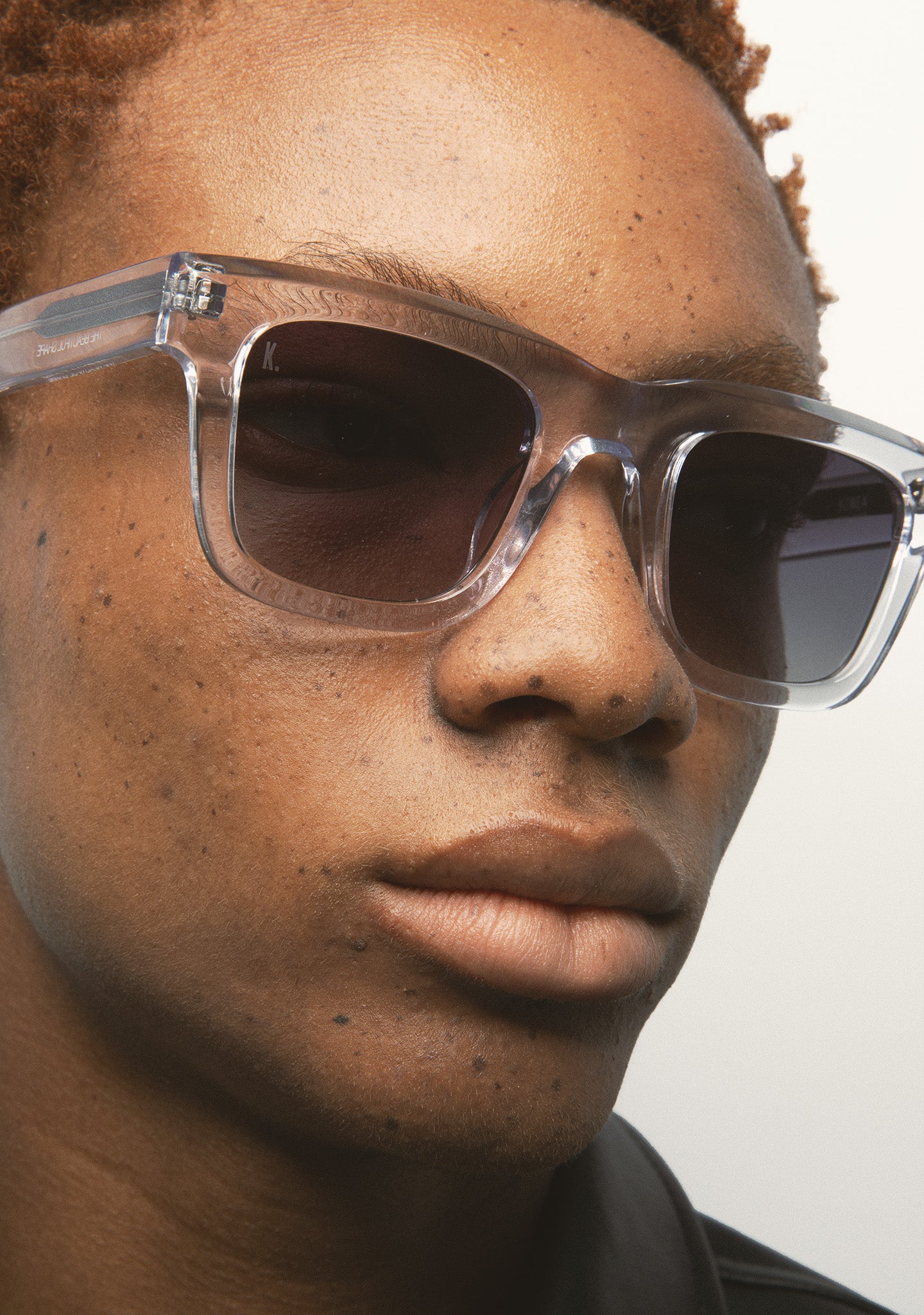 Square sunglasses with brow carving. Thick black acetate front with a carved upper section. Black acetate temples. Grey mineral lens (Barberini), base 2, with 100% UV protection and anti-reflective treatment. Category 3 lens. Integrated acetate nose pads. Handcrafted.