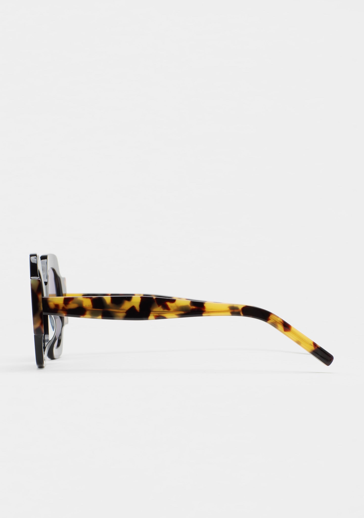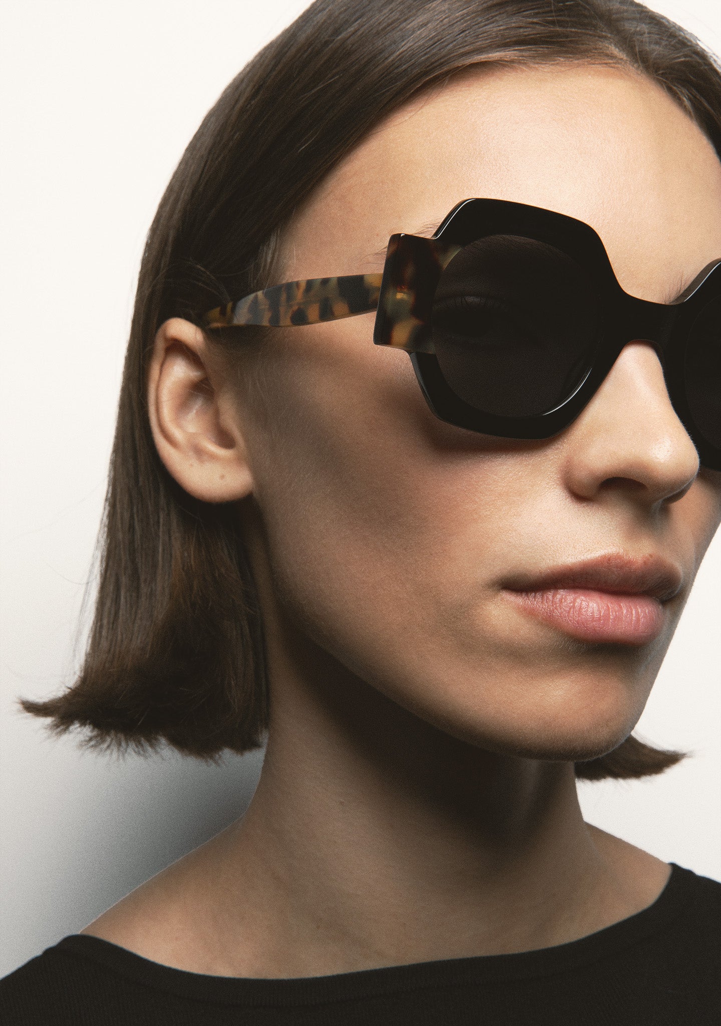 Square Sunglasses. Black acetate front with brown Havana laminate. Brown Havana acetate temples. Gray gradient lenses, base 2, with 100% UV protection and anti-reflective coating. Category 3 lenses. Integrated acetate nose pads. Handmade.