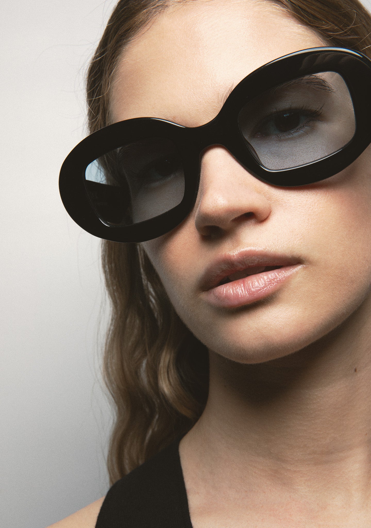 Oval-shaped sunglasses. Black acetate front and temples. Blue photochromic lens, base 2, with UV protection and anti-reflective treatment. Category 1-3 lens. Integrated acetate nose pads. Handmade.