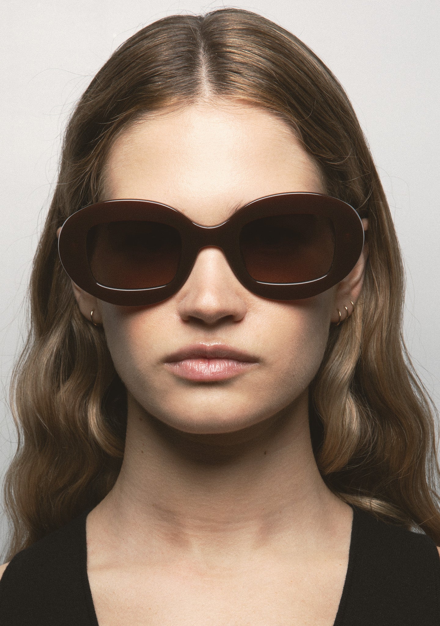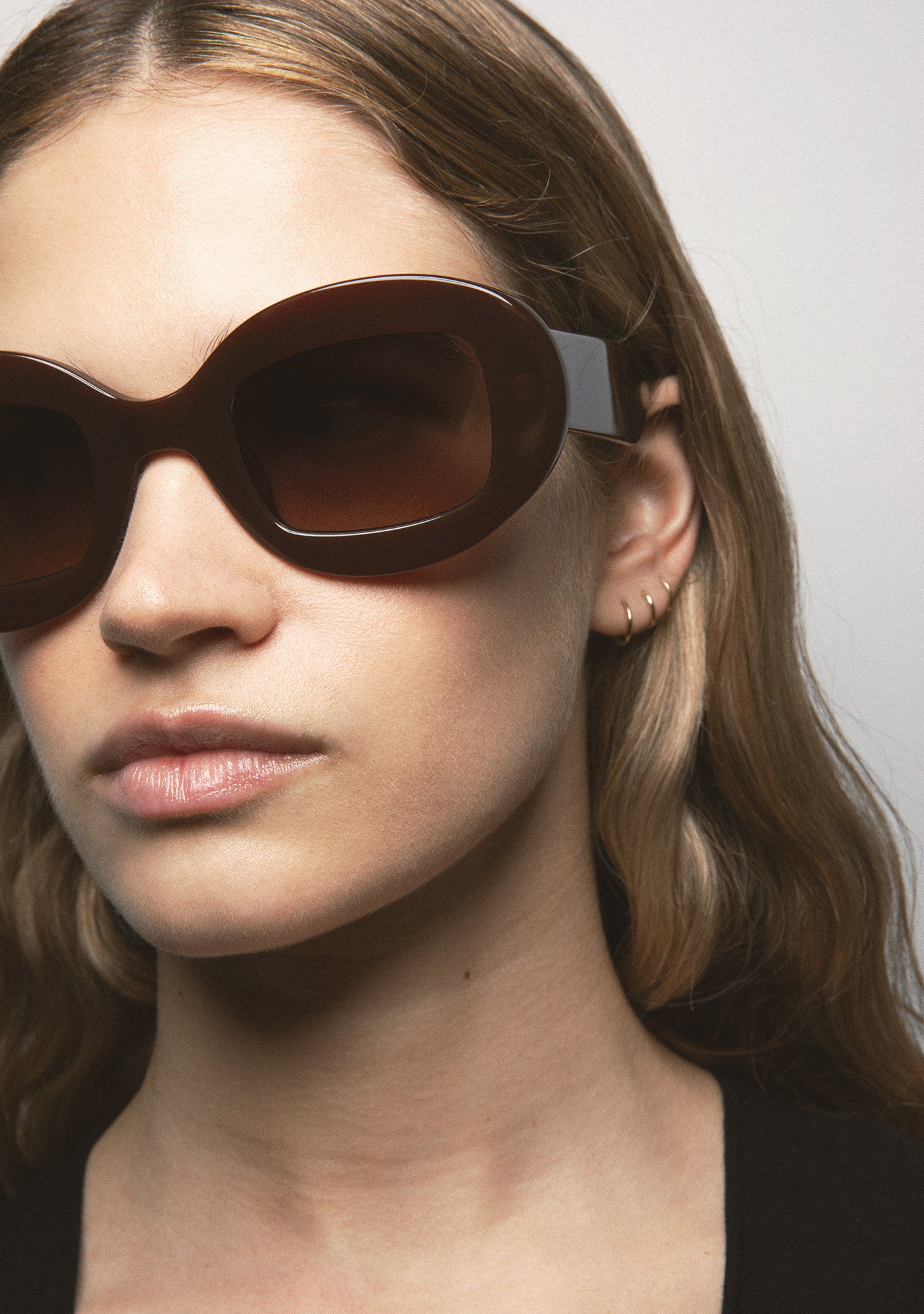 Oval-shaped sunglasses. Black acetate front and temples. Blue photochromic lens, base 2, with UV protection and anti-reflective treatment. Category 1-3 lens. Integrated acetate nose pads. Handmade.