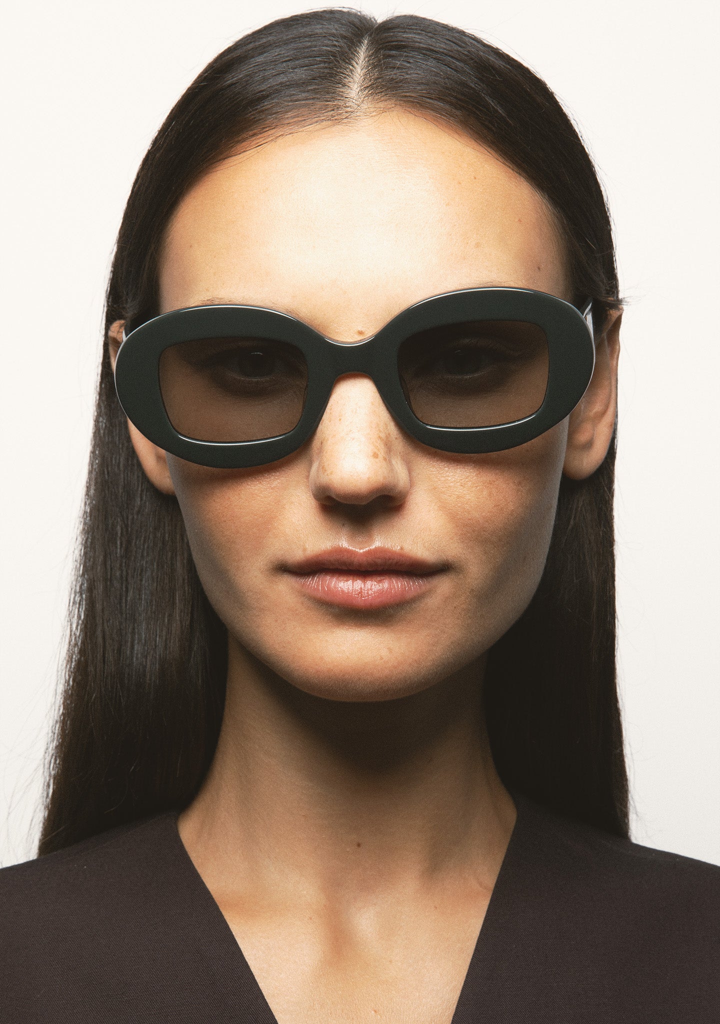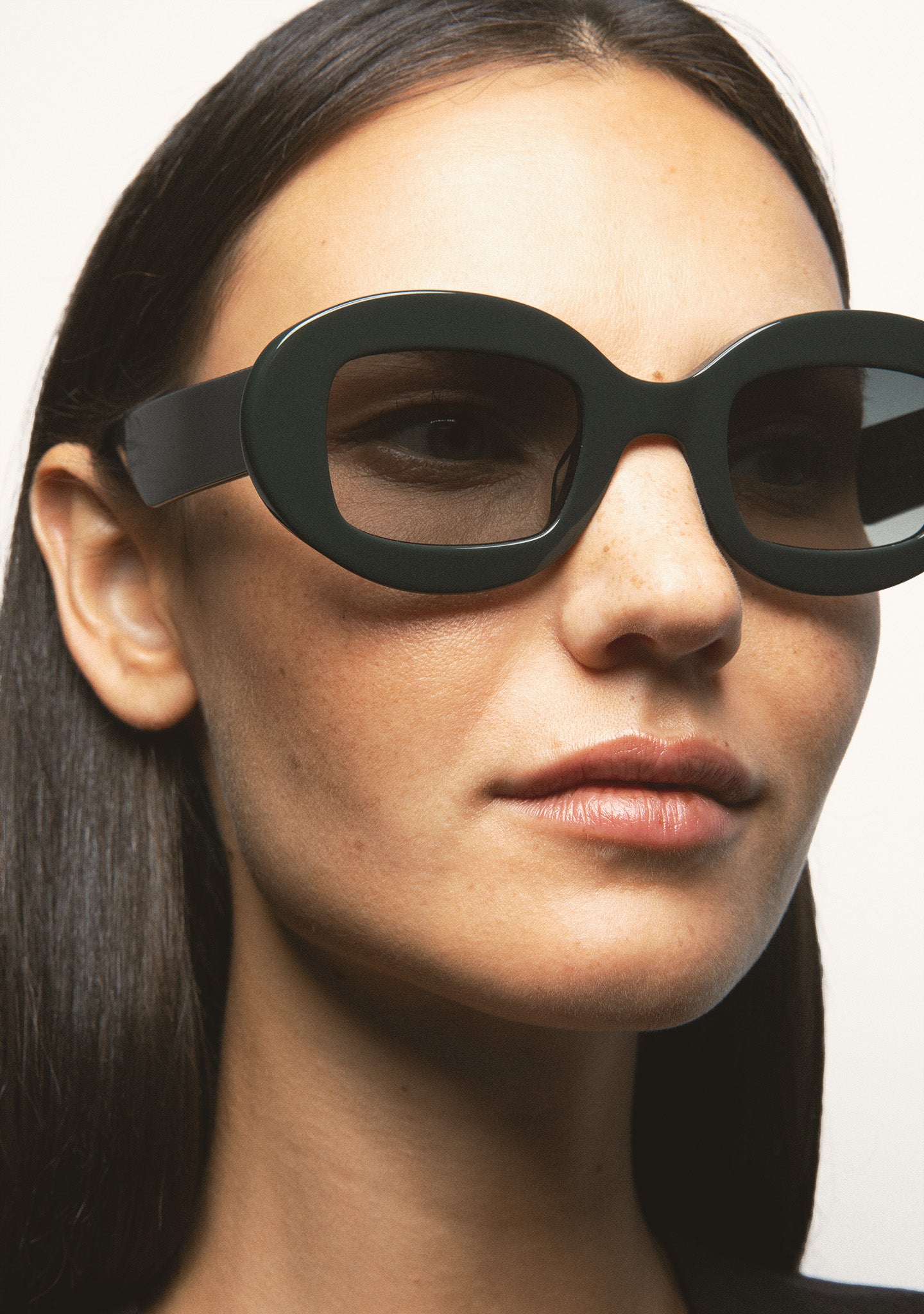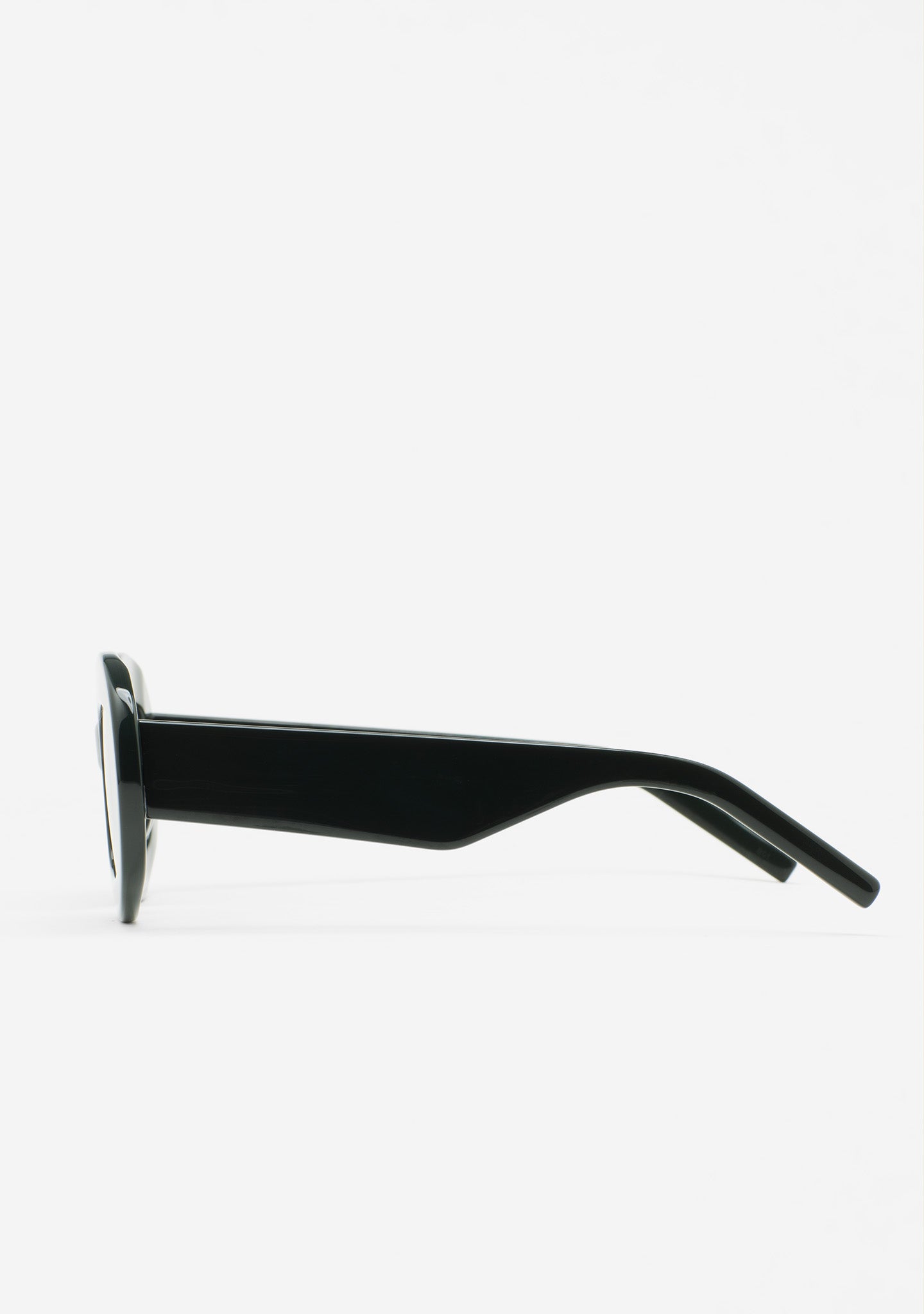 Oval-shaped sunglasses. Black acetate front and temples. Blue photochromic lens, base 2, with UV protection and anti-reflective treatment. Category 1-3 lens. Integrated acetate nose pads. Handmade.