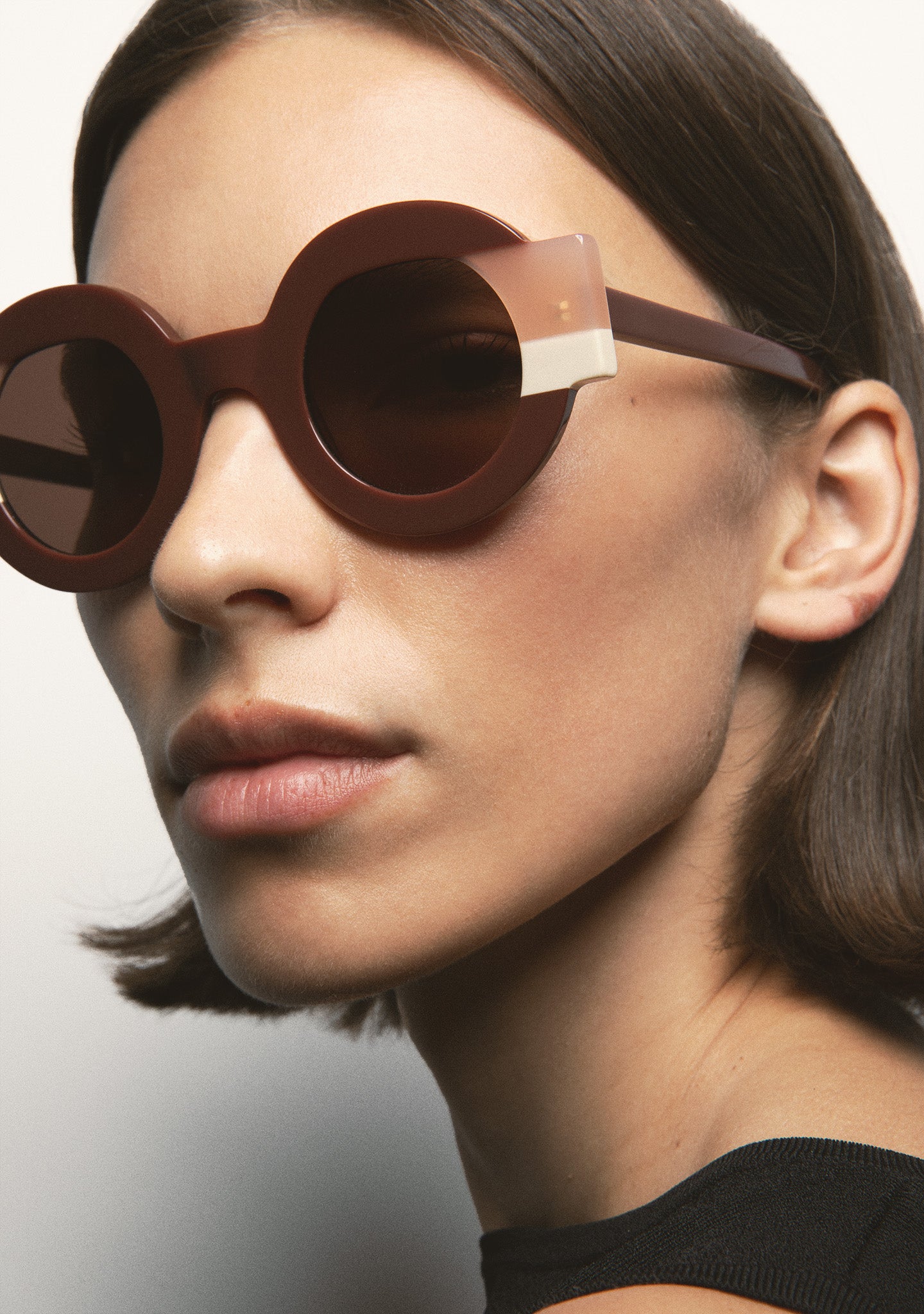 Round Sunglasses. Black acetate front with double Havana brown and beige laminates. Black gradient lenses with 100% UV protection and anti-reflective coating. Category 3 lenses. Integrated acetate nose pads. Handmade.