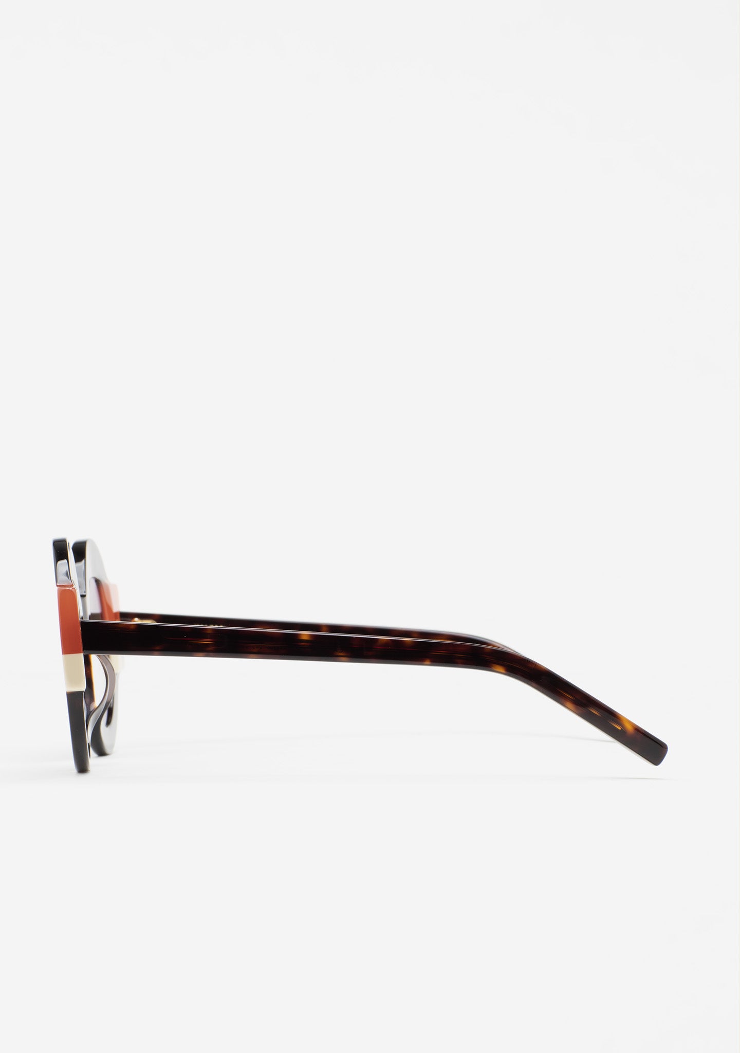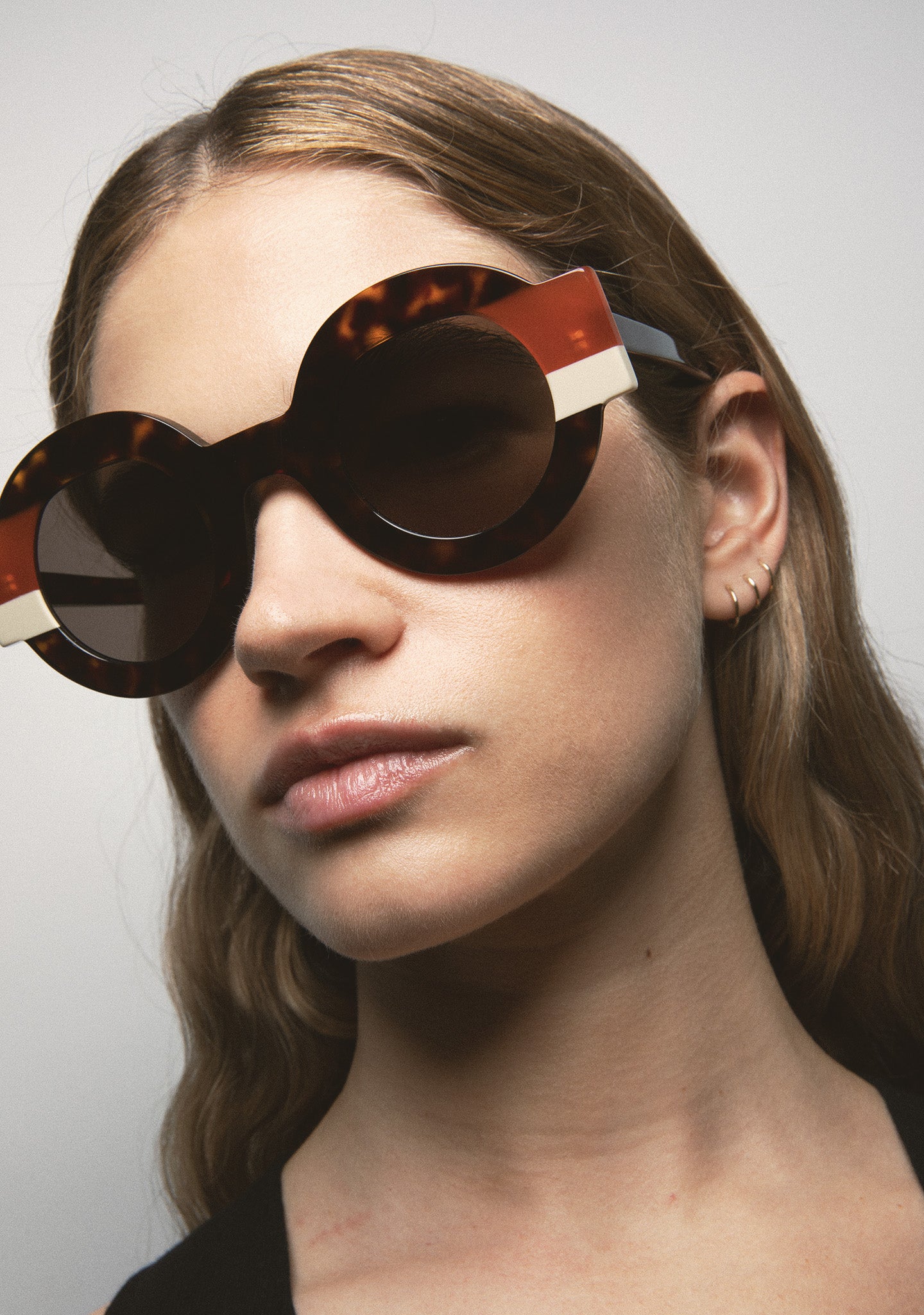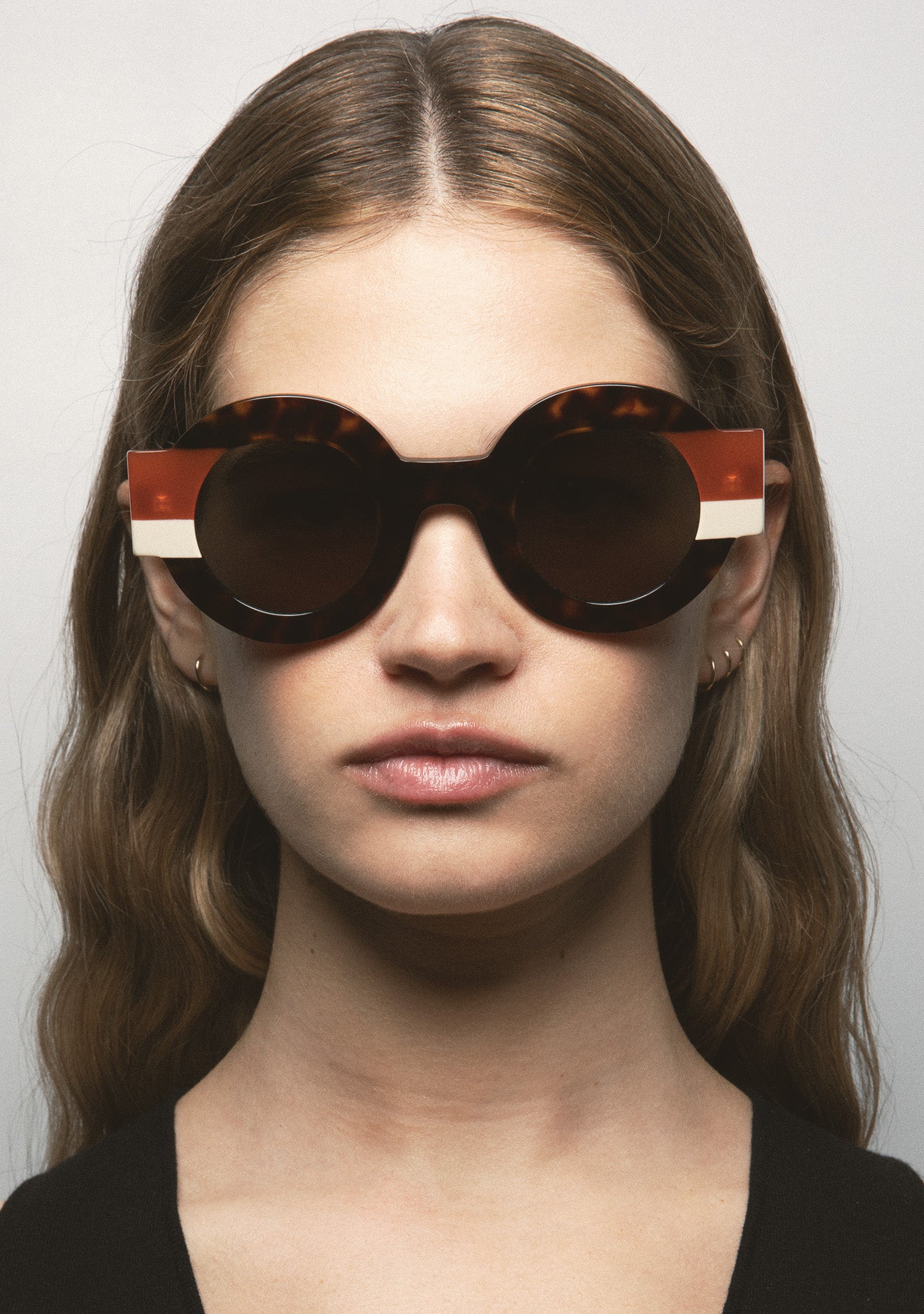 Round Sunglasses. Black acetate front with double Havana brown and beige laminates. Black gradient lenses with 100% UV protection and anti-reflective coating. Category 3 lenses. Integrated acetate nose pads. Handmade.