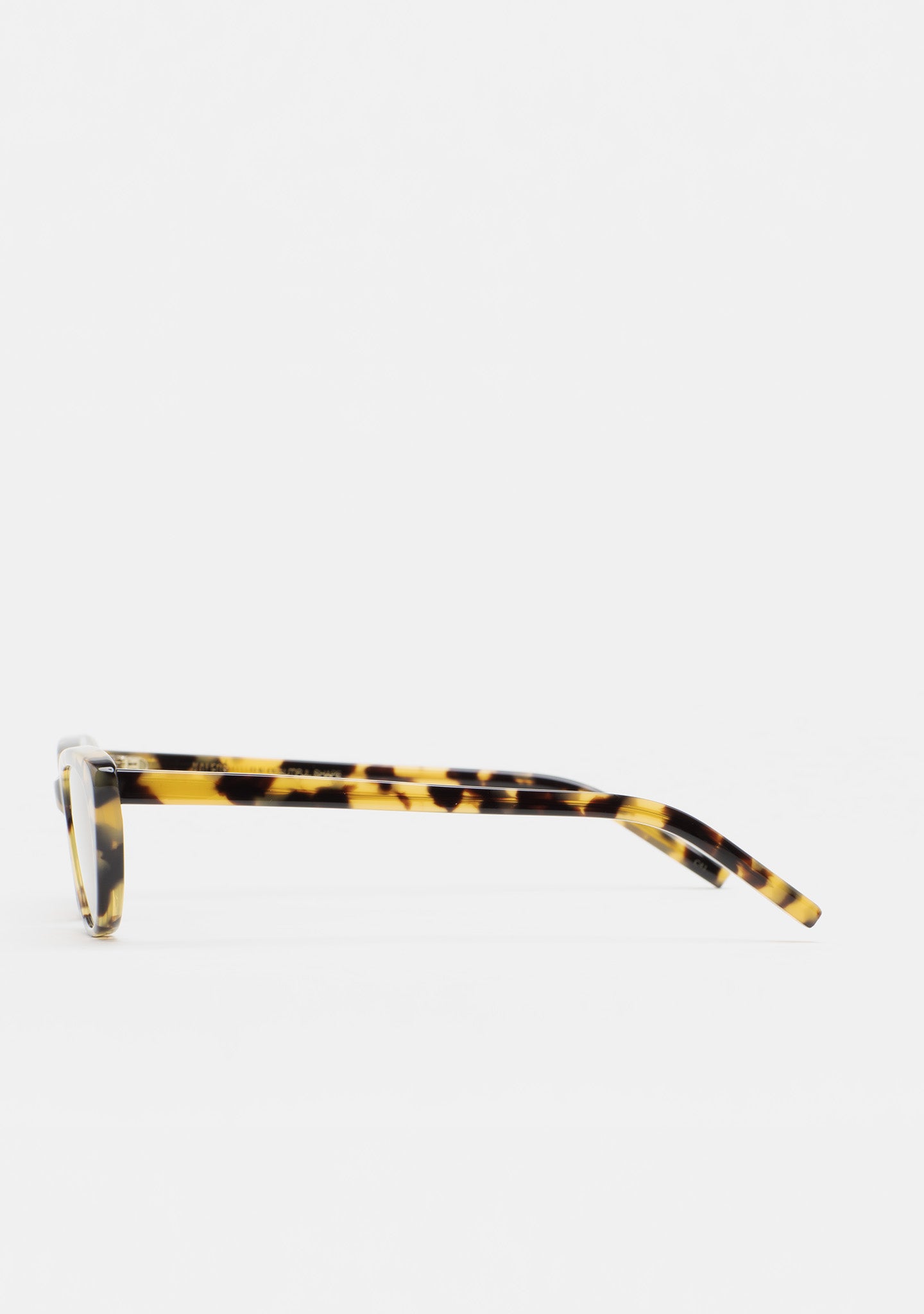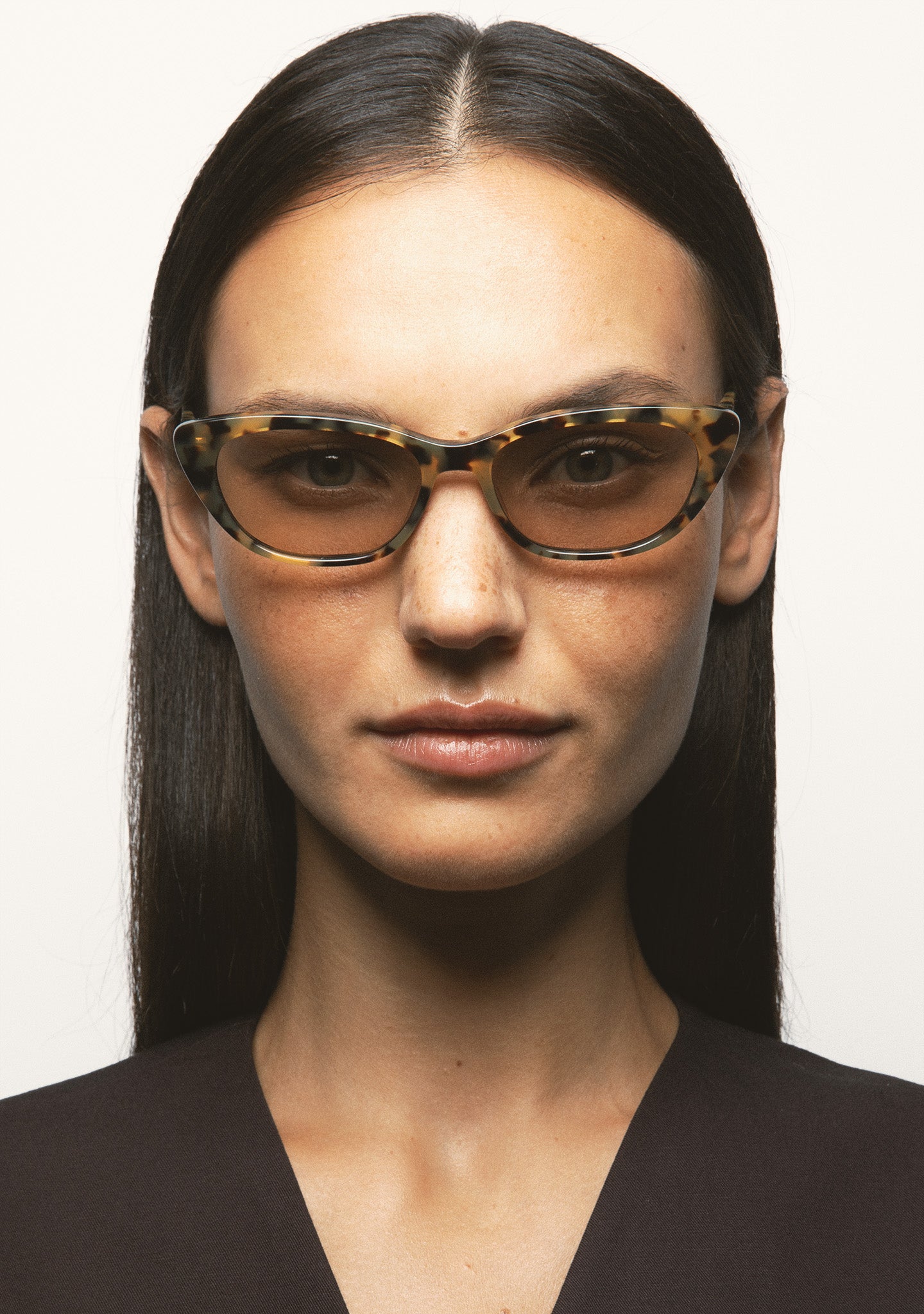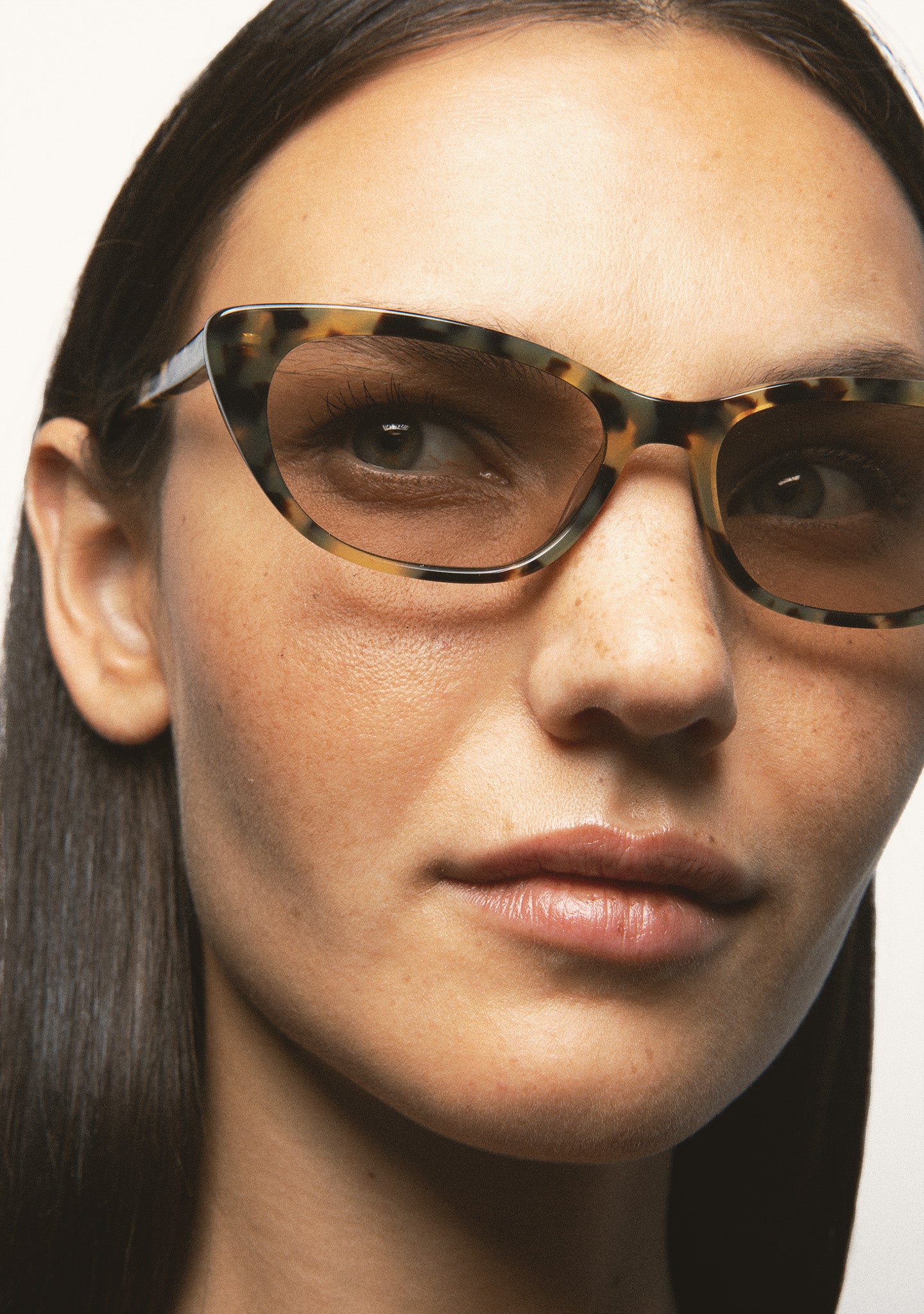 Cat-eye shaped sunglasses. Havana brown acetate front and temples. Brown photochromic lens, base 2, with UV protection and anti-reflective treatment. Category 1-3 lens. Integrated acetate nose pads. Handmade.
