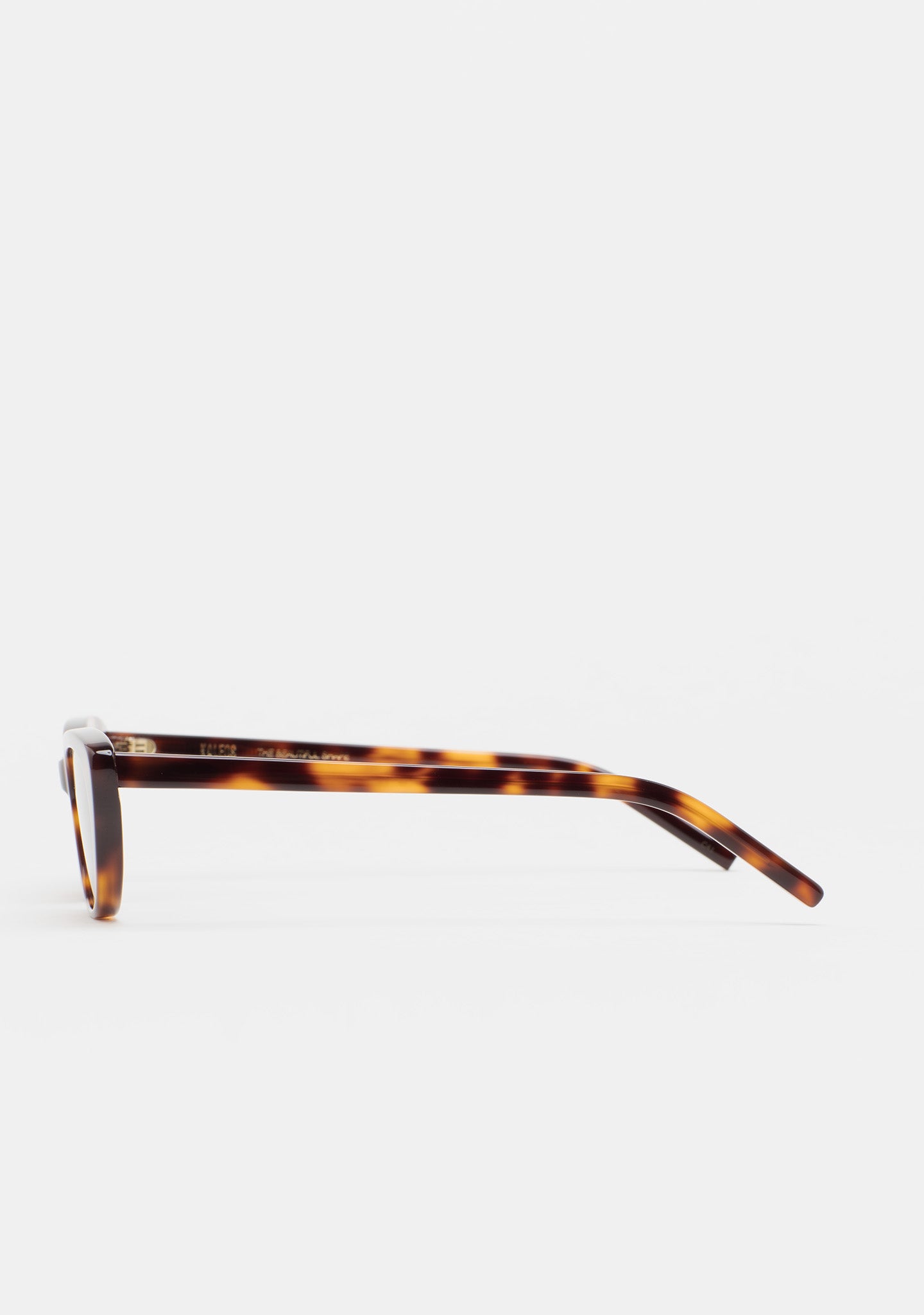 Cat-eye shaped sunglasses. Havana brown acetate front and temples. Brown photochromic lens, base 2, with UV protection and anti-reflective treatment. Category 1-3 lens. Integrated acetate nose pads. Handmade.