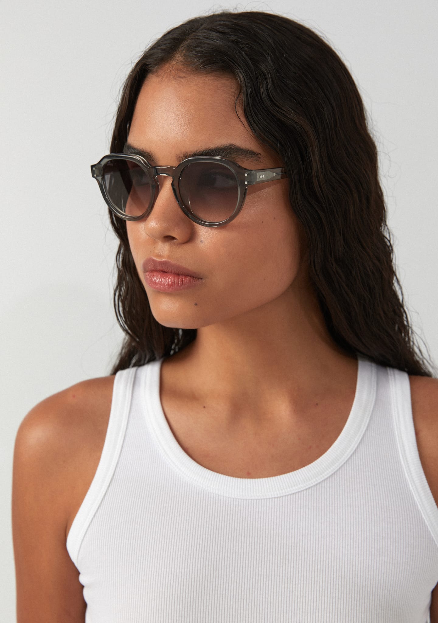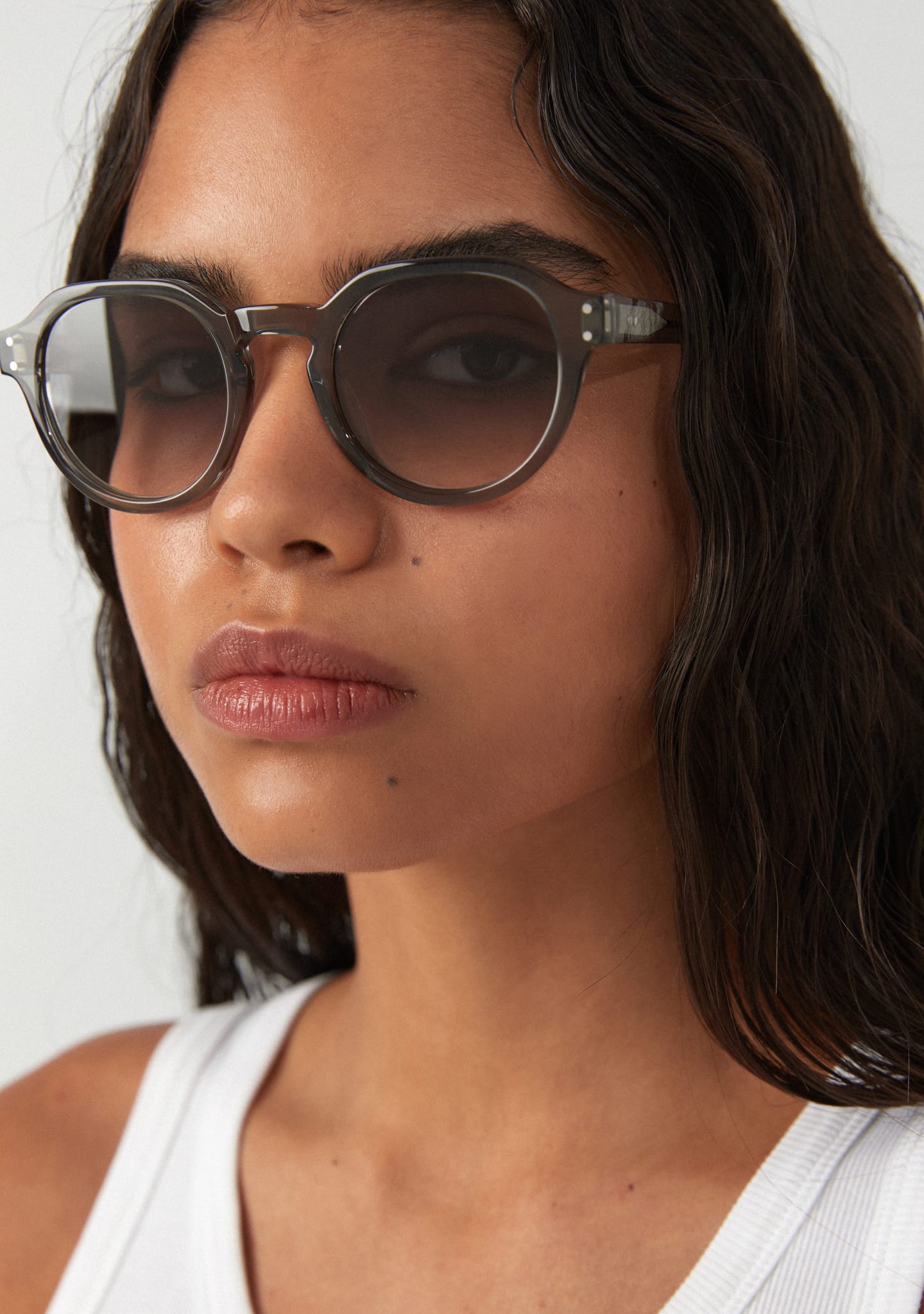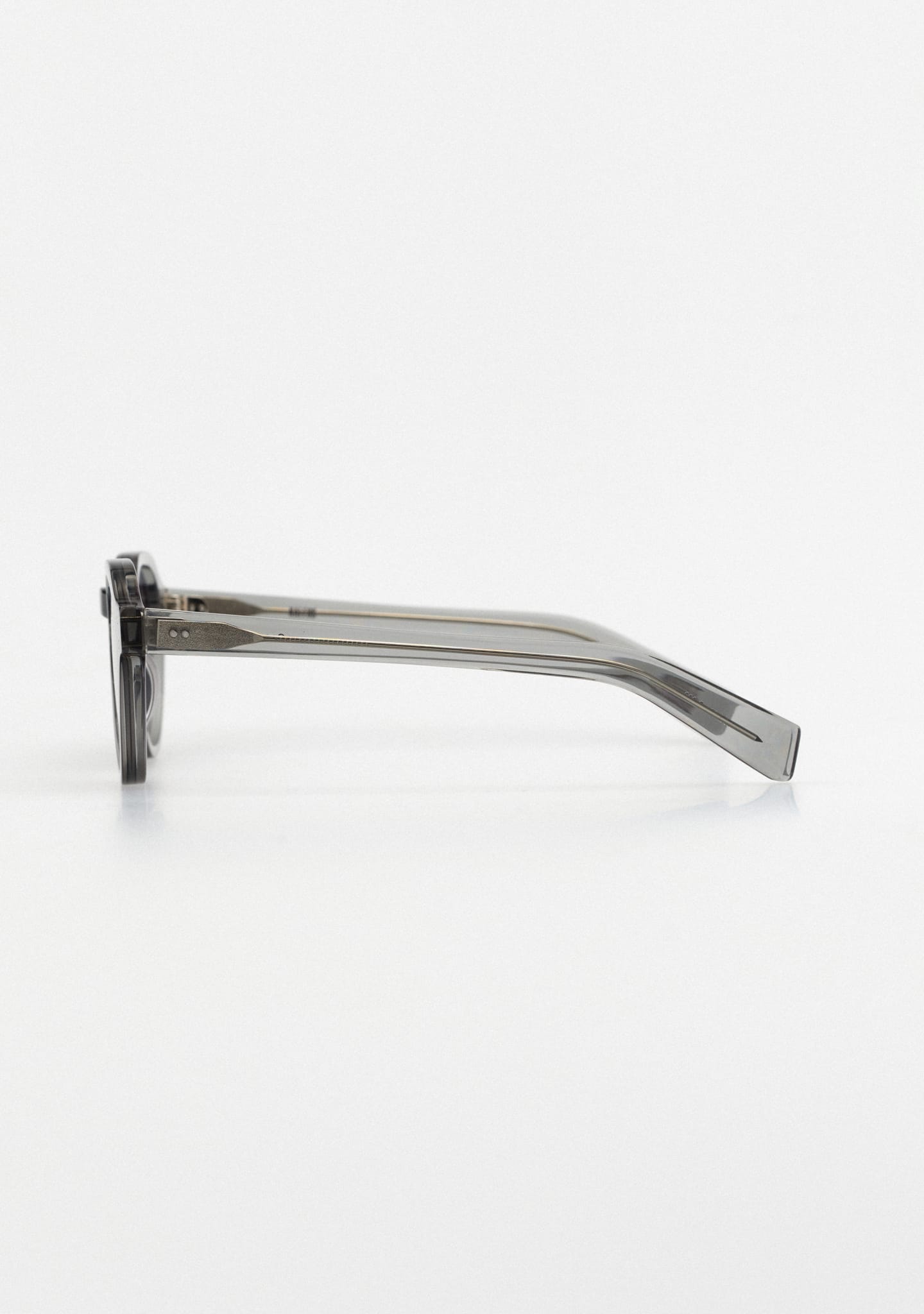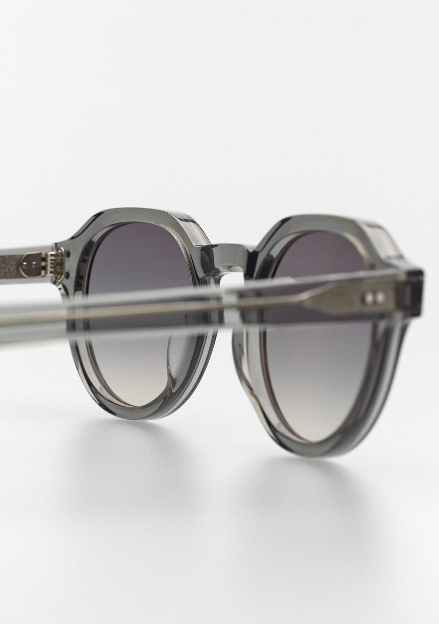 Sunglasses in monochrome thick grey crystal acetate. Panto shape with keyhole bridge and flat top bar. Hinges with rivets on the end pieces and arms. Acetate arms. Grey gradient tint 2-base lenses with 100% UV protection and anti-reflective treatment. Built-in acetate nose pads. Handmade.