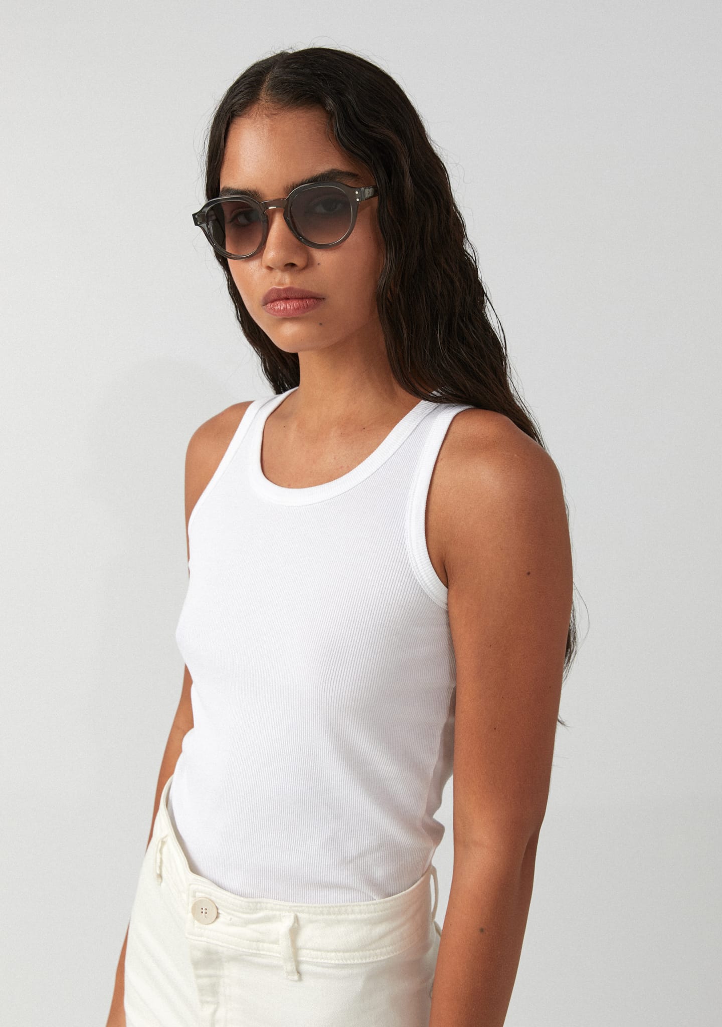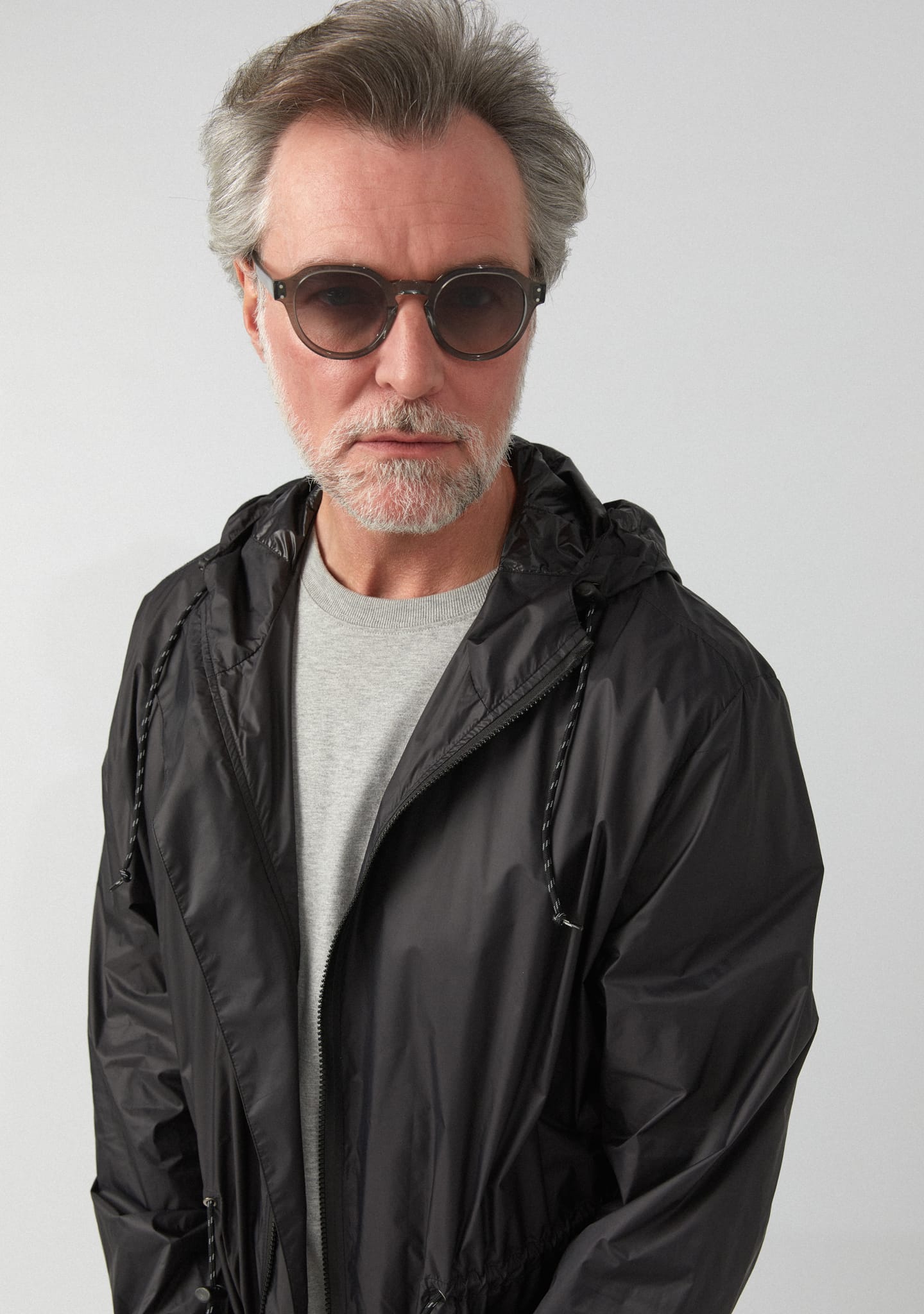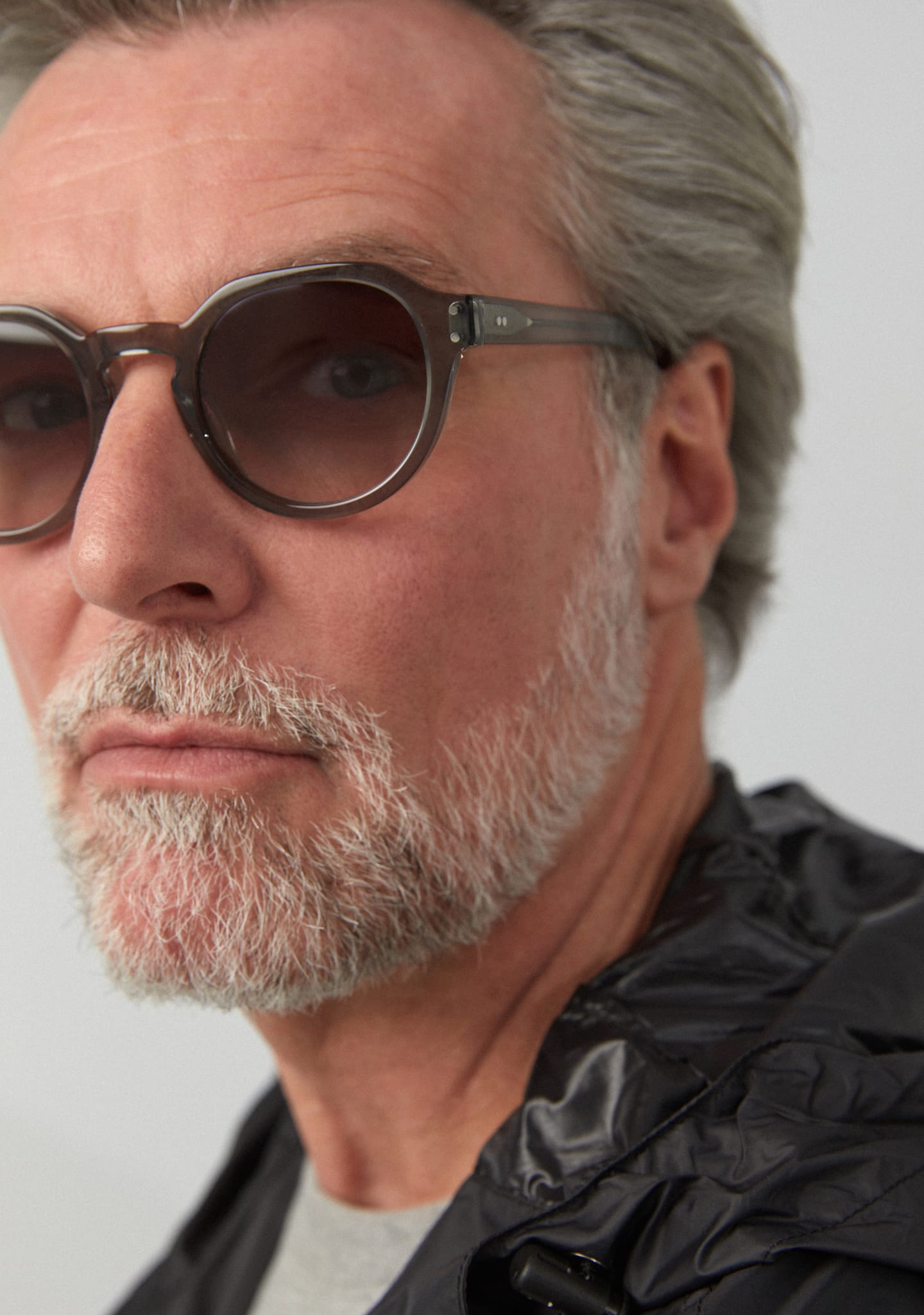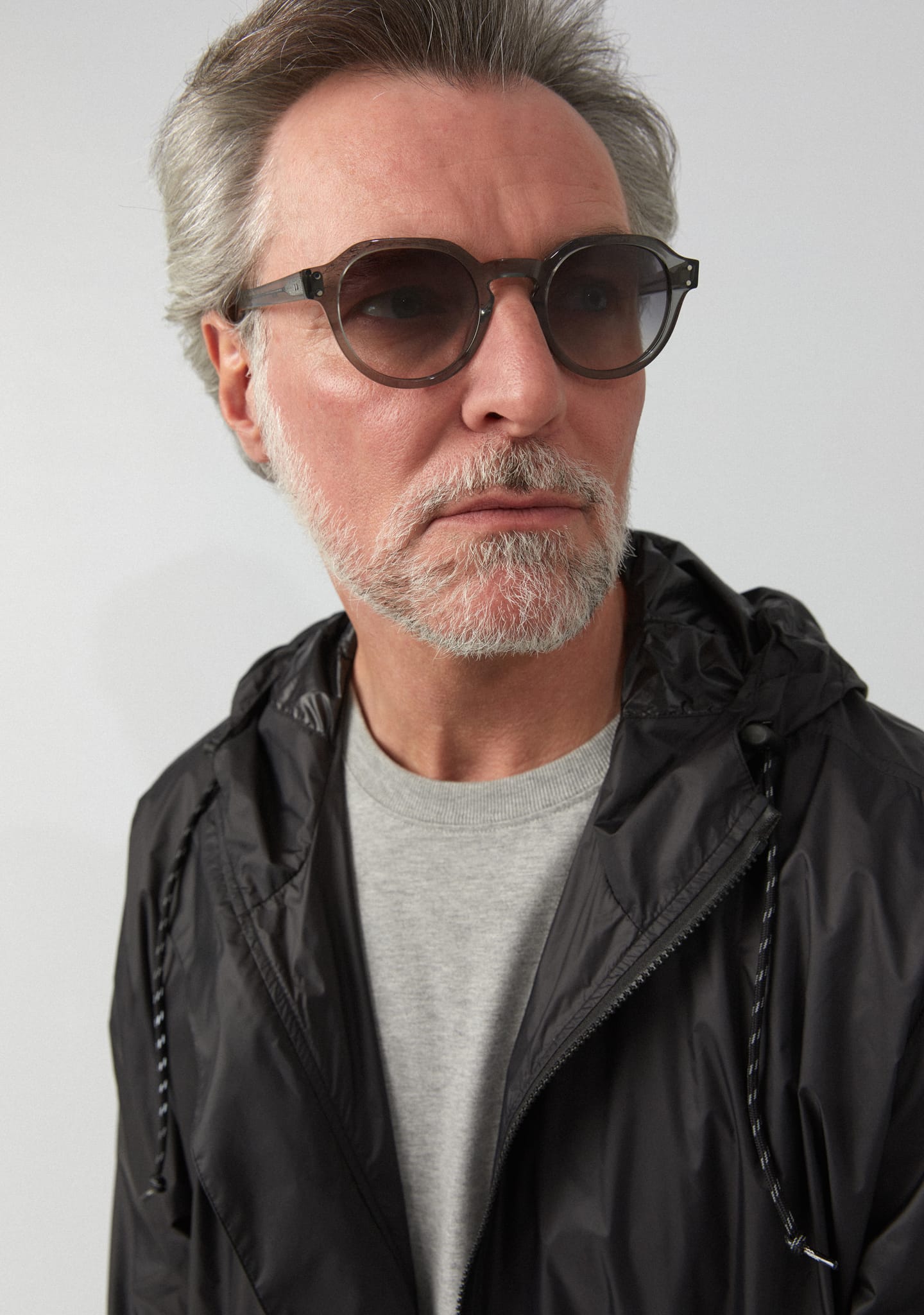 Sunglasses in monochrome thick grey crystal acetate. Panto shape with keyhole bridge and flat top bar. Hinges with rivets on the end pieces and arms. Acetate arms. Grey gradient tint 2-base lenses with 100% UV protection and anti-reflective treatment. Built-in acetate nose pads. Handmade.