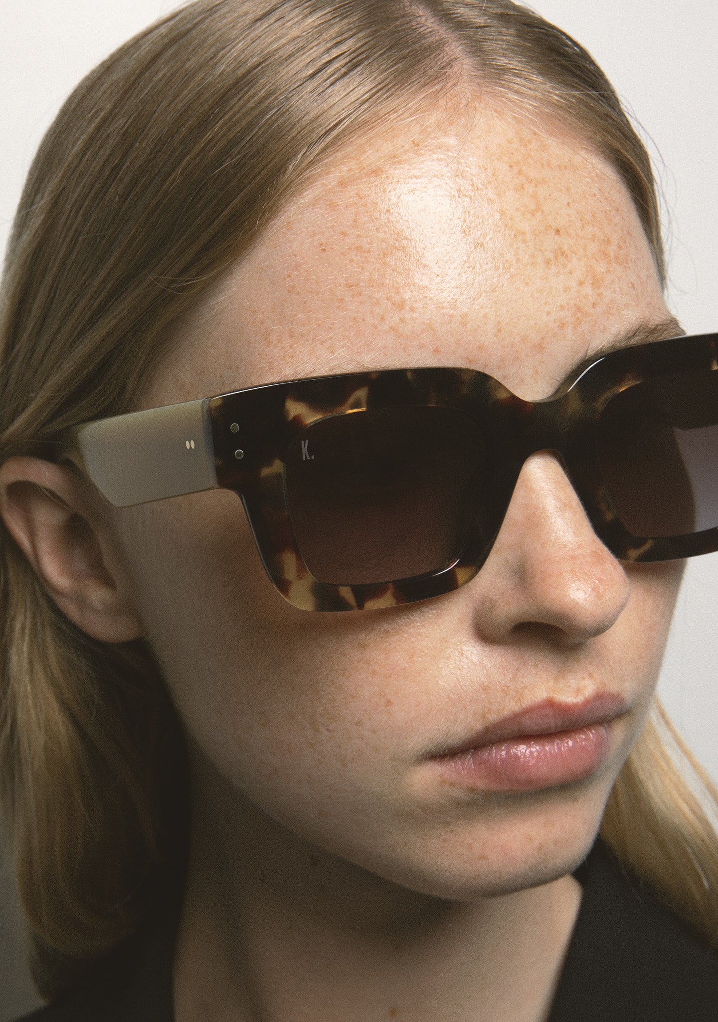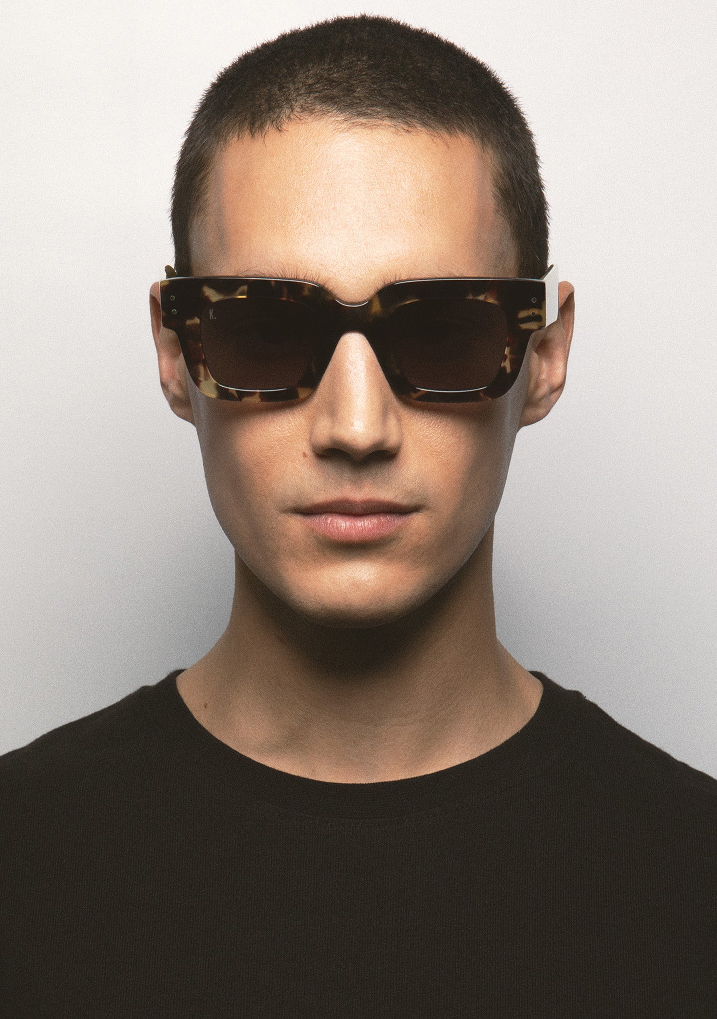 Rectangular-shaped sunglasses. Black acetate front and temples. Gold rivet hinges on the corners and temples. Green photochromic 2-base lens with UV protection and anti-reflective treatment. Category 1-3 lenses. Built-in acetate nose pads. Handmade.