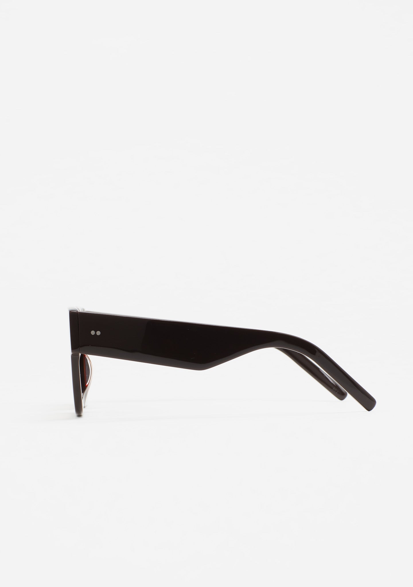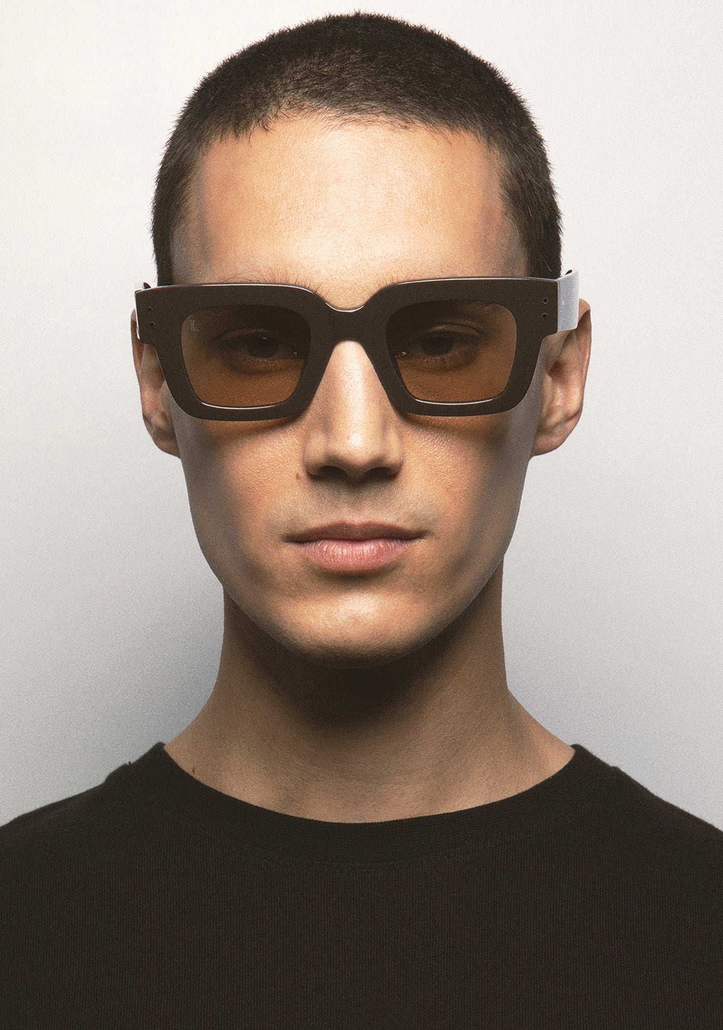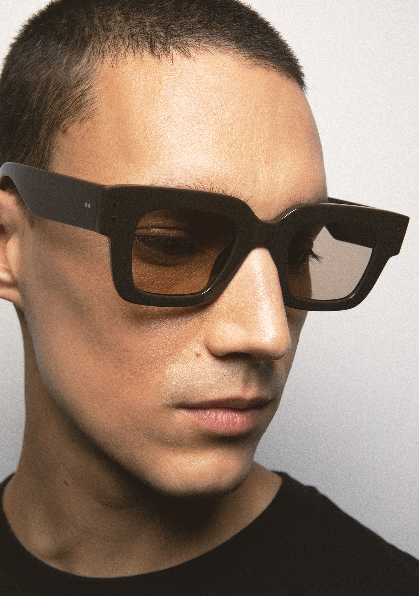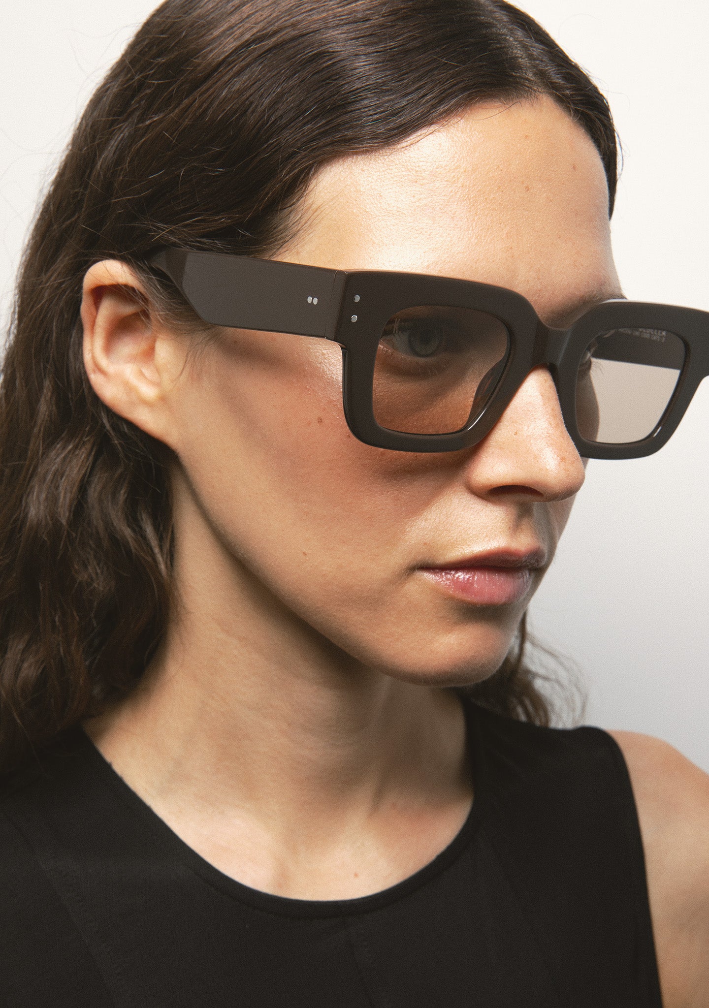 Rectangular-shaped sunglasses. Black acetate front and temples. Gold rivet hinges on the corners and temples. Green photochromic 2-base lens with UV protection and anti-reflective treatment. Category 1-3 lenses. Built-in acetate nose pads. Handmade.