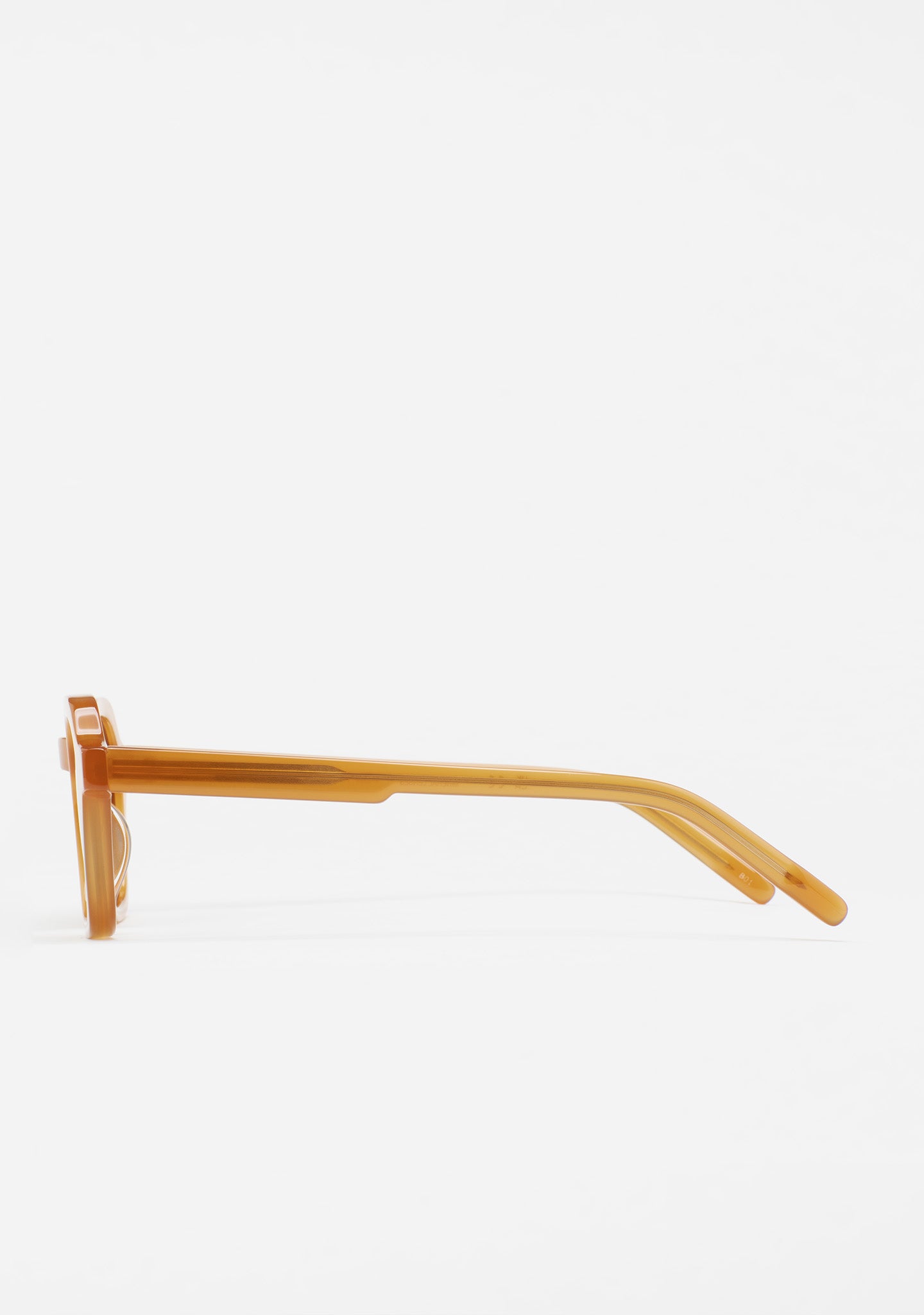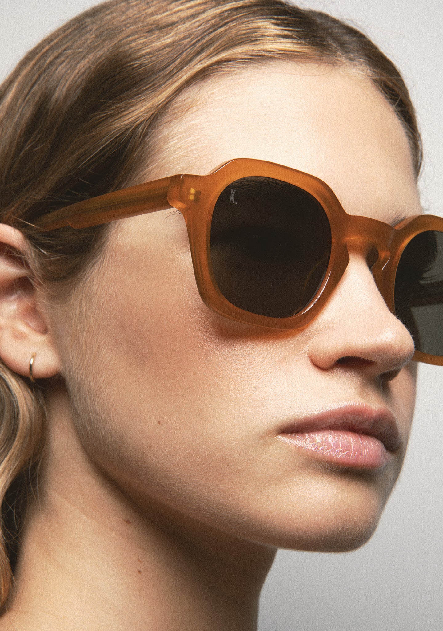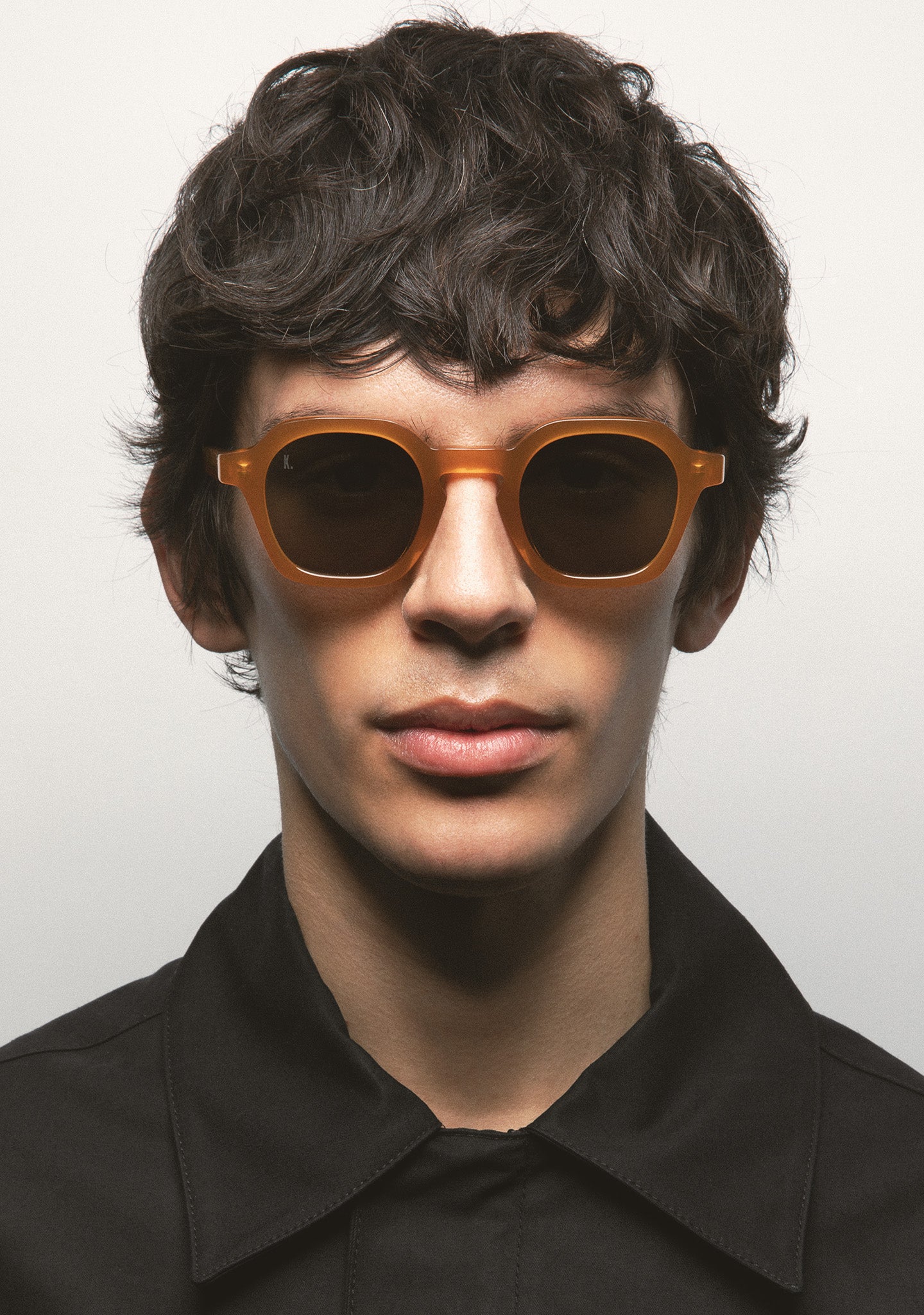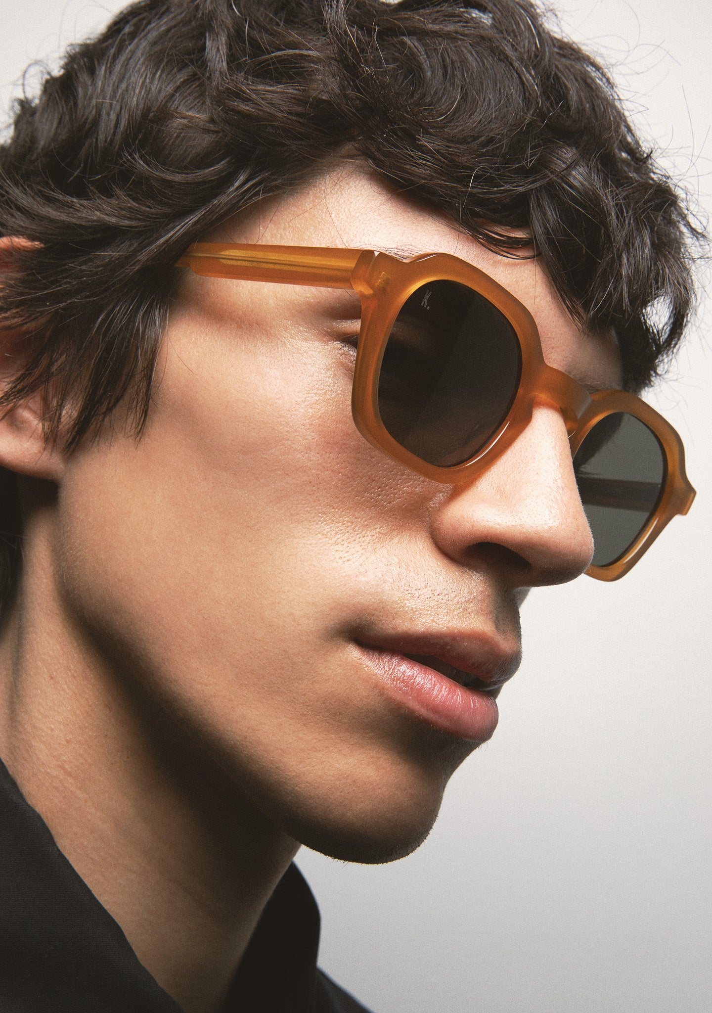 Square sunglasses with keyhole bridge. Black acetate frame and temples. Photochromic blue lens, base 2, with UV protection and anti-reflective treatment. Category 1-3 lens. Integrated acetate nose pads. Handcrafted.