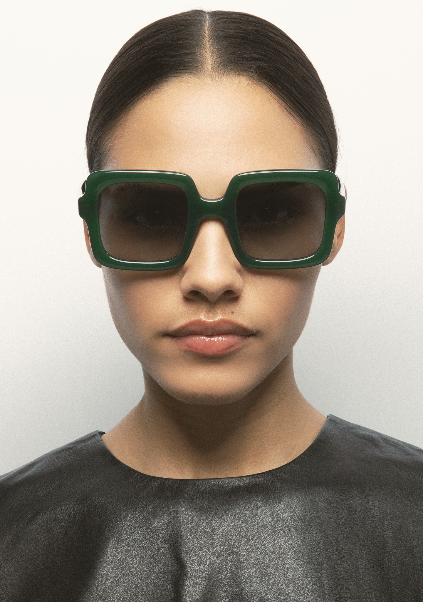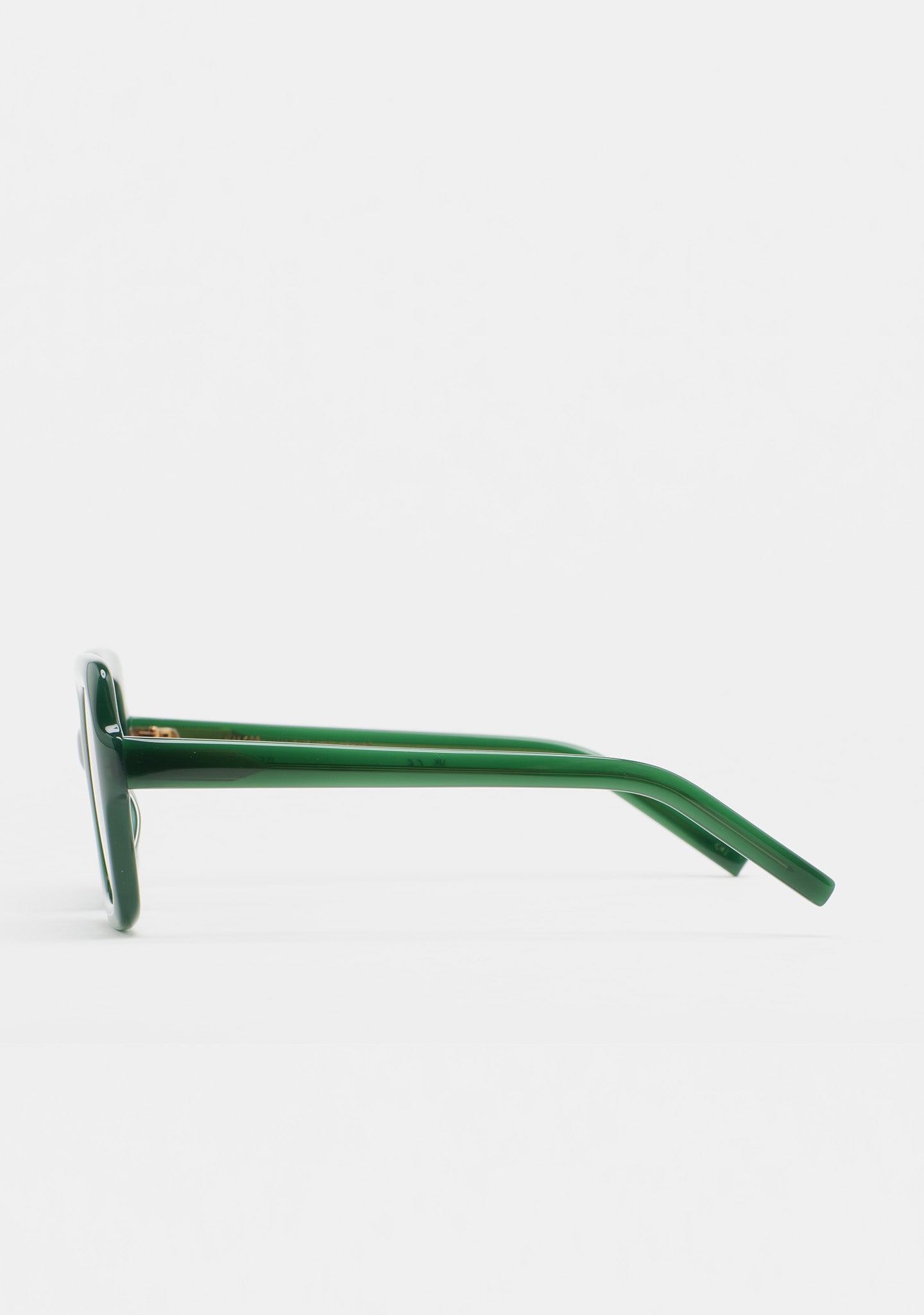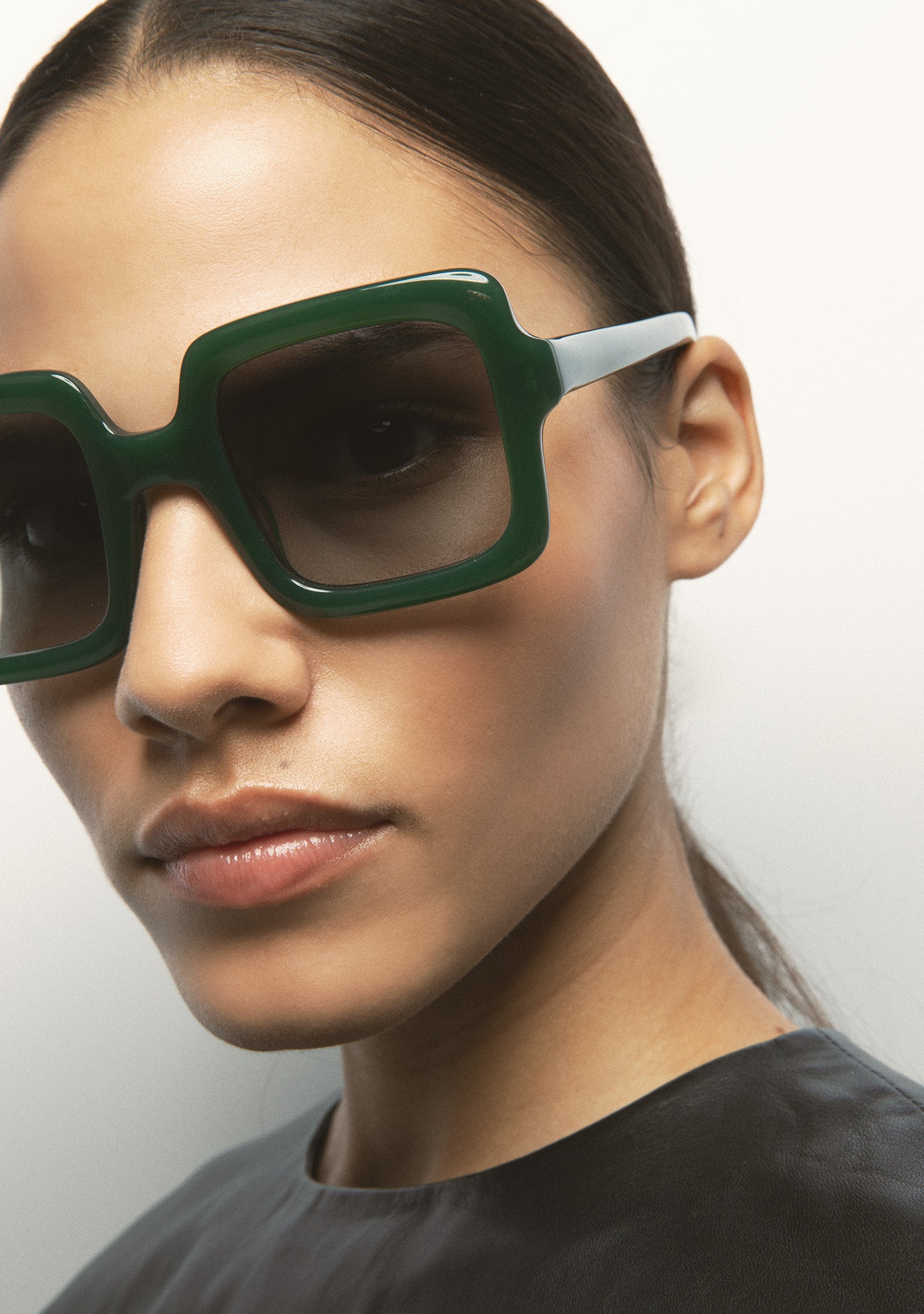 Square Sunglasses with milling throughout the frame perimeter. Translucent orange acetate front and temples. Brown gradient lenses, base 2, with 100% UV protection and anti-reflective coating. Category 3 lenses. Integrated acetate nose pads. Handmade.