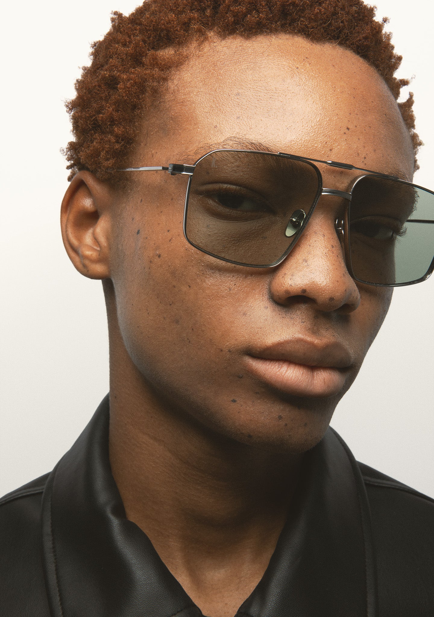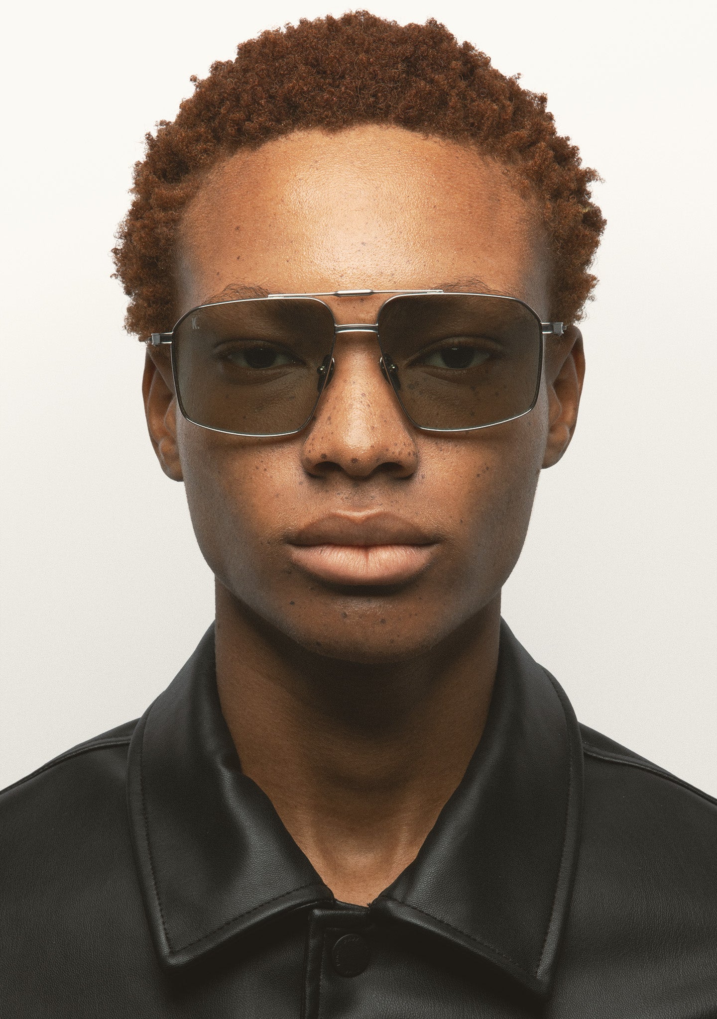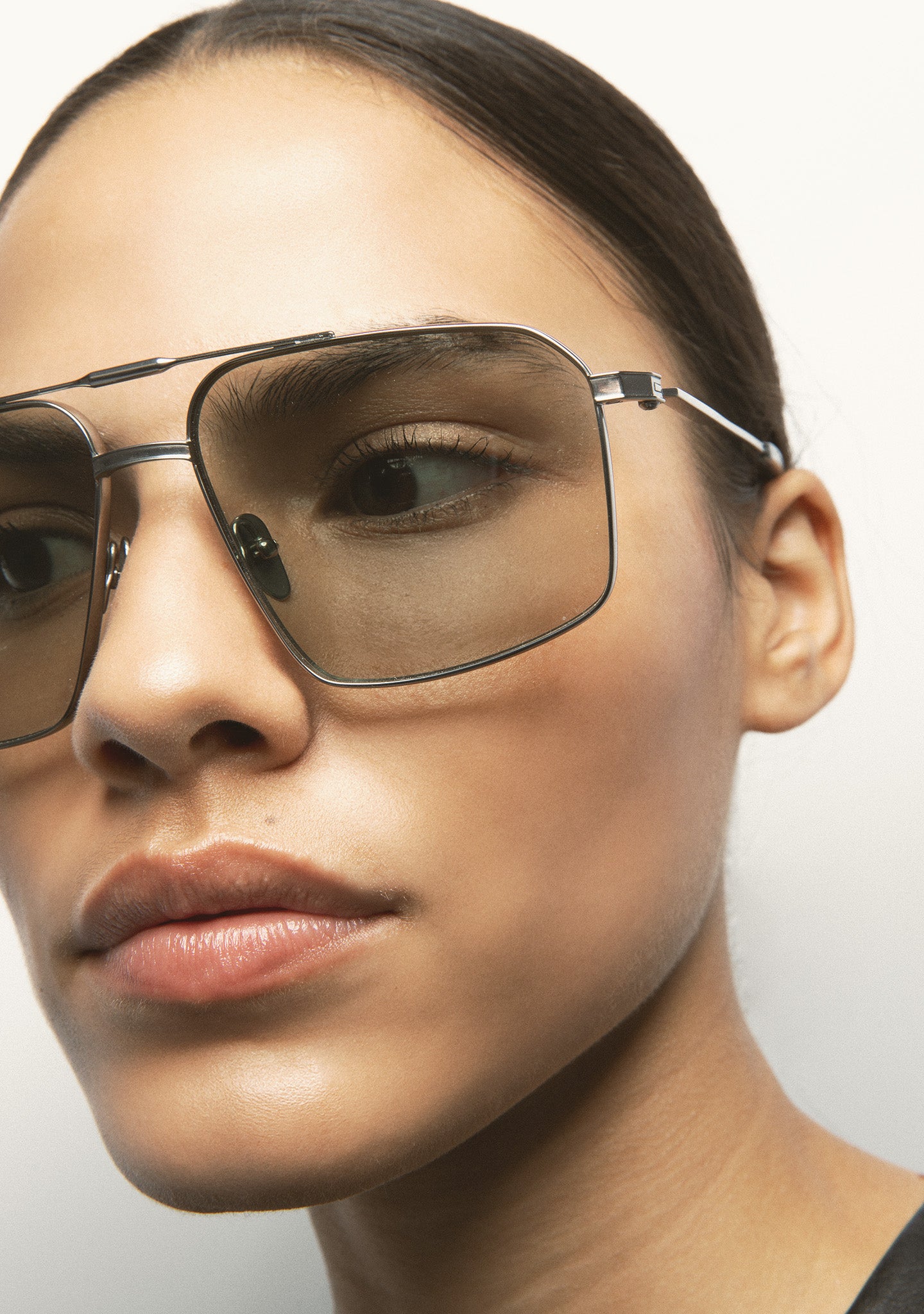 Square sunglasses with double bridge. Silver titanium front and temples. Temples end in clear crystal acetate tips. Dark blue gradient lenses, base 2, with 100% UV protection and anti-reflective coating. Category 3 lenses. Integrated nose pads. Handmade.