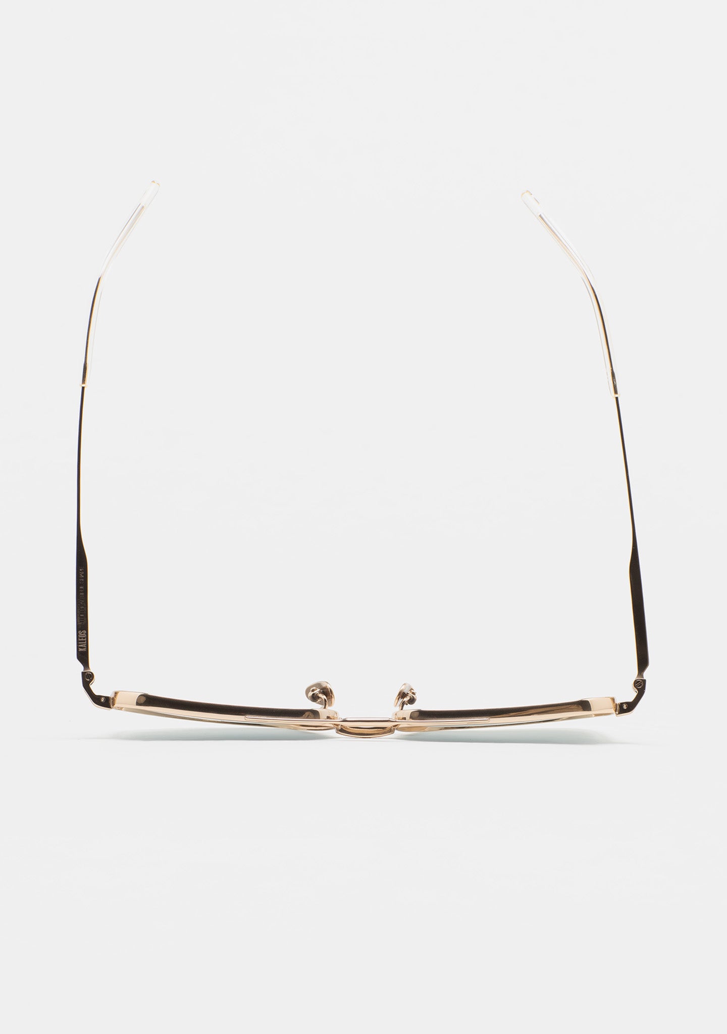 Square sunglasses with double bridge. Silver titanium front and temples. Temples end in clear crystal acetate tips. Dark blue gradient lenses, base 2, with 100% UV protection and anti-reflective coating. Category 3 lenses. Integrated nose pads. Handmade.