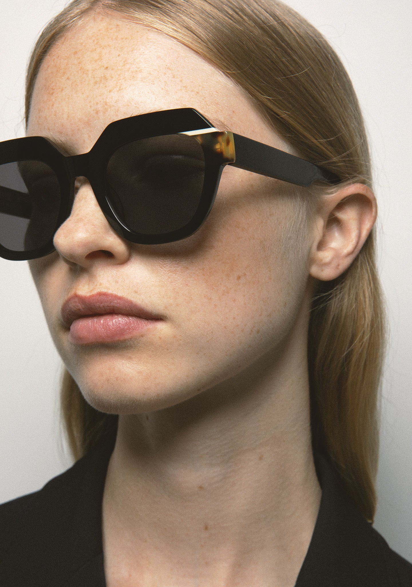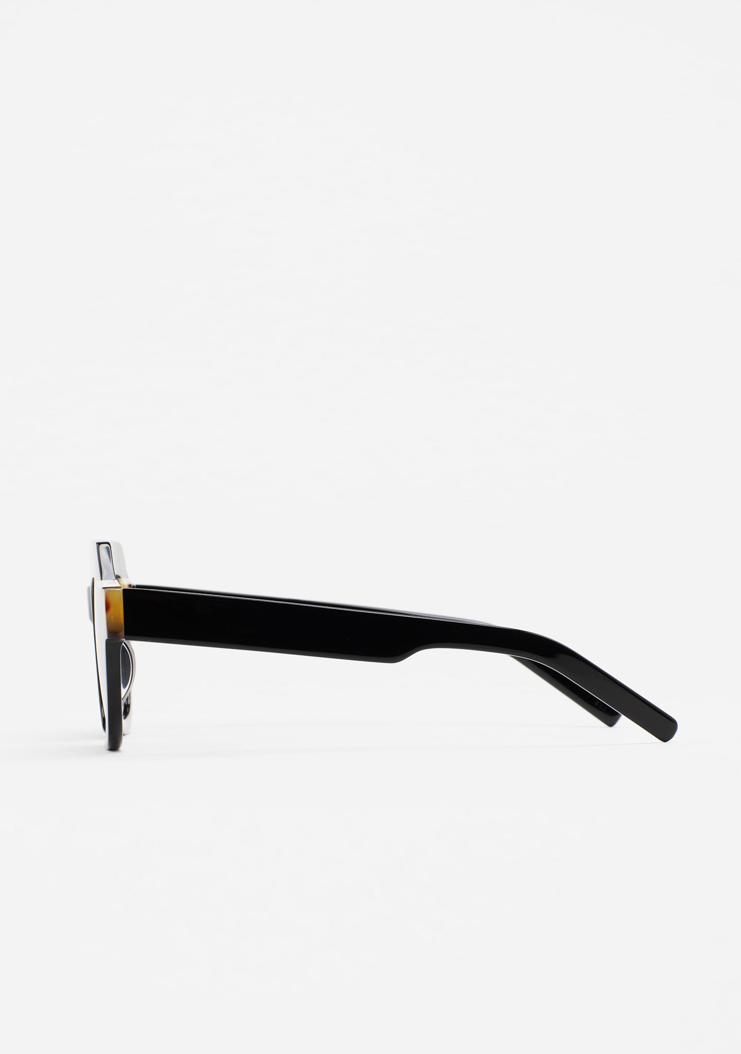 Hexagonal-shaped sunglasses. Black acetate front with double laminate in white and brown tortoiseshell. Black acetate temples. Gray 2-base lens with 100% UV protection and anti-reflective treatment. Category 3 lenses. Built-in acetate nose pads. Handmade.