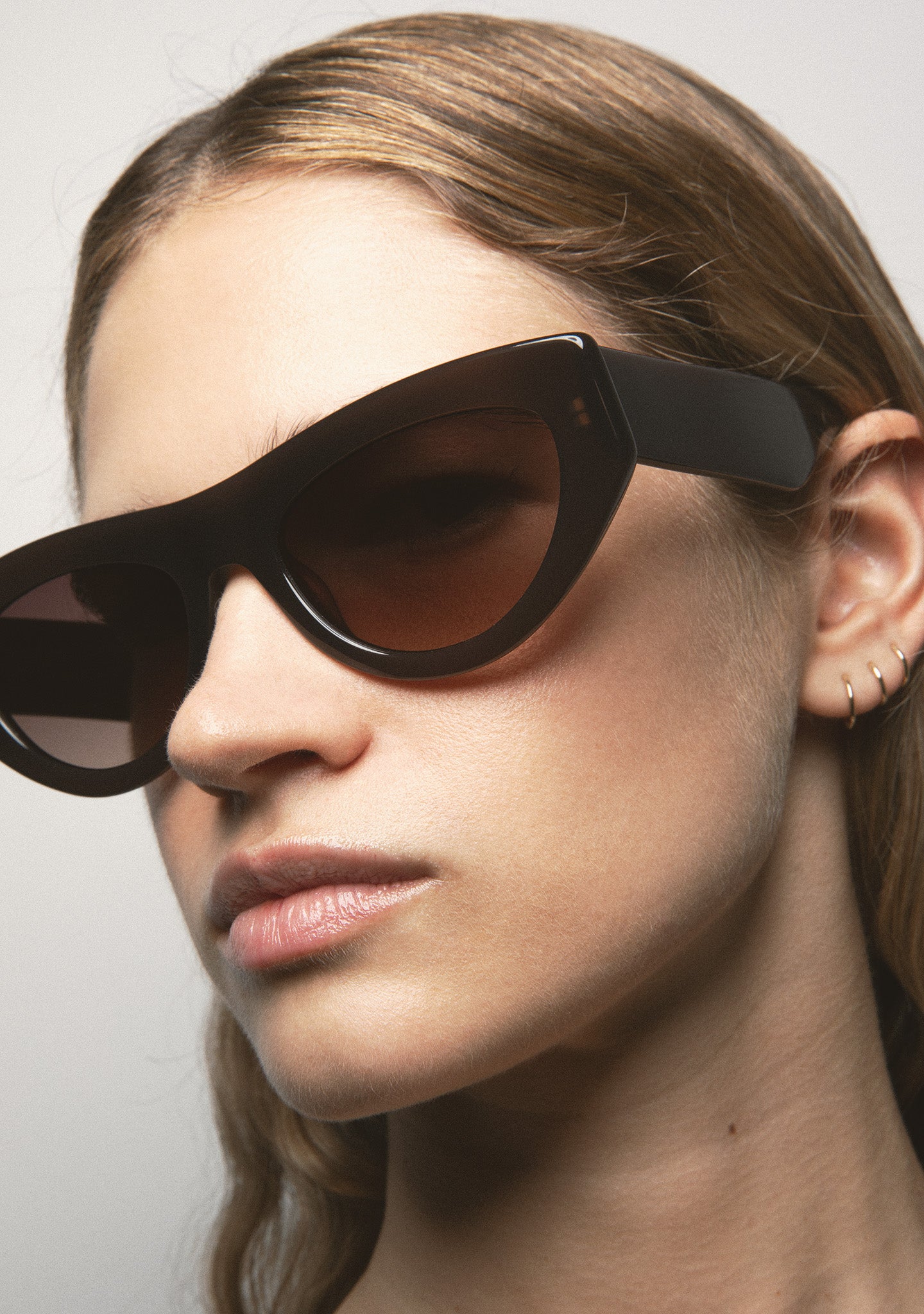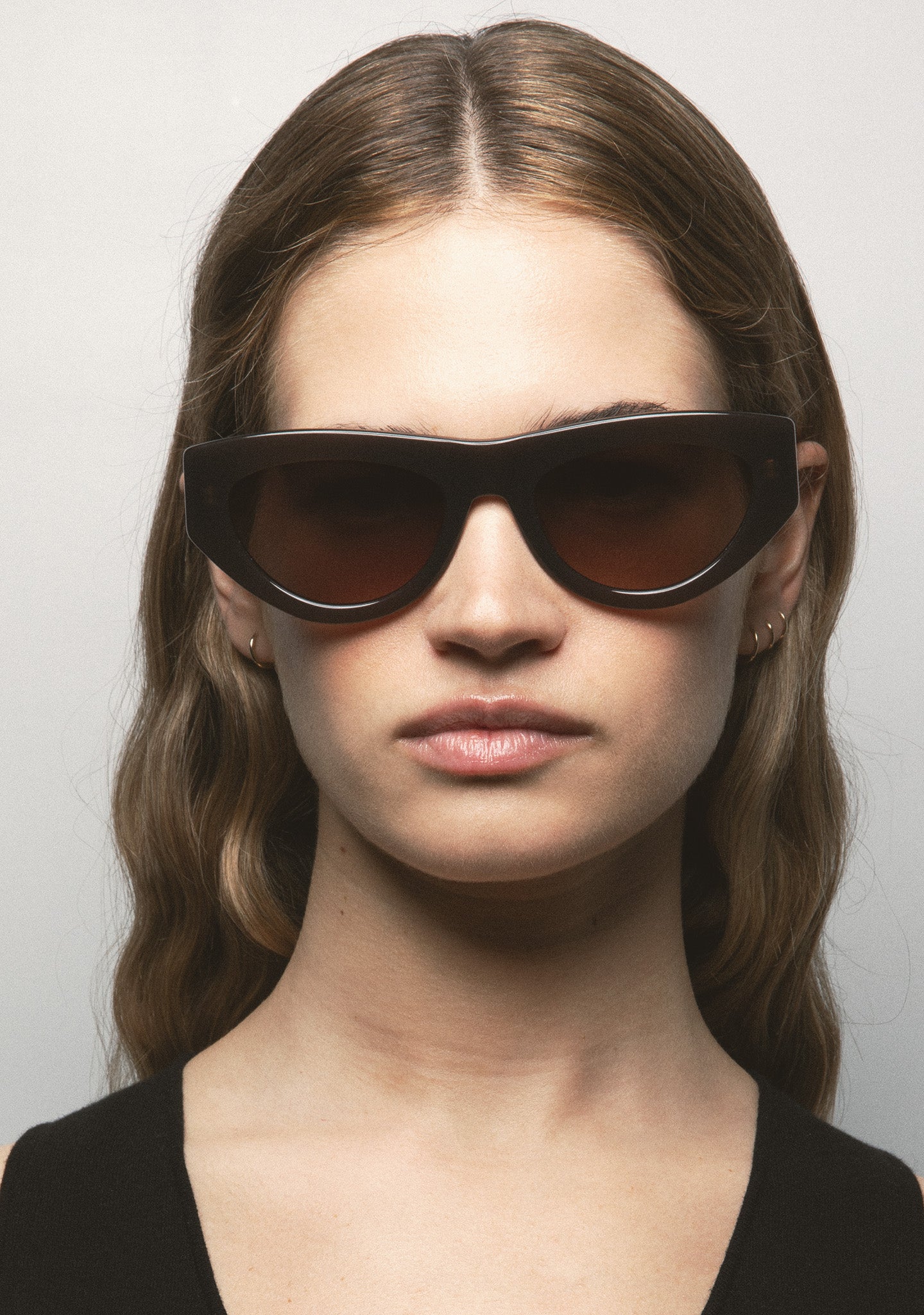 Cat-eye-shaped sunglasses. Black acetate front and temples. Curved temple-end. Green photochromic lens, base 2, with UV protection and anti-reflective treatment. Category 1-3 lens. Integrated acetate nose pads. Handmade.