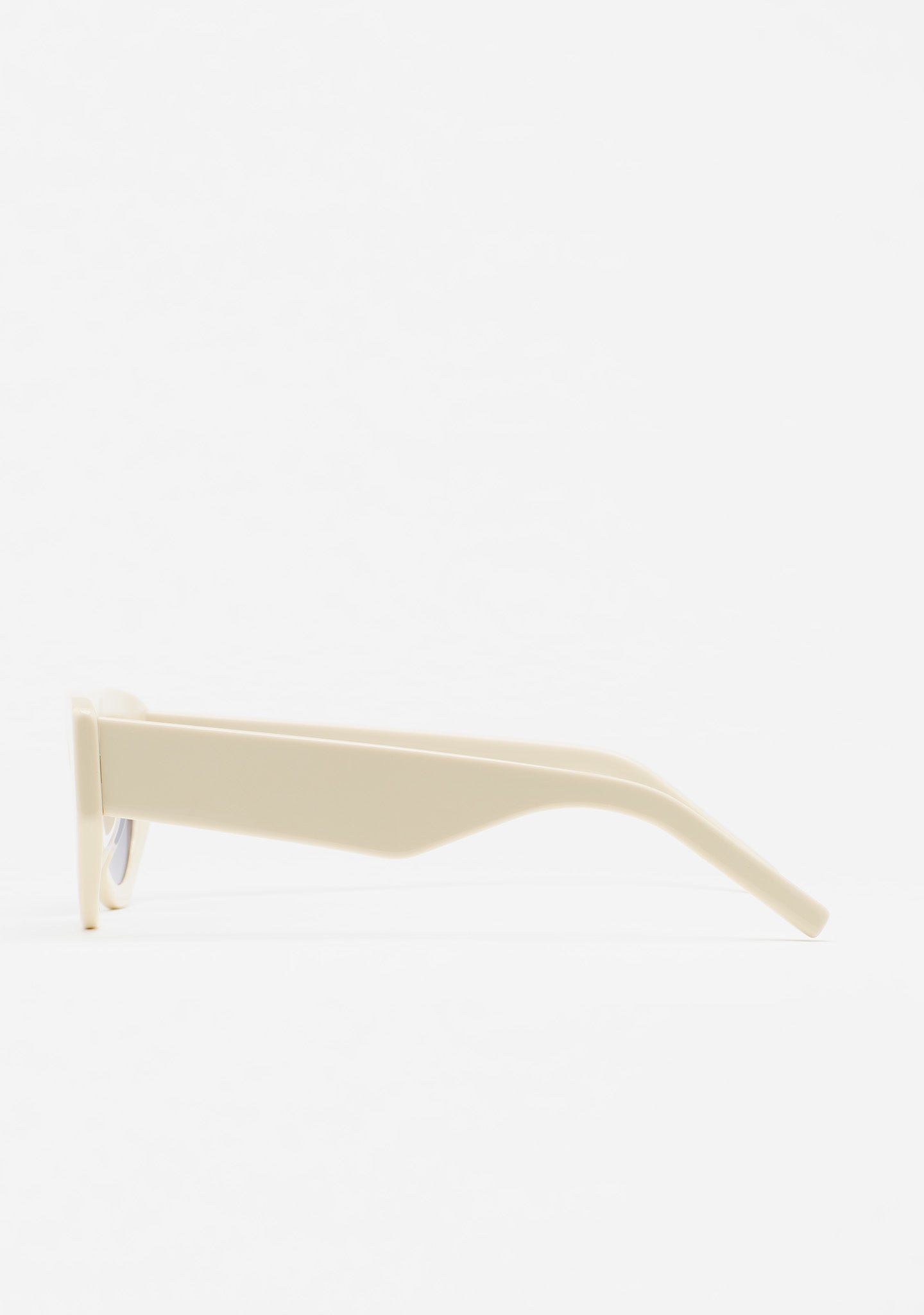 Cat-eye-shaped sunglasses. Black acetate front and temples. Curved temple-end. Green photochromic lens, base 2, with UV protection and anti-reflective treatment. Category 1-3 lens. Integrated acetate nose pads. Handmade.