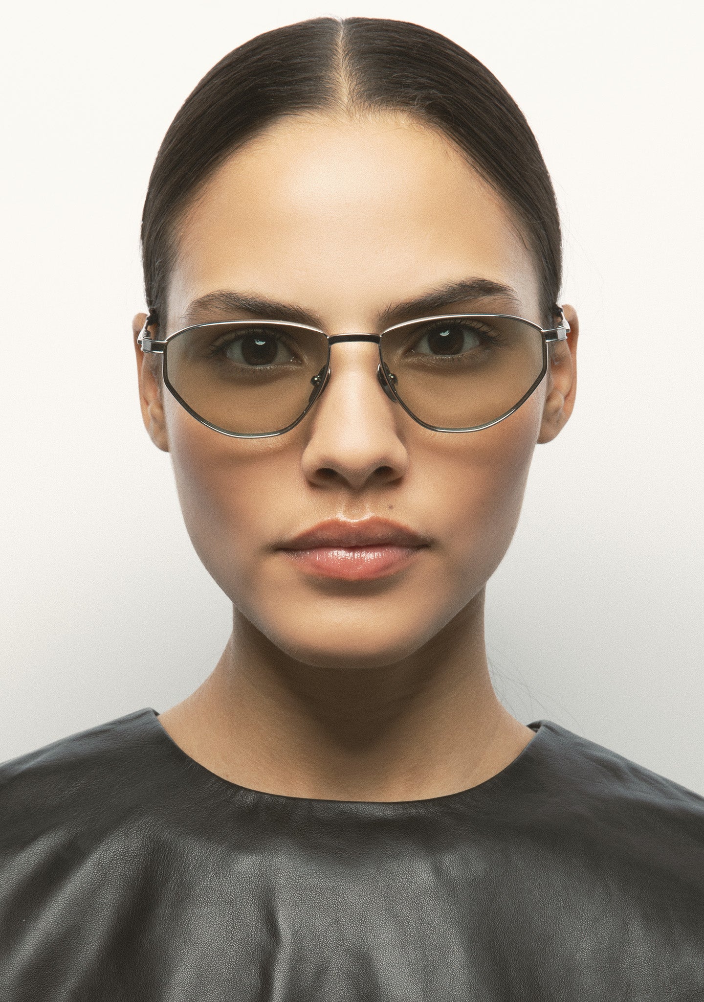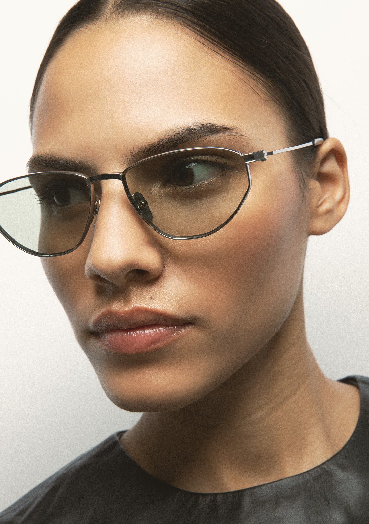 Cat-eye shaped sunglasses. Front and temples made of brown titanium. Temples with transparent crystal acetate tips. Grey lens, category 2, with 100% UV protection and anti-reflective coating. Category 3 lens. Integrated nose pads. Handmade.