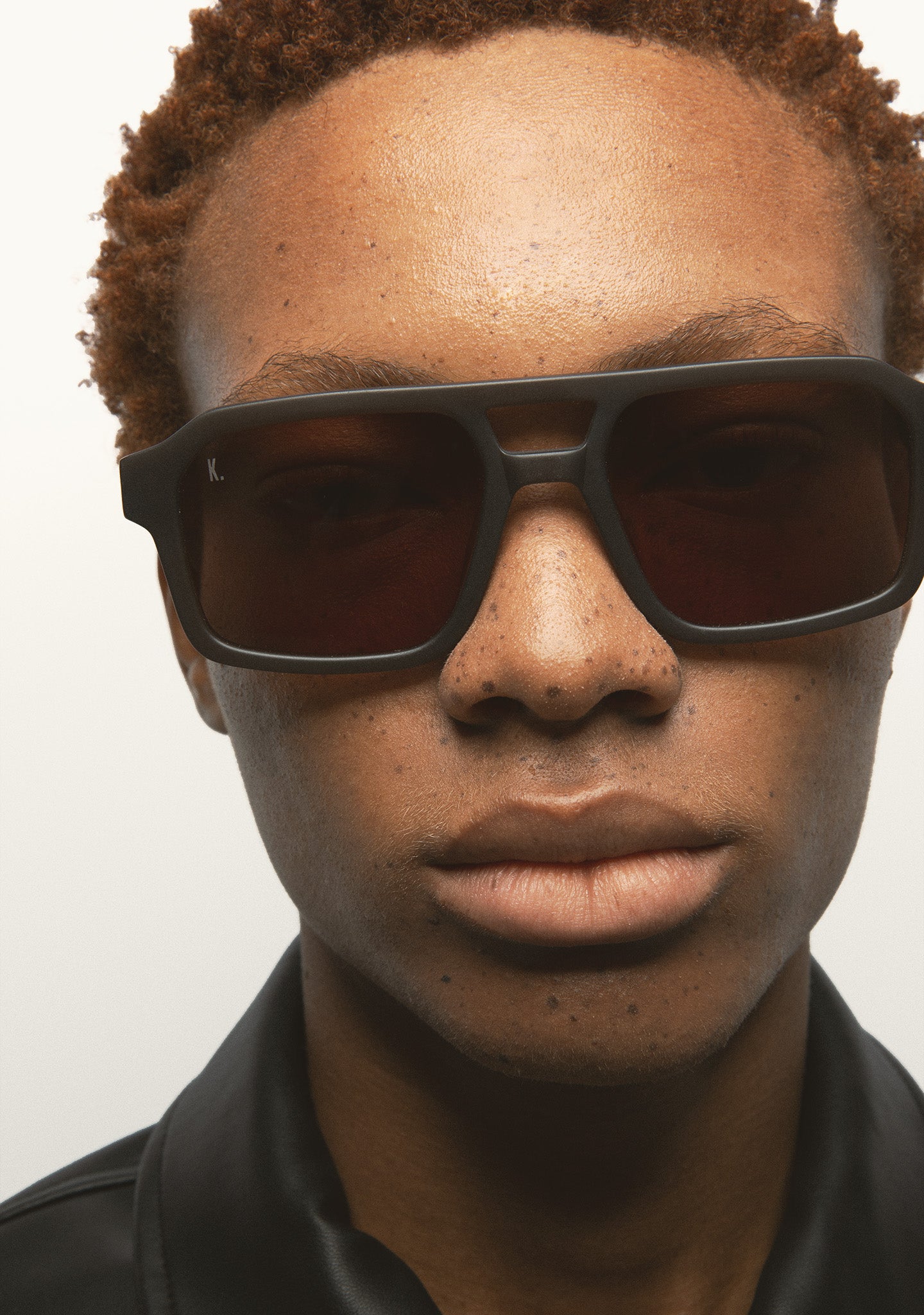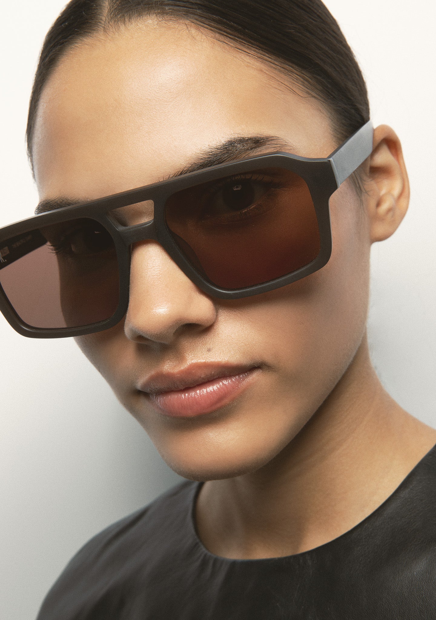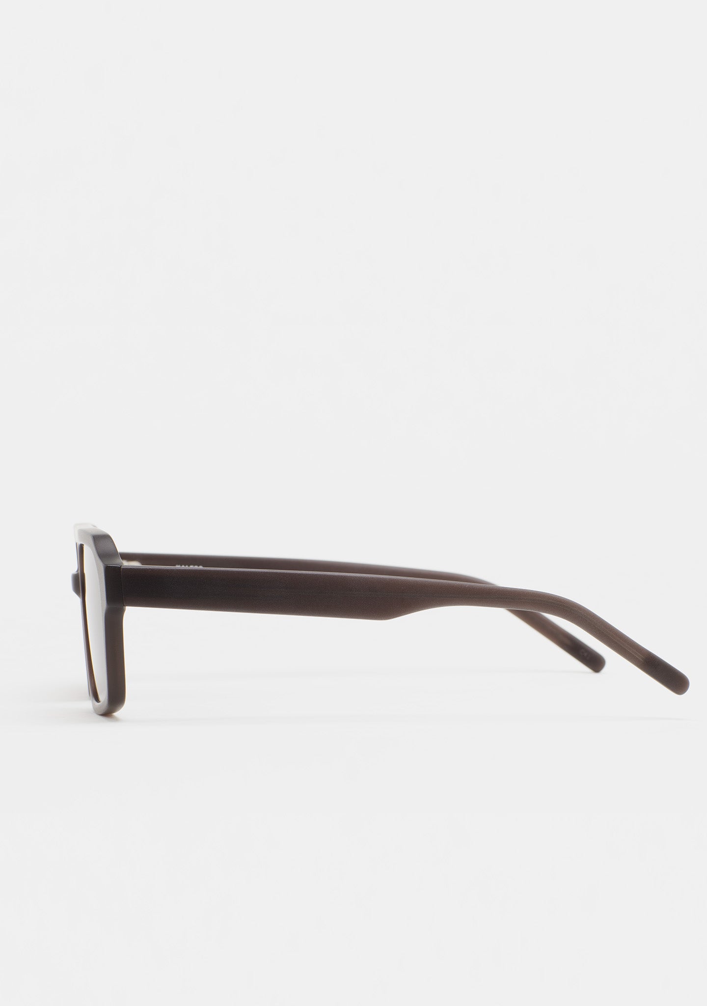 Rectangular Sunglasses with Double Bridge. Transparent gray acetate front and temples. Brown photochromic lenses, base 2, with UV protection and anti-reflective coating. Category 1 3 lenses. Integrated acetate nose pads. Handmade.