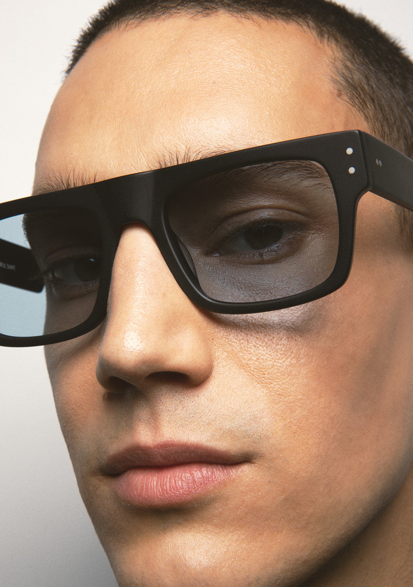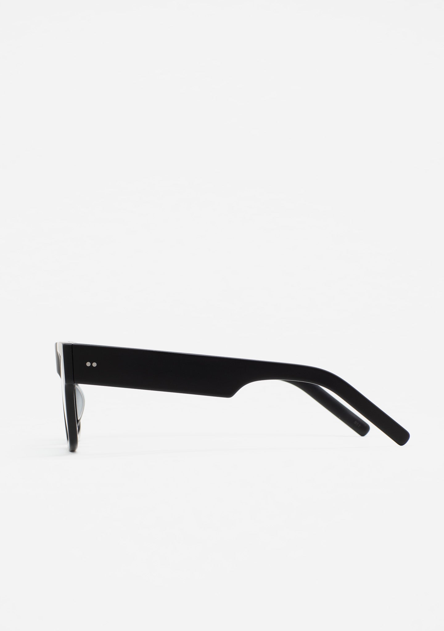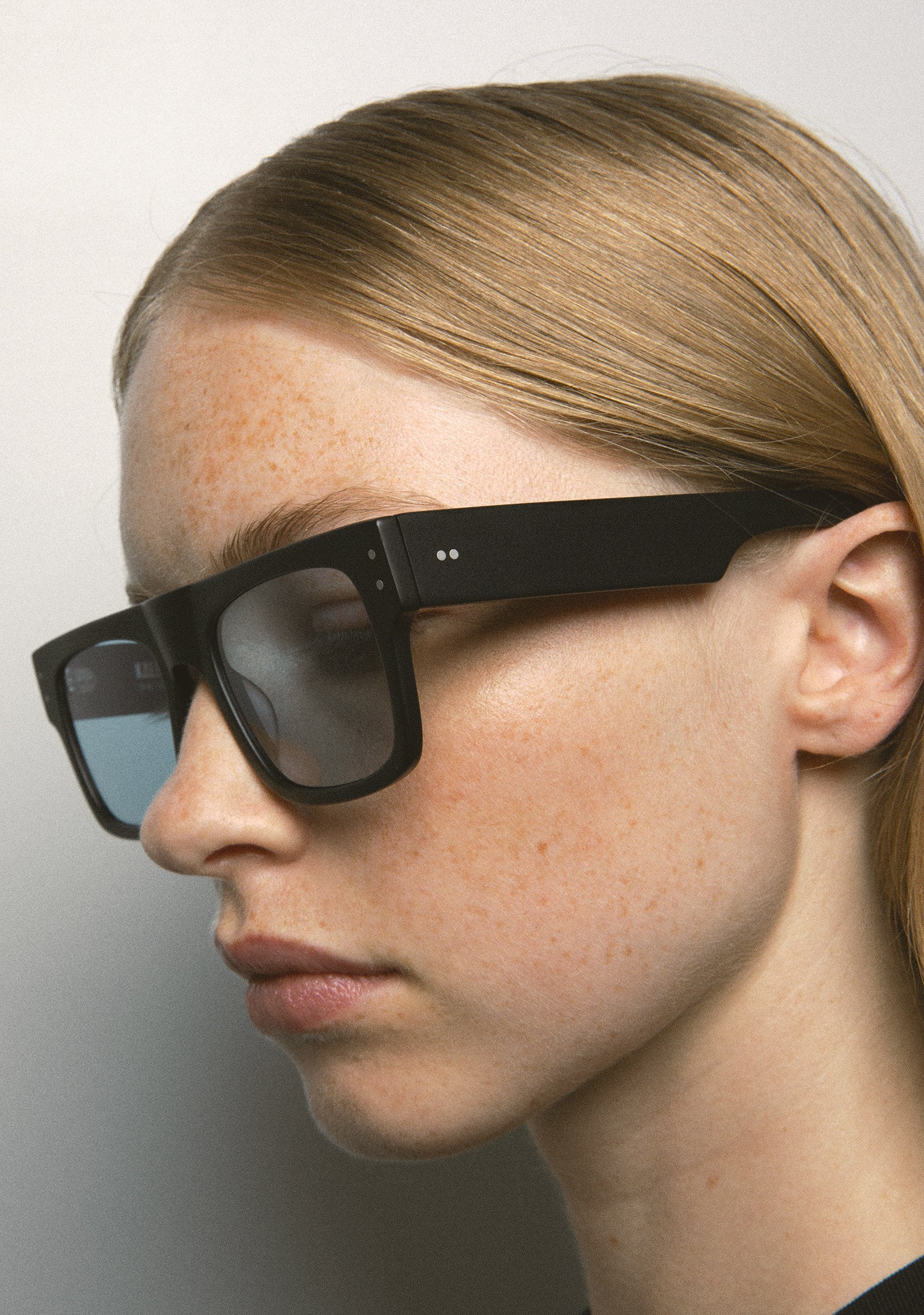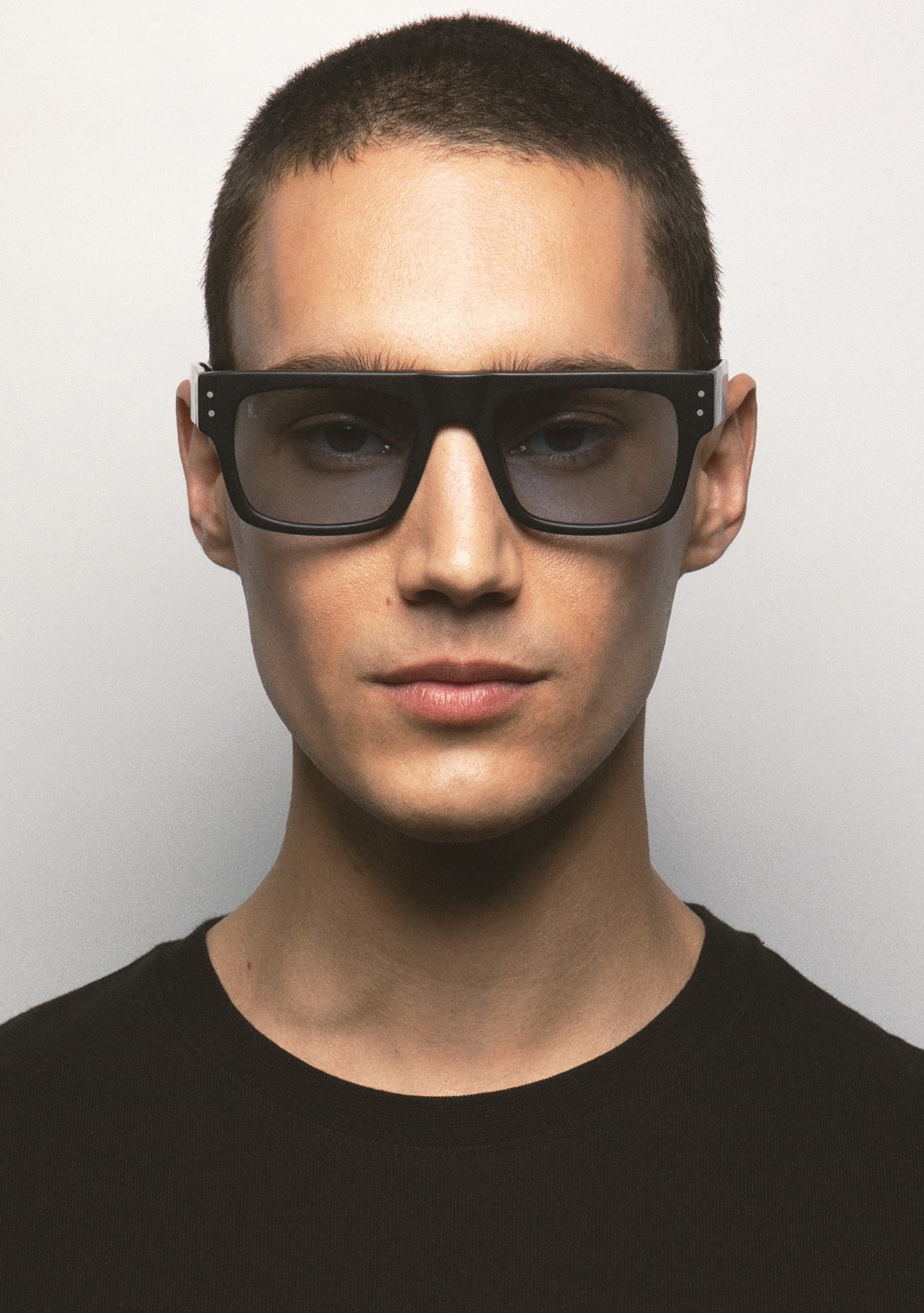 Rectangular-shaped optical glasses. Black acetate front and temples. Silver rivet hinges on the corners and temples. Gray photochromic gradient 2-base lens with UV protection and anti-reflective treatment. Category 1-3 lenses. Built-in acetate nose pads. Handmade.