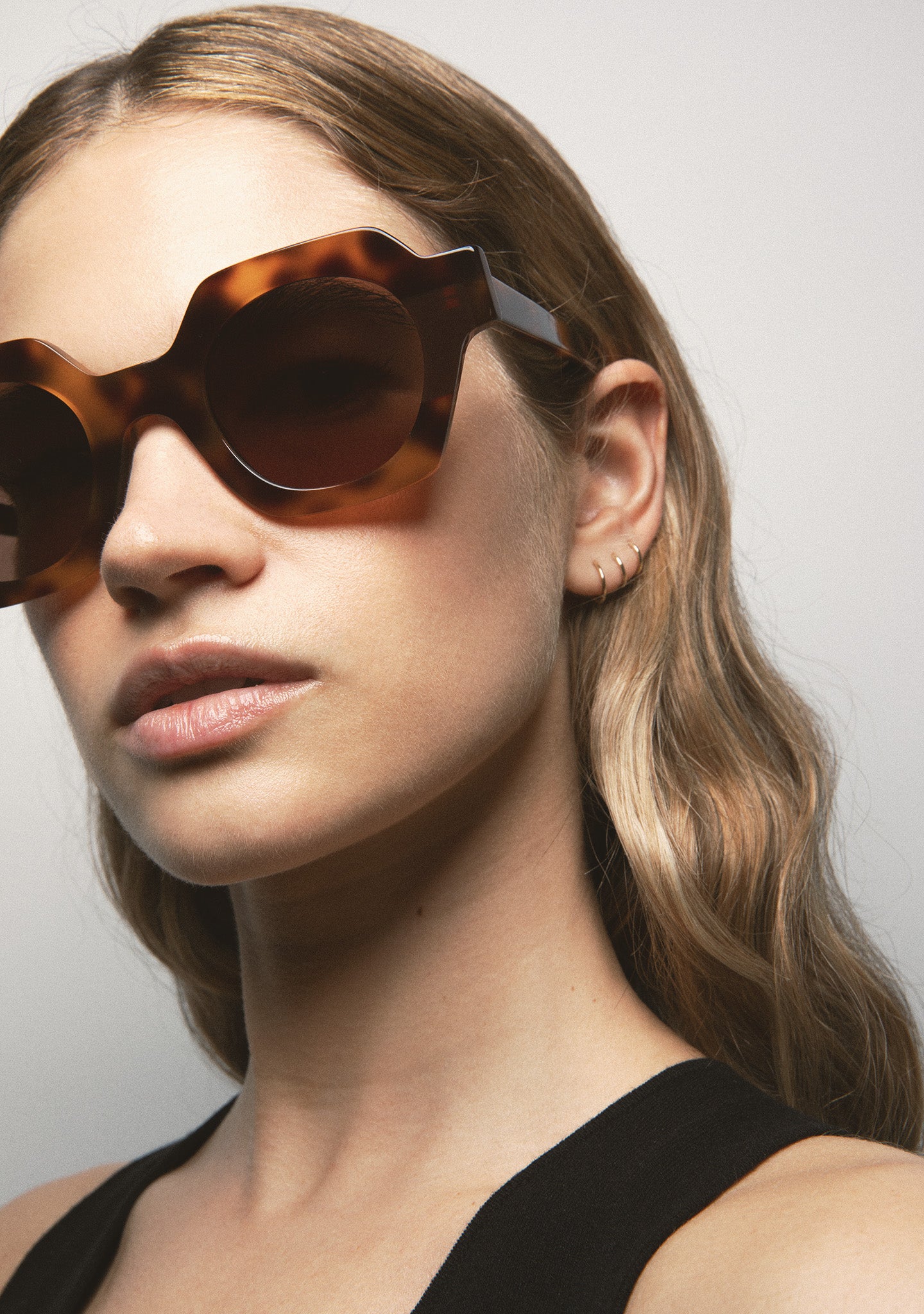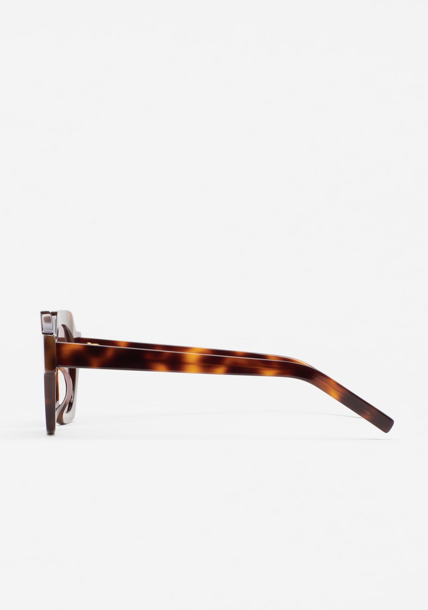 Square-shaped sunglasses. Front of black acetate with Havana brown laminate. Black acetate temples. Black gradient lens, base 2, with 100% UV protection and anti-reflective coating. Lens Category 3. Acetate nose pads incorporated. Handmade.