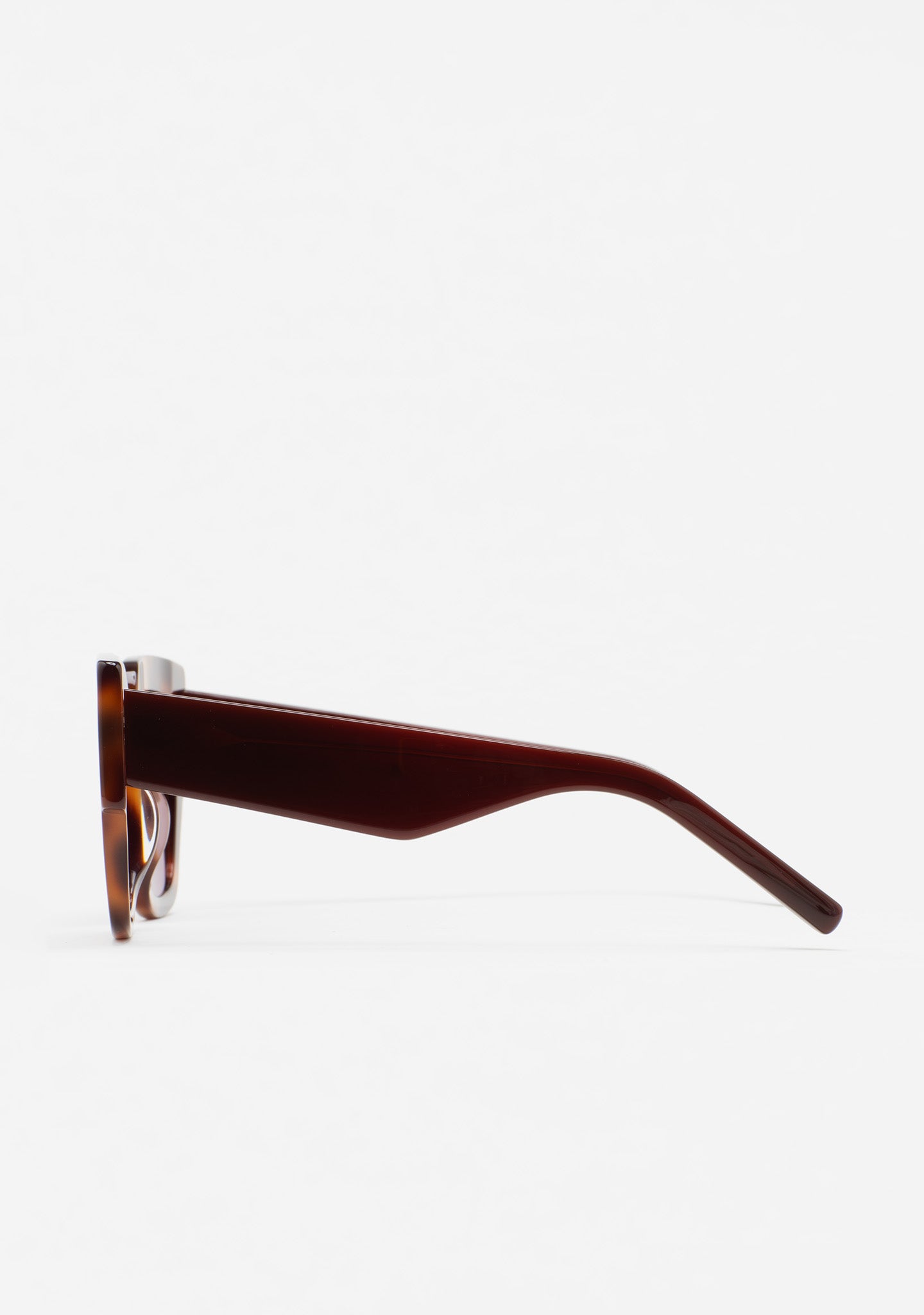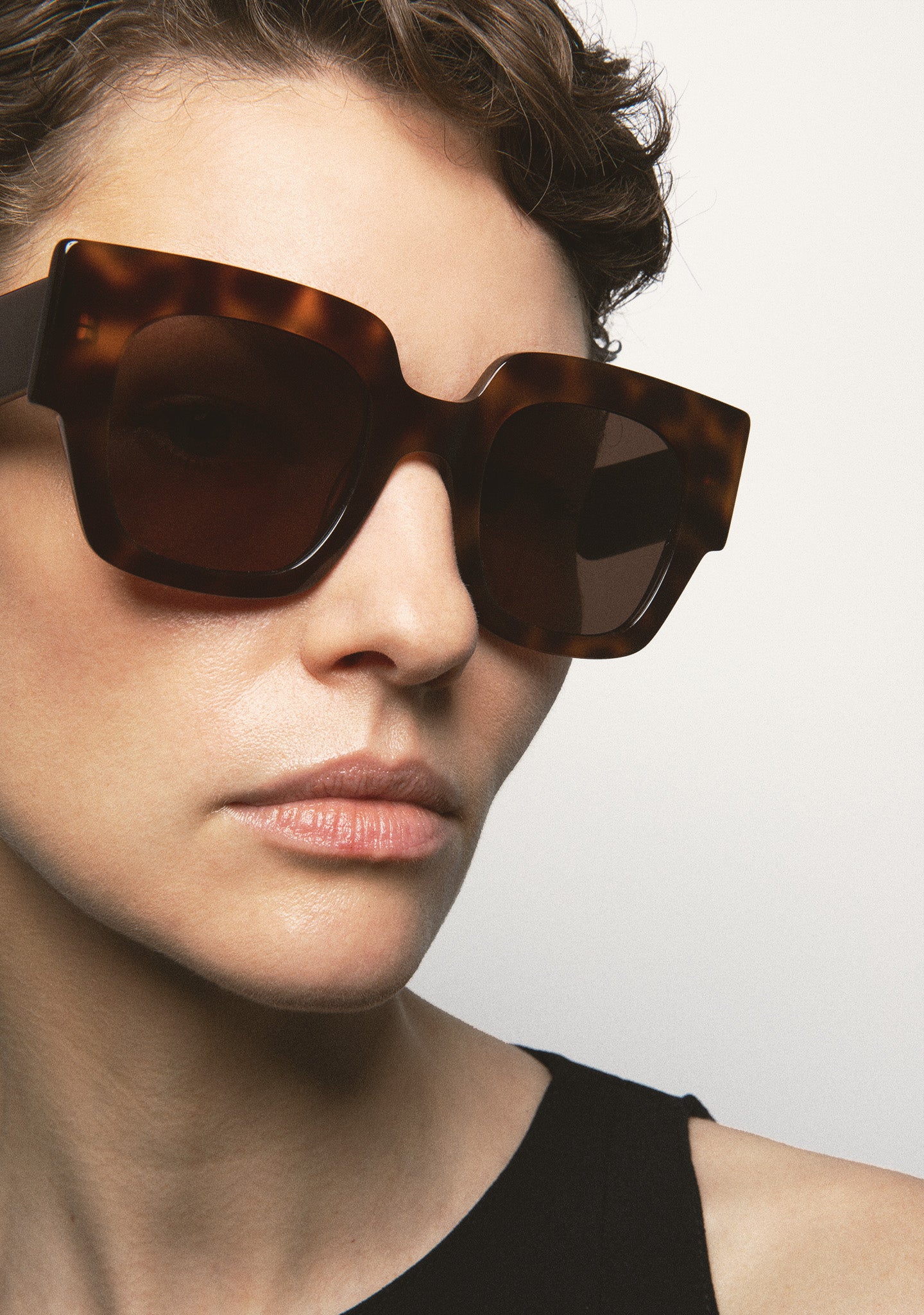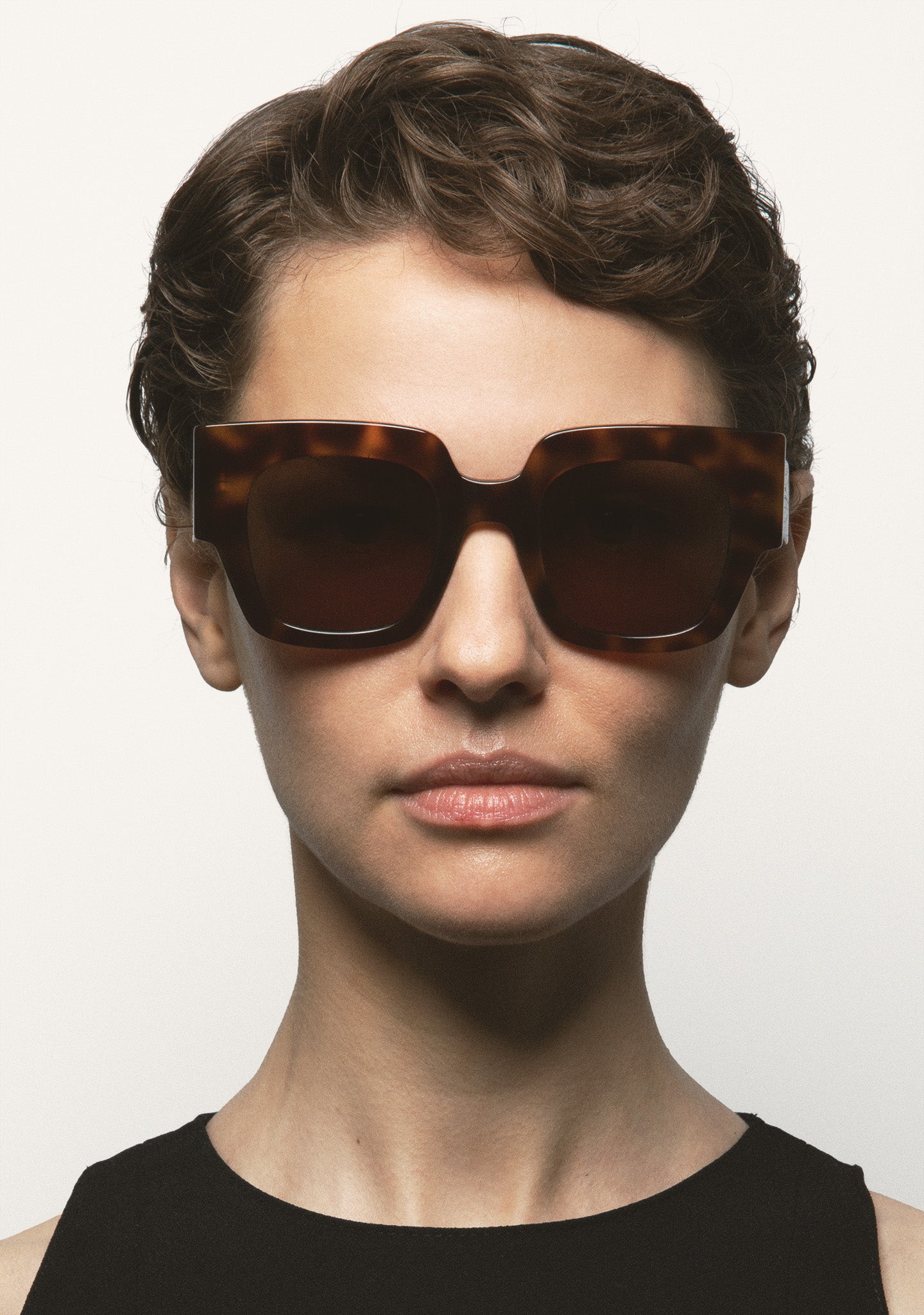 Square Sunglasses. Black acetate front with Havana brown temples. Black gradient lenses with 100% UV protection and anti-reflective coating. Category 3 lenses. Integrated acetate nose pads. Handmade.