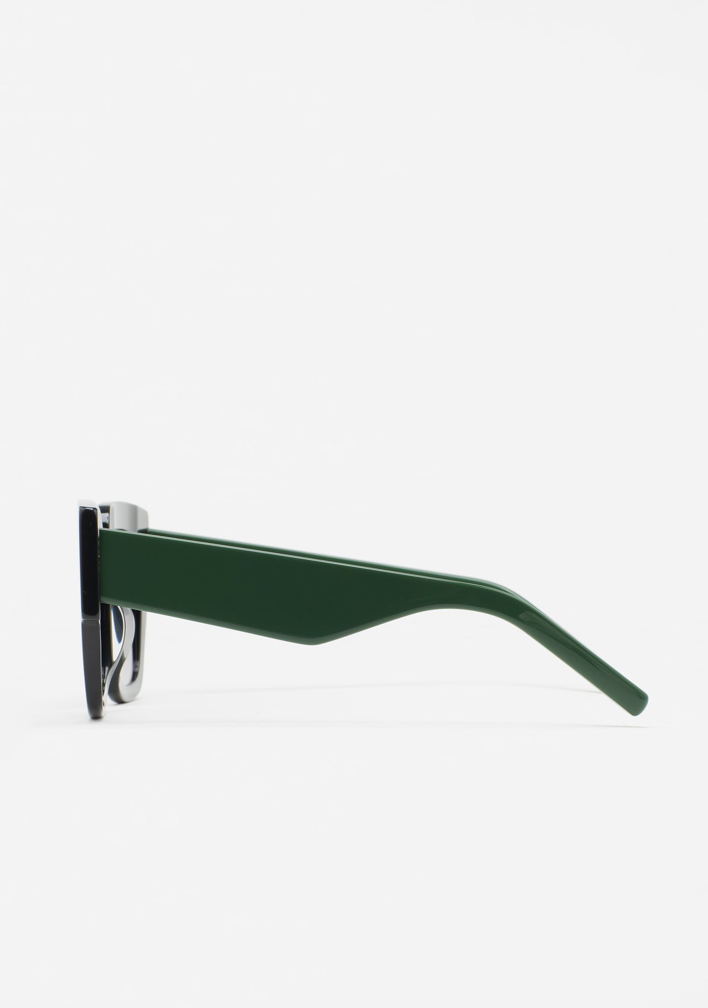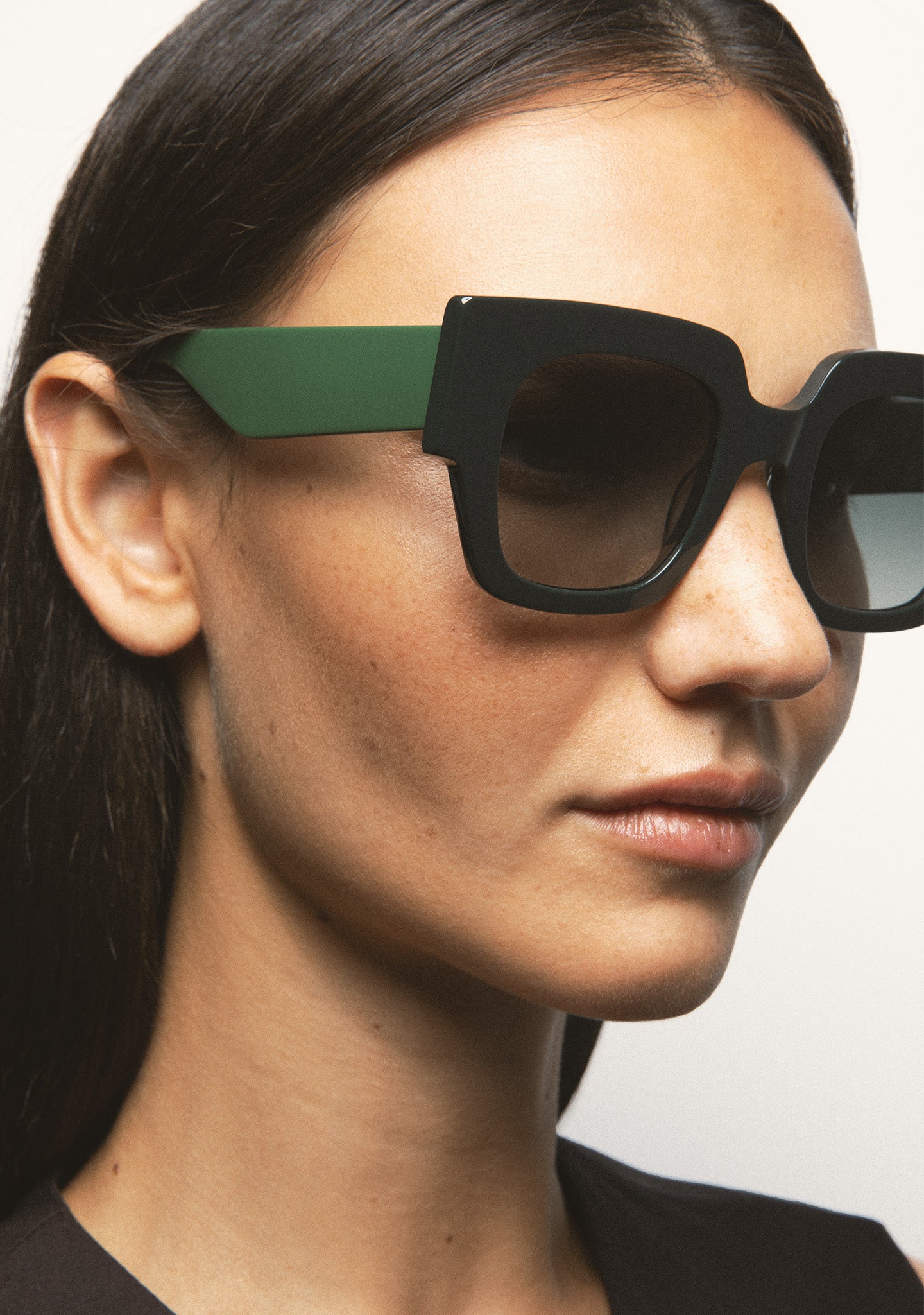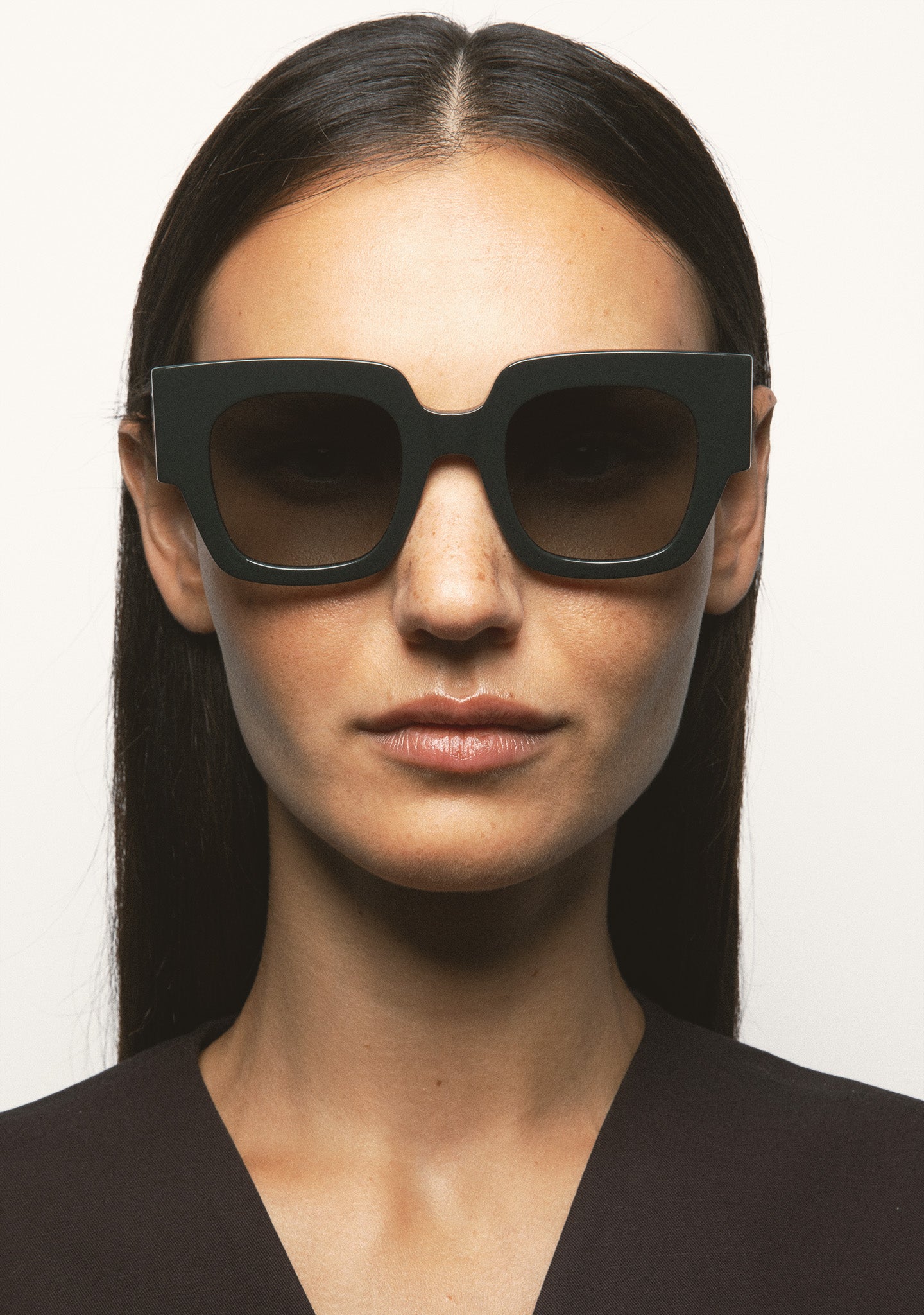 Square Sunglasses. Black acetate front with Havana brown temples. Black gradient lenses with 100% UV protection and anti-reflective coating. Category 3 lenses. Integrated acetate nose pads. Handmade.