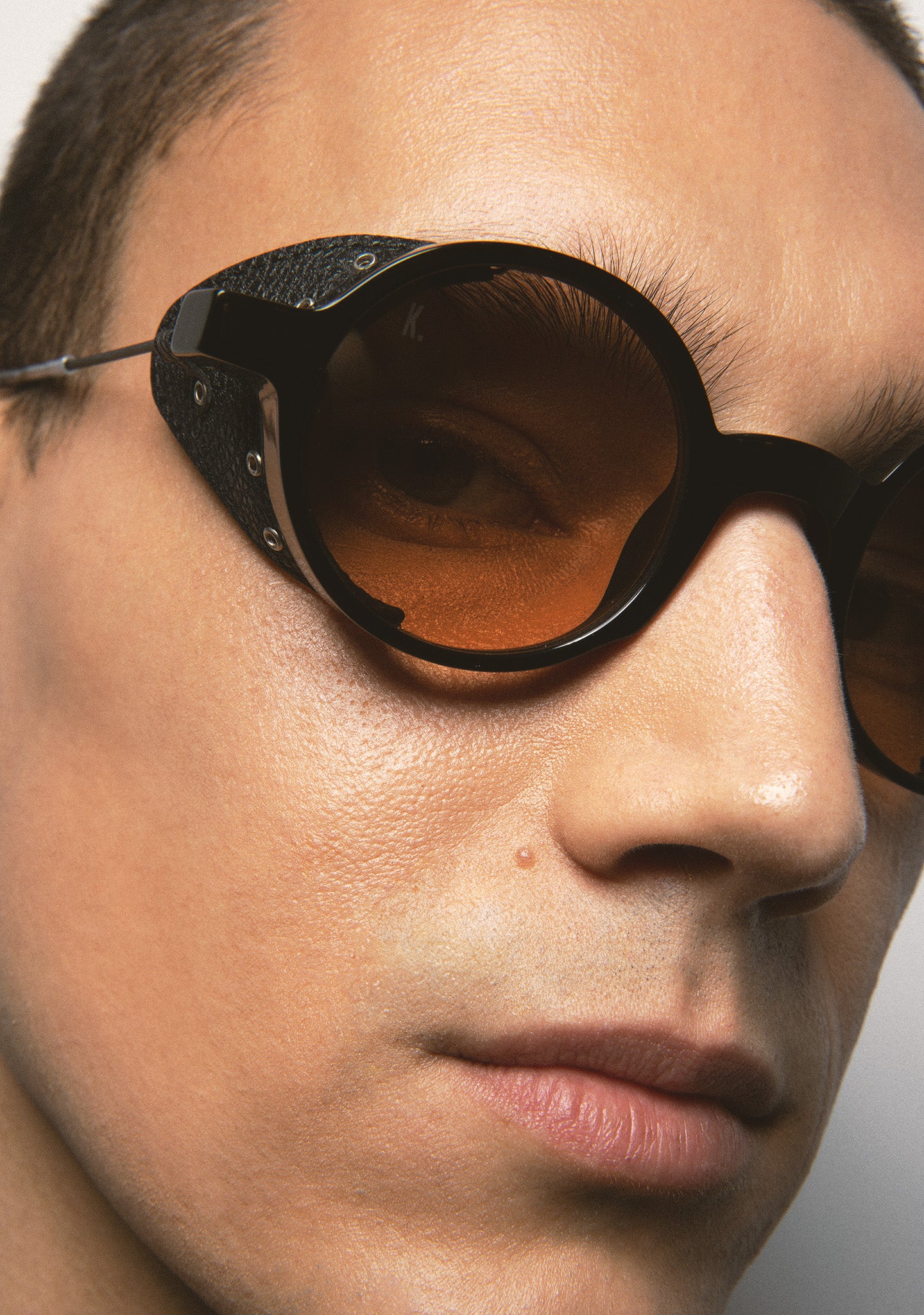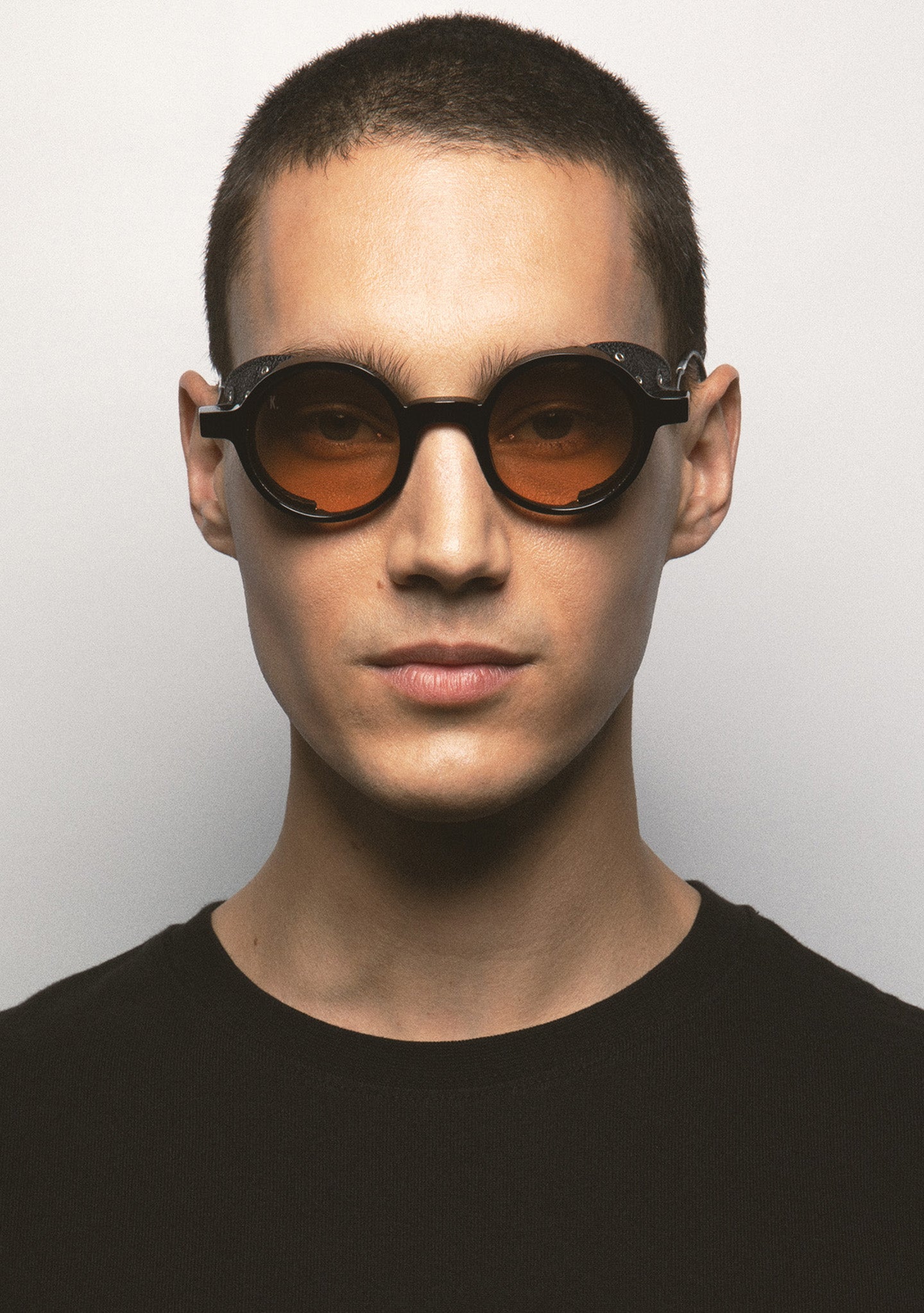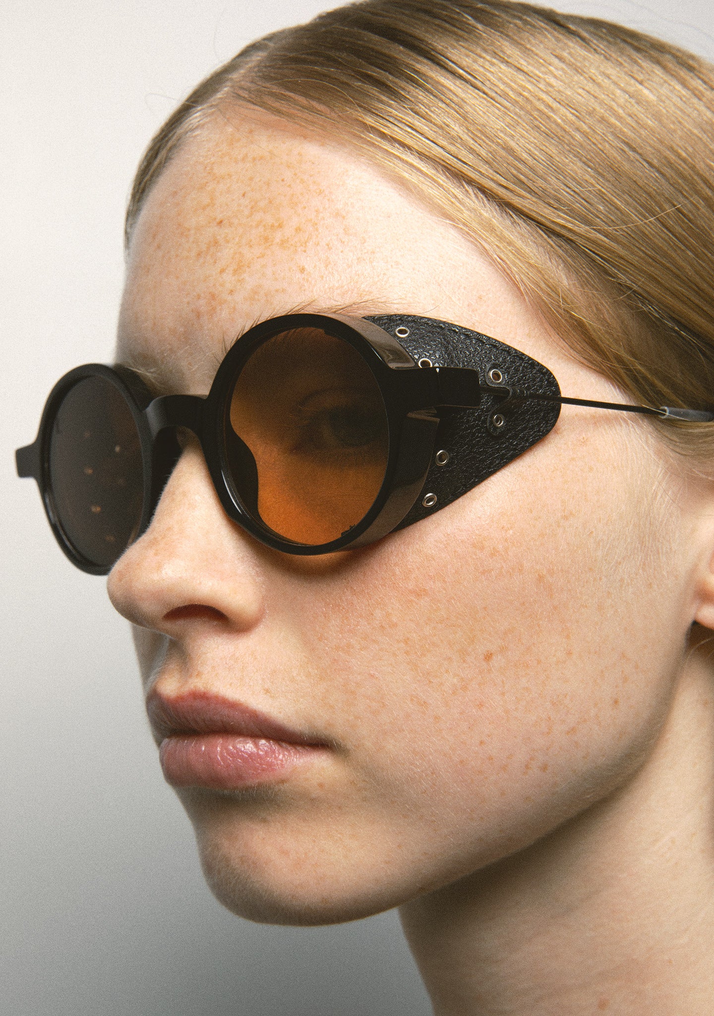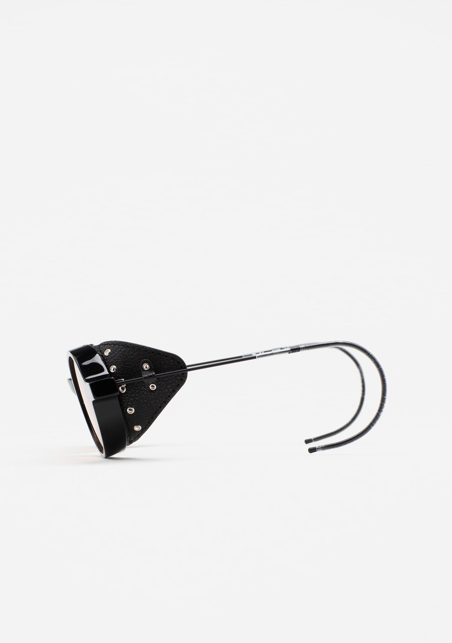 Round-shaped sunglasses. Black acetate front with matte dark silver stainless steel temples and flexible tips. Removable black faux leather side shields. Black gradient 2-base lens with UV protection and anti-reflective treatment. Category 3 lenses. Built-in acetate nose pads. Handmade.