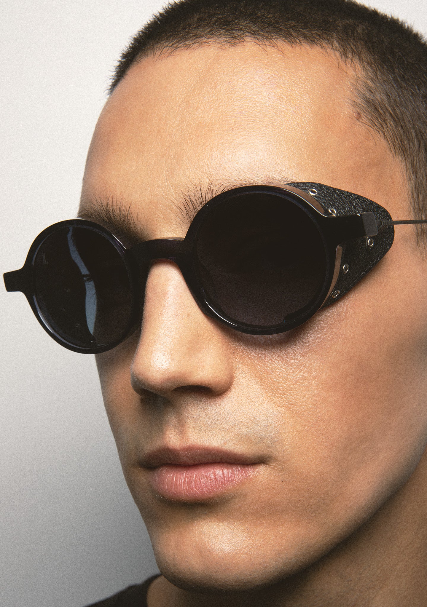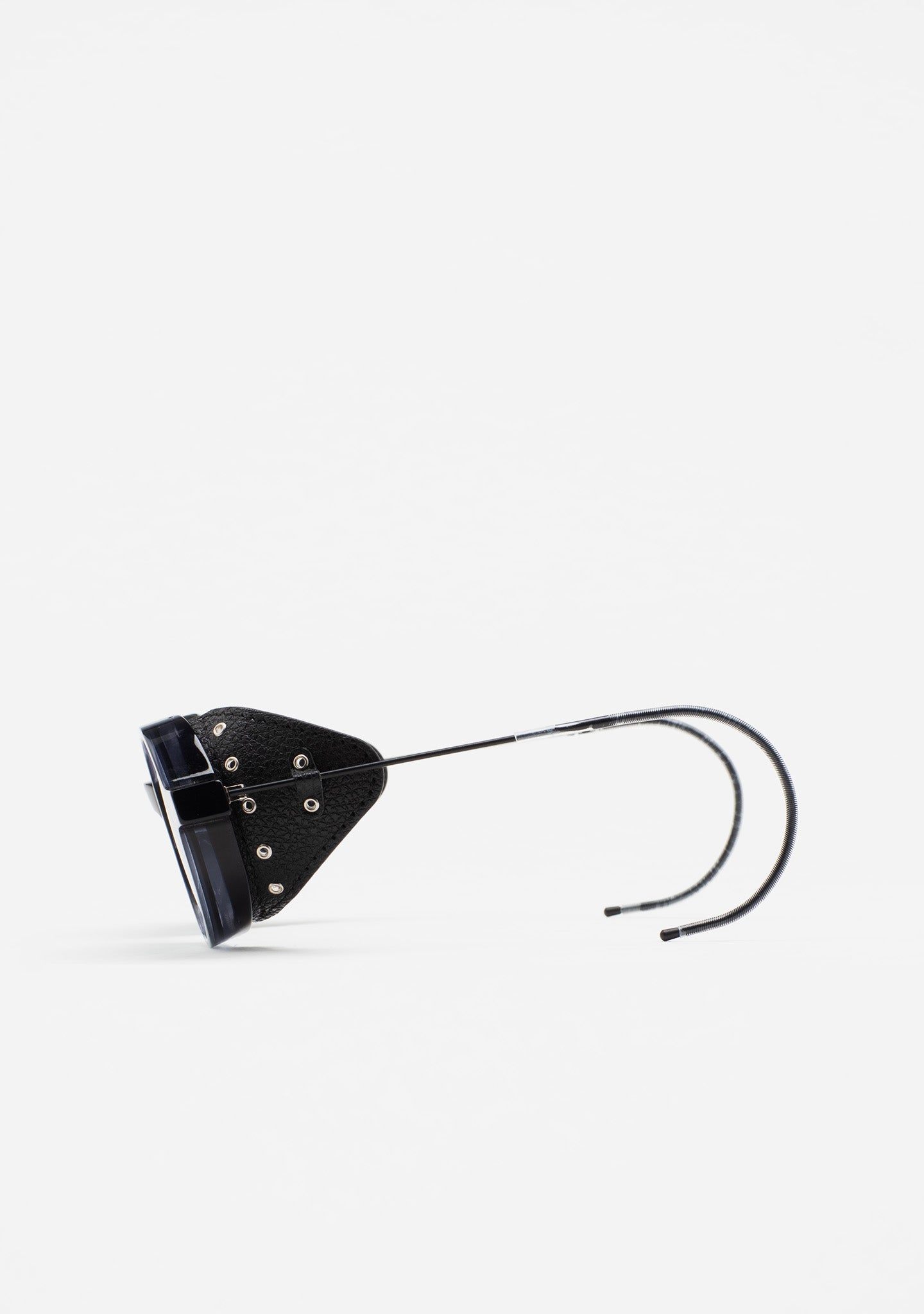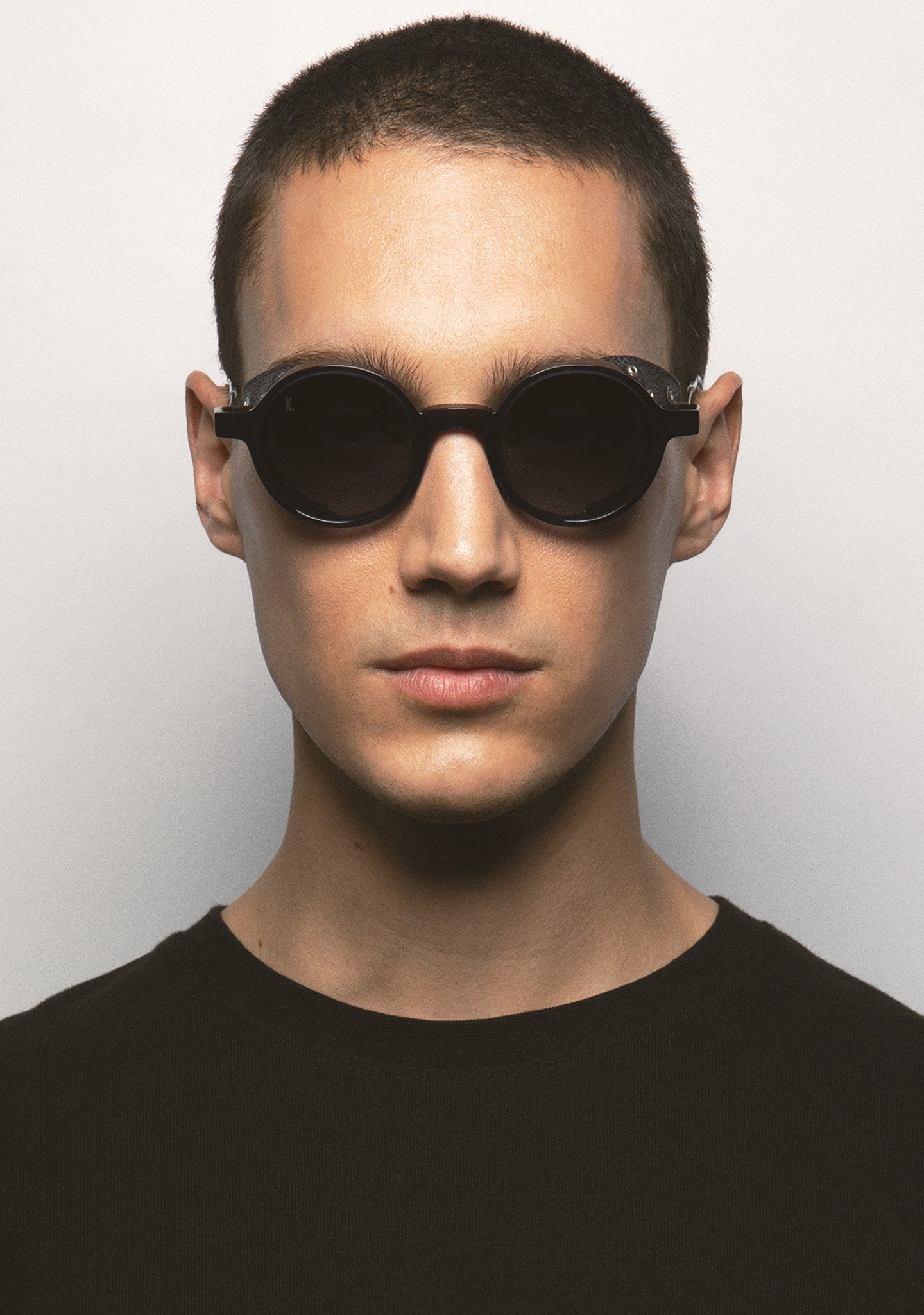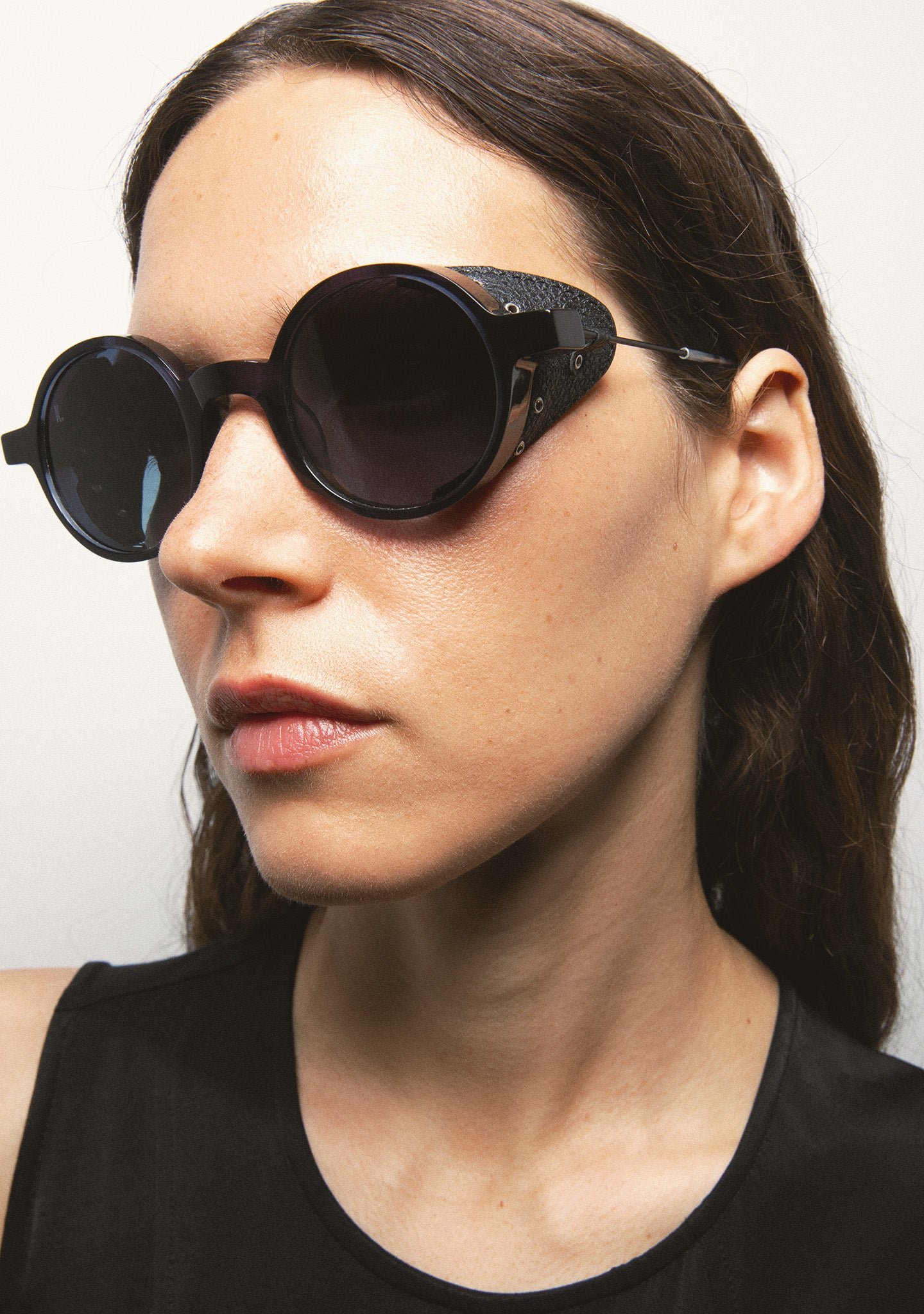 Round-shaped sunglasses. Black acetate front with matte dark silver stainless steel temples and flexible tips. Removable black faux leather side shields. Black gradient 2-base lens with UV protection and anti-reflective treatment. Category 3 lenses. Built-in acetate nose pads. Handmade.