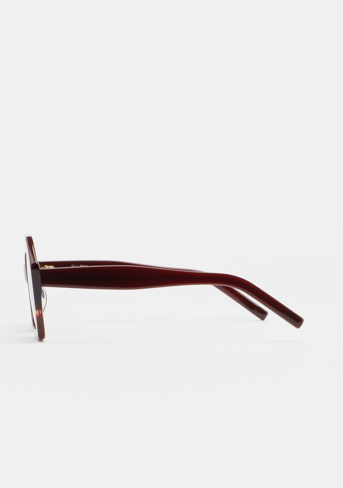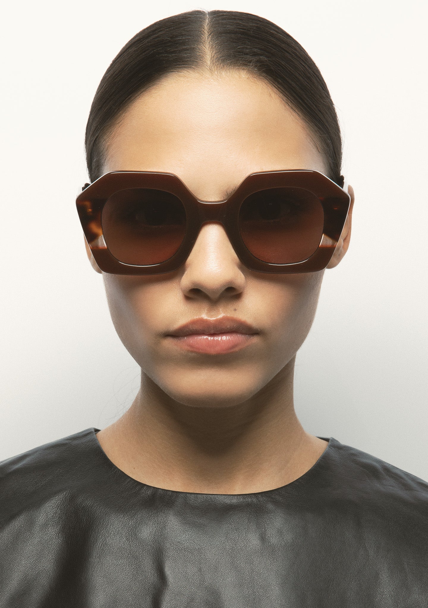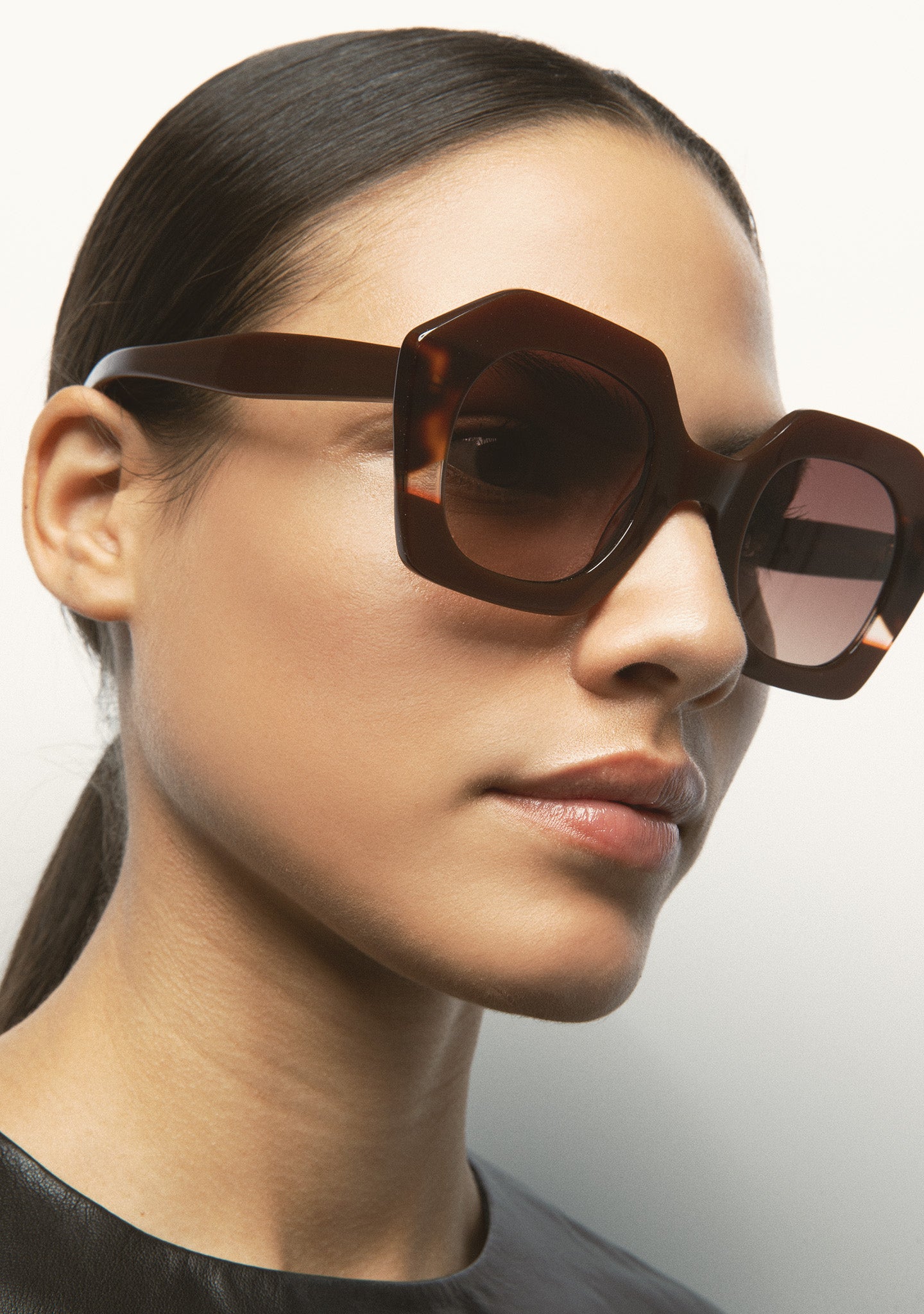 Hexagonal-shaped sunglasses. Front made of havana brown acetate with double laminate of translucent green and transparent green. Temples made of havana brown acetate. Green gradient lens category 2 with base 2, 100% UV protection, and anti-reflective treatment. Integrated acetate nose pads. Handmade.