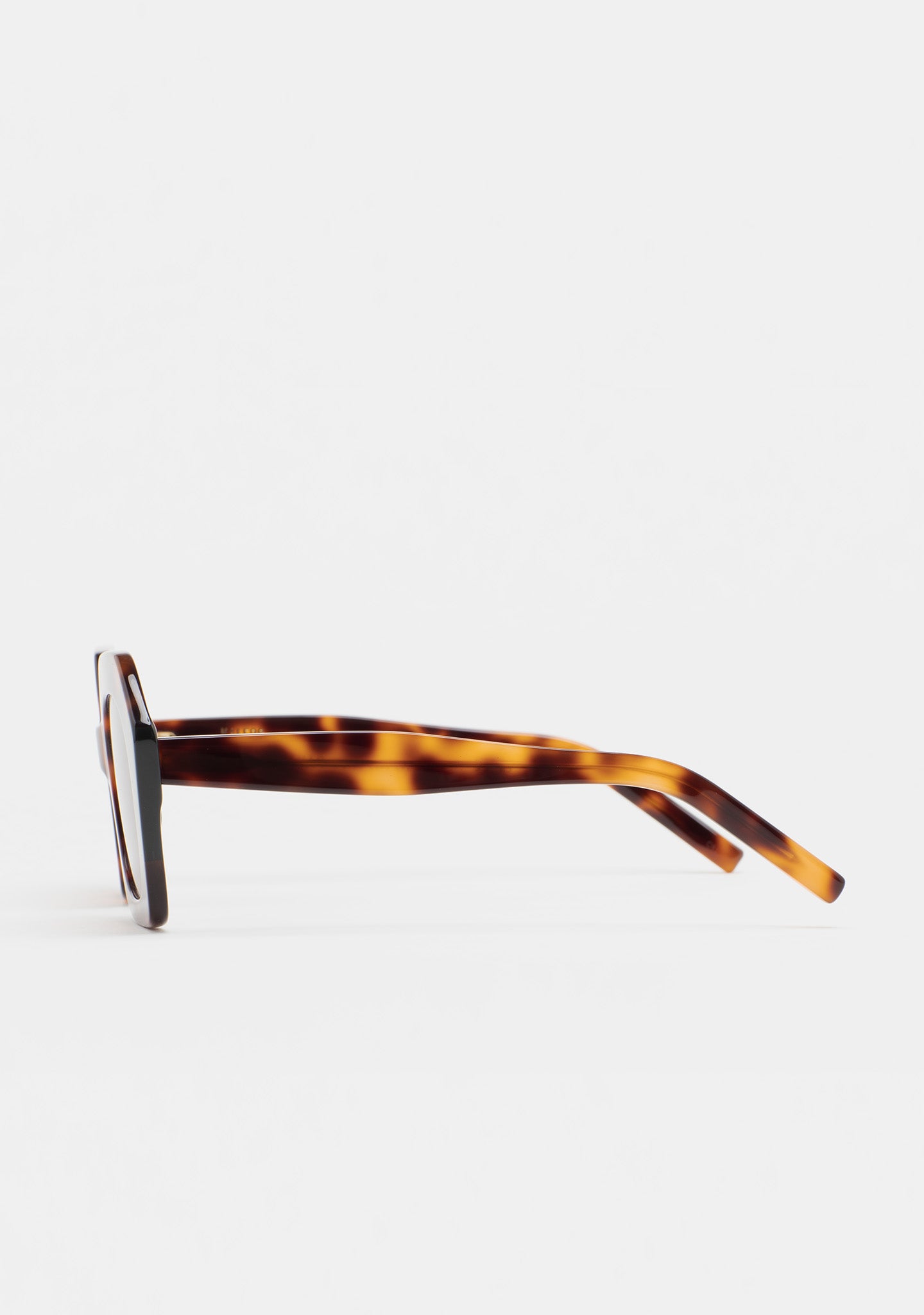 Hexagonal-shaped sunglasses. Front made of havana brown acetate with double laminate of translucent green and transparent green. Temples made of havana brown acetate. Green gradient lens category 2 with base 2, 100% UV protection, and anti-reflective treatment. Integrated acetate nose pads. Handmade.