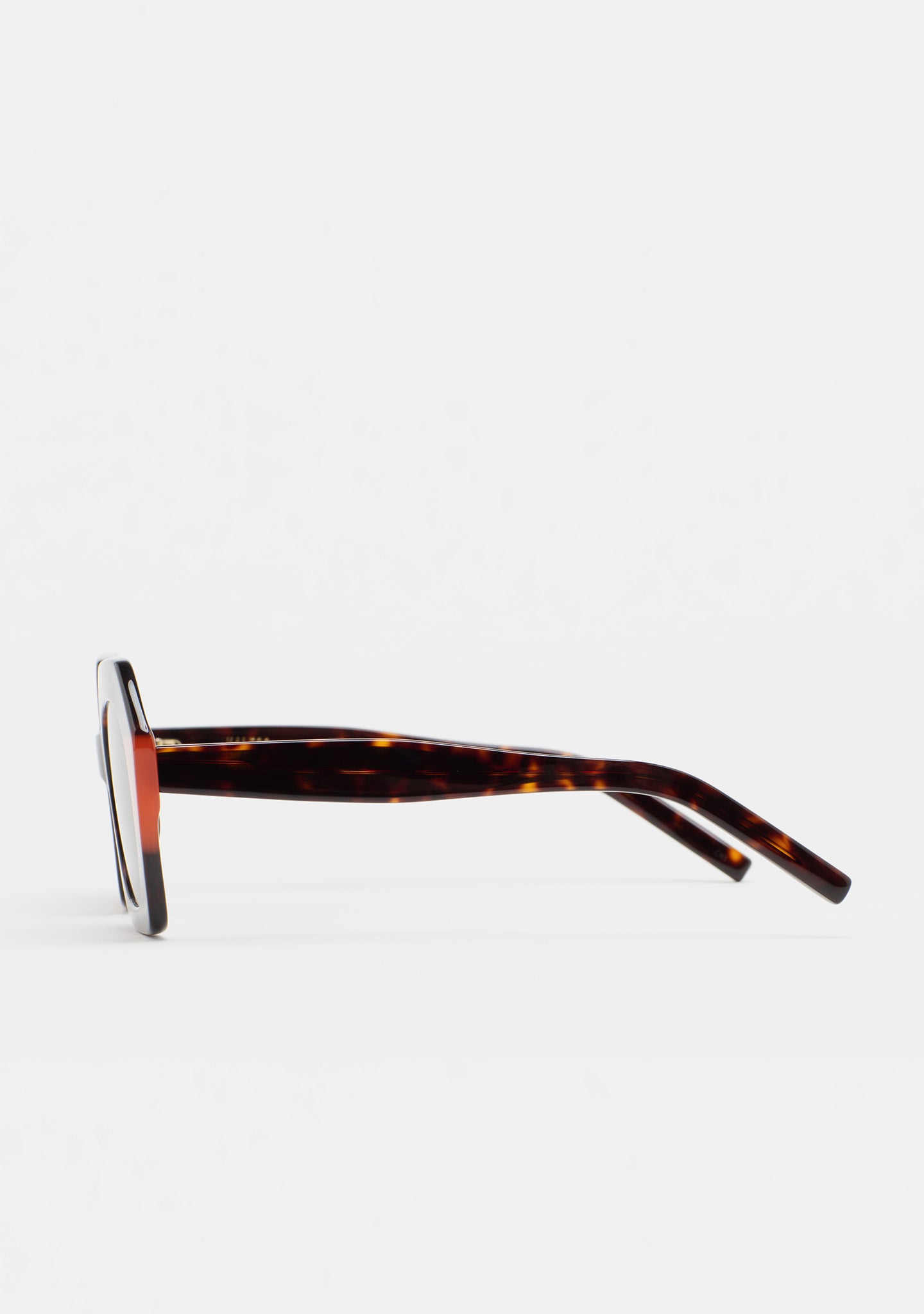 Hexagonal-shaped sunglasses. Front made of havana brown acetate with double laminate of translucent green and transparent green. Temples made of havana brown acetate. Green gradient lens category 2 with base 2, 100% UV protection, and anti-reflective treatment. Integrated acetate nose pads. Handmade.