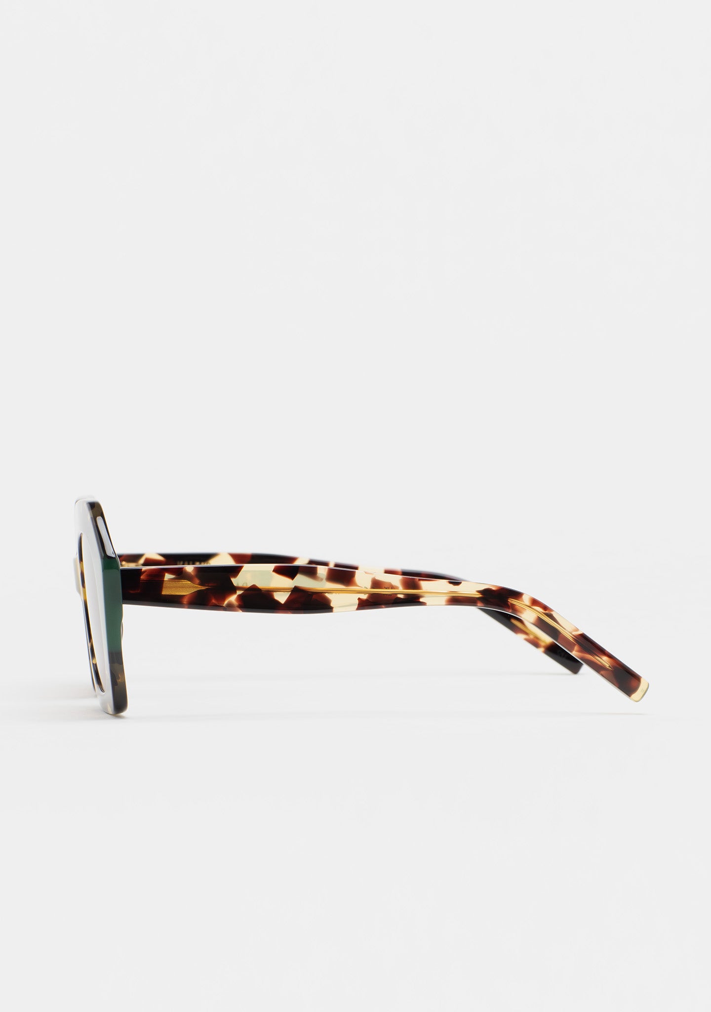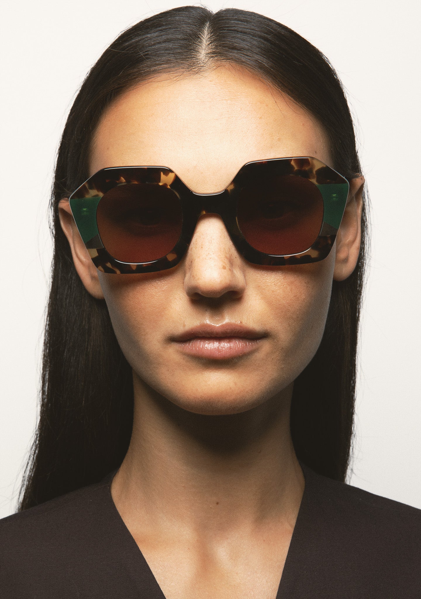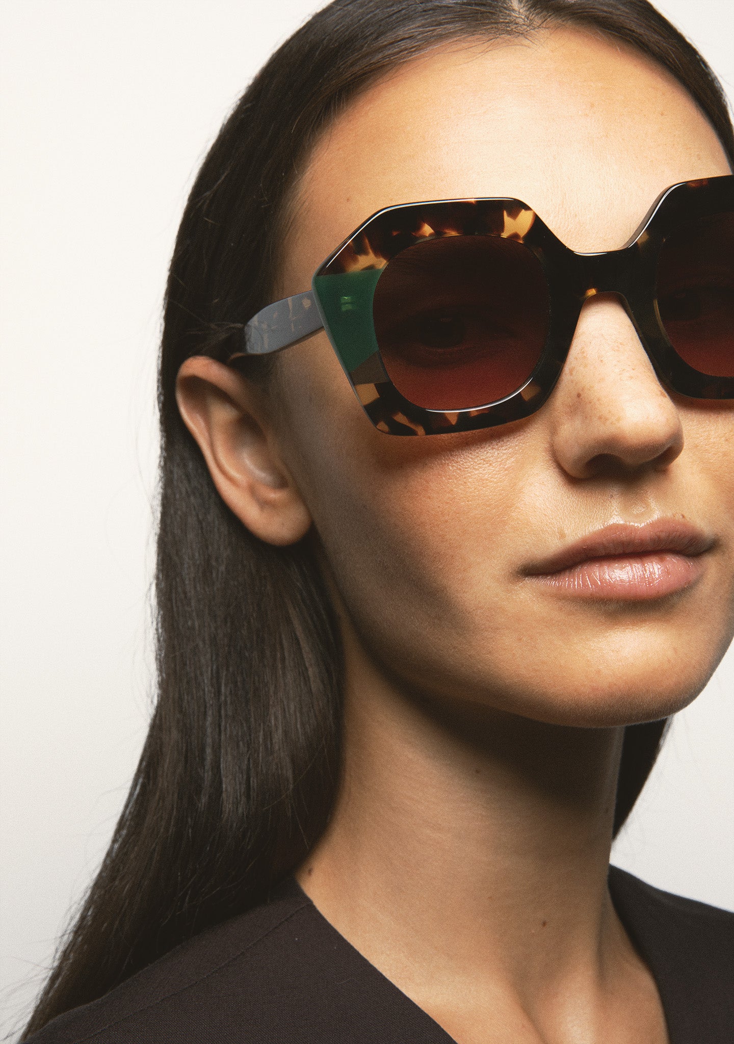 Hexagonal-shaped sunglasses. Front made of havana brown acetate with double laminate of translucent green and transparent green. Temples made of havana brown acetate. Green gradient lens category 2 with base 2, 100% UV protection, and anti-reflective treatment. Integrated acetate nose pads. Handmade.