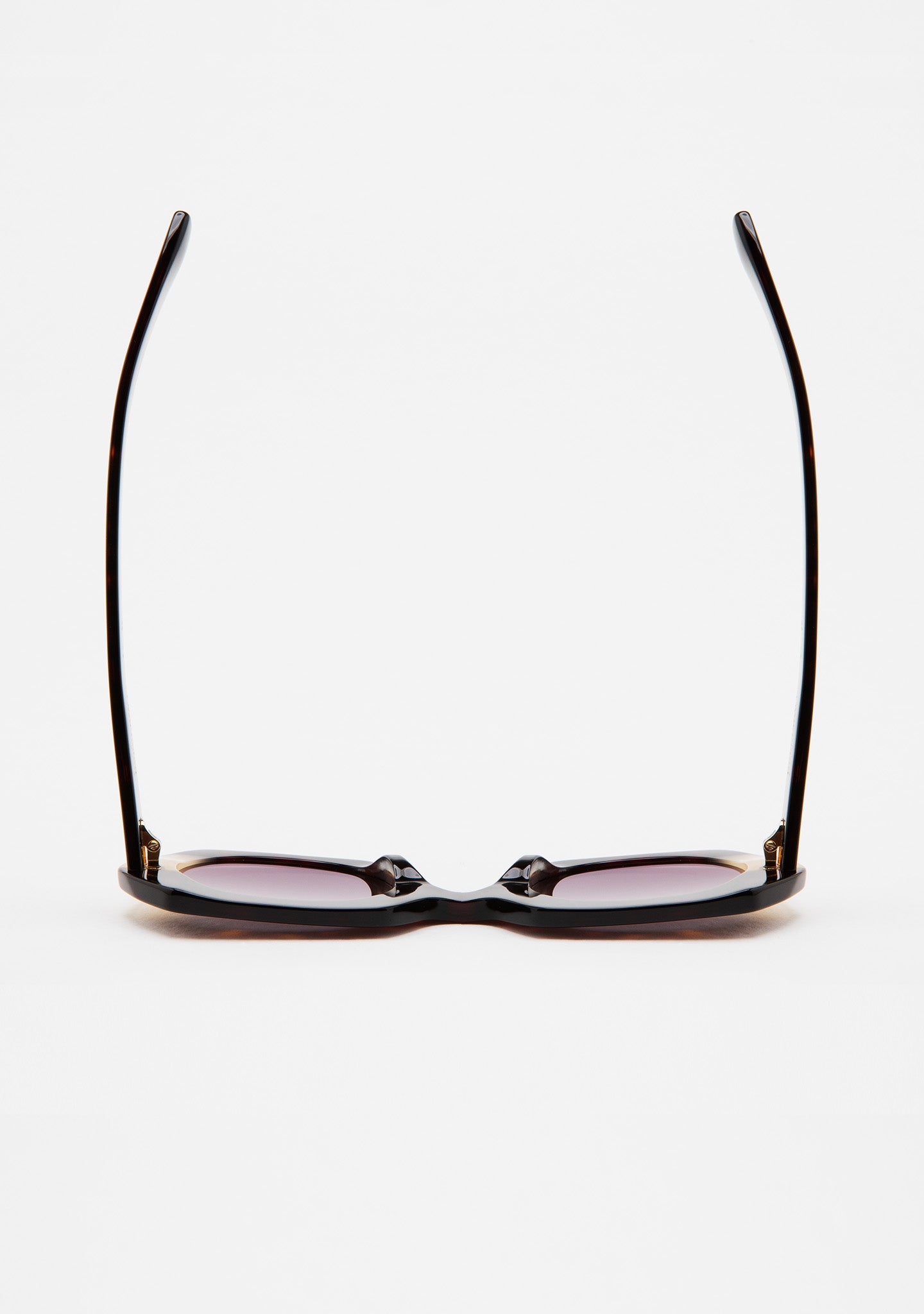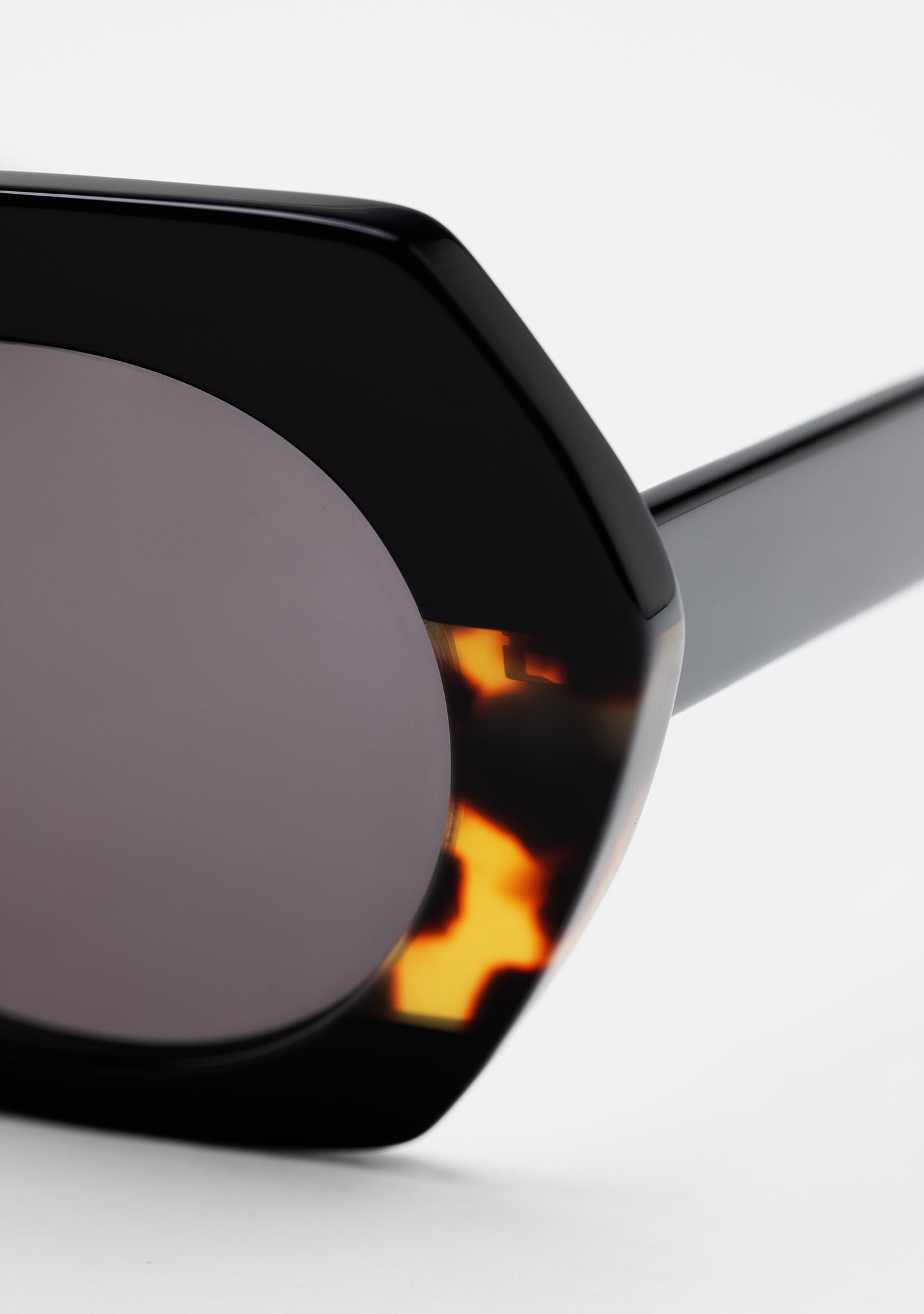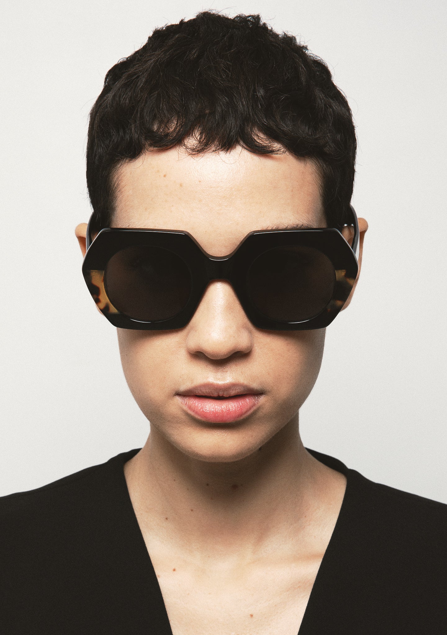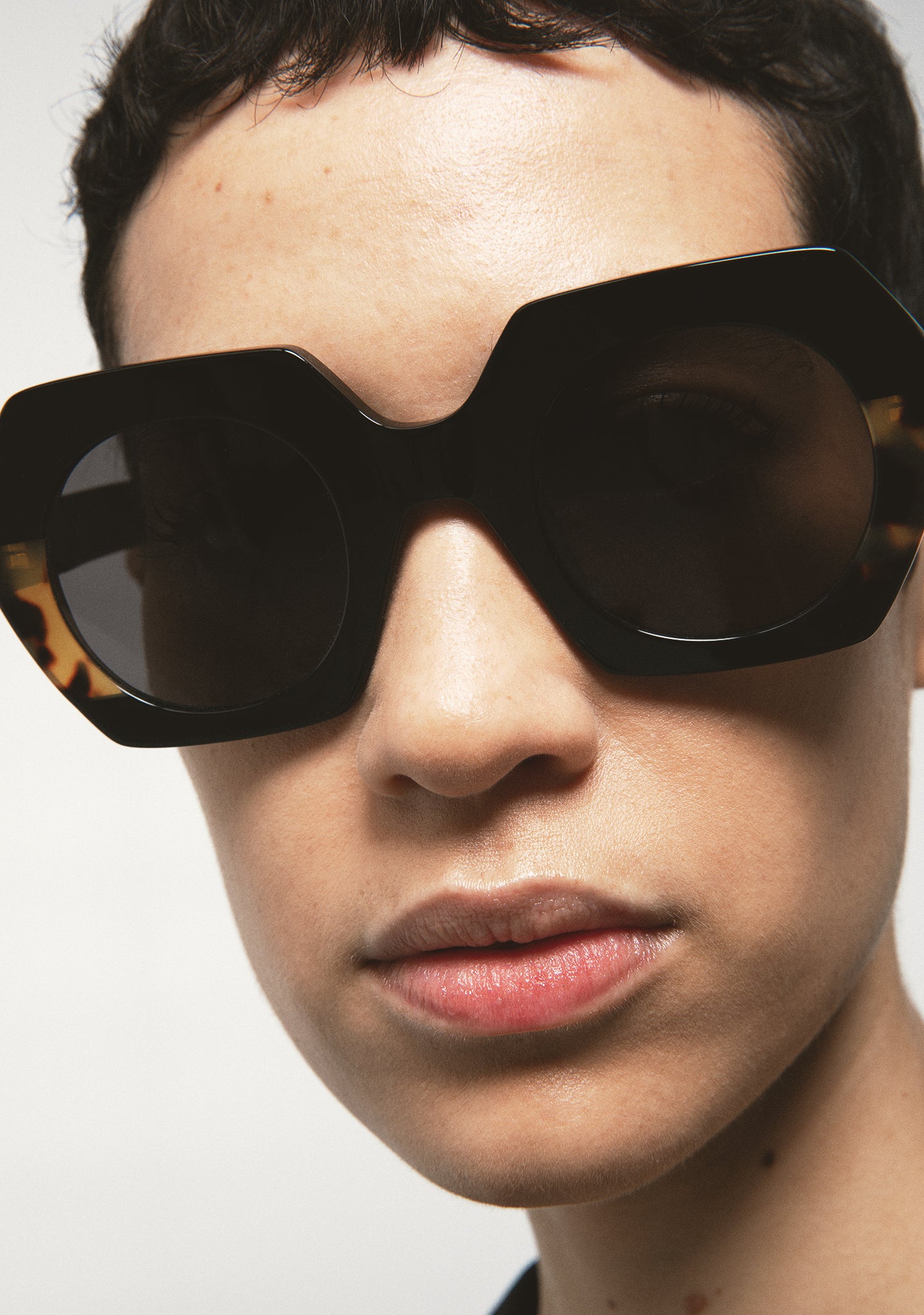 Hexagonal-shaped sunglasses. Black acetate front with translucent beige laminate. Black acetate temples. Black gradient 2-base lens with 100% UV protection and anti-reflective treatment. Category 3 lens. Built-in acetate nose pads. Handmade.