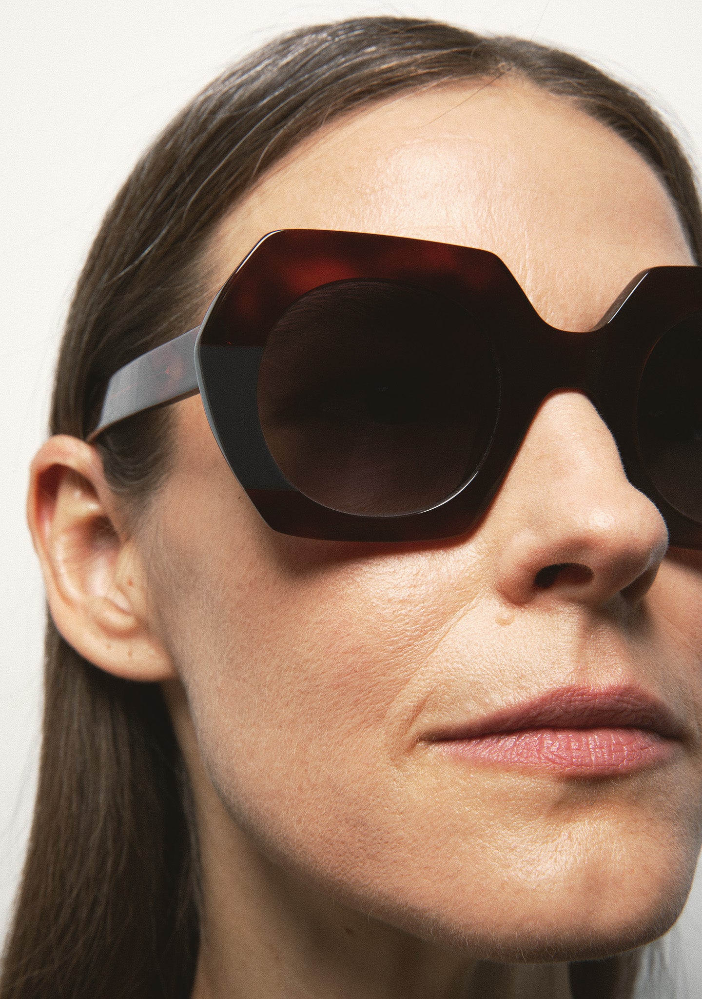 Hexagonal-shaped sunglasses. Black acetate front with translucent beige laminate. Black acetate temples. Black gradient 2-base lens with 100% UV protection and anti-reflective treatment. Category 3 lens. Built-in acetate nose pads. Handmade.