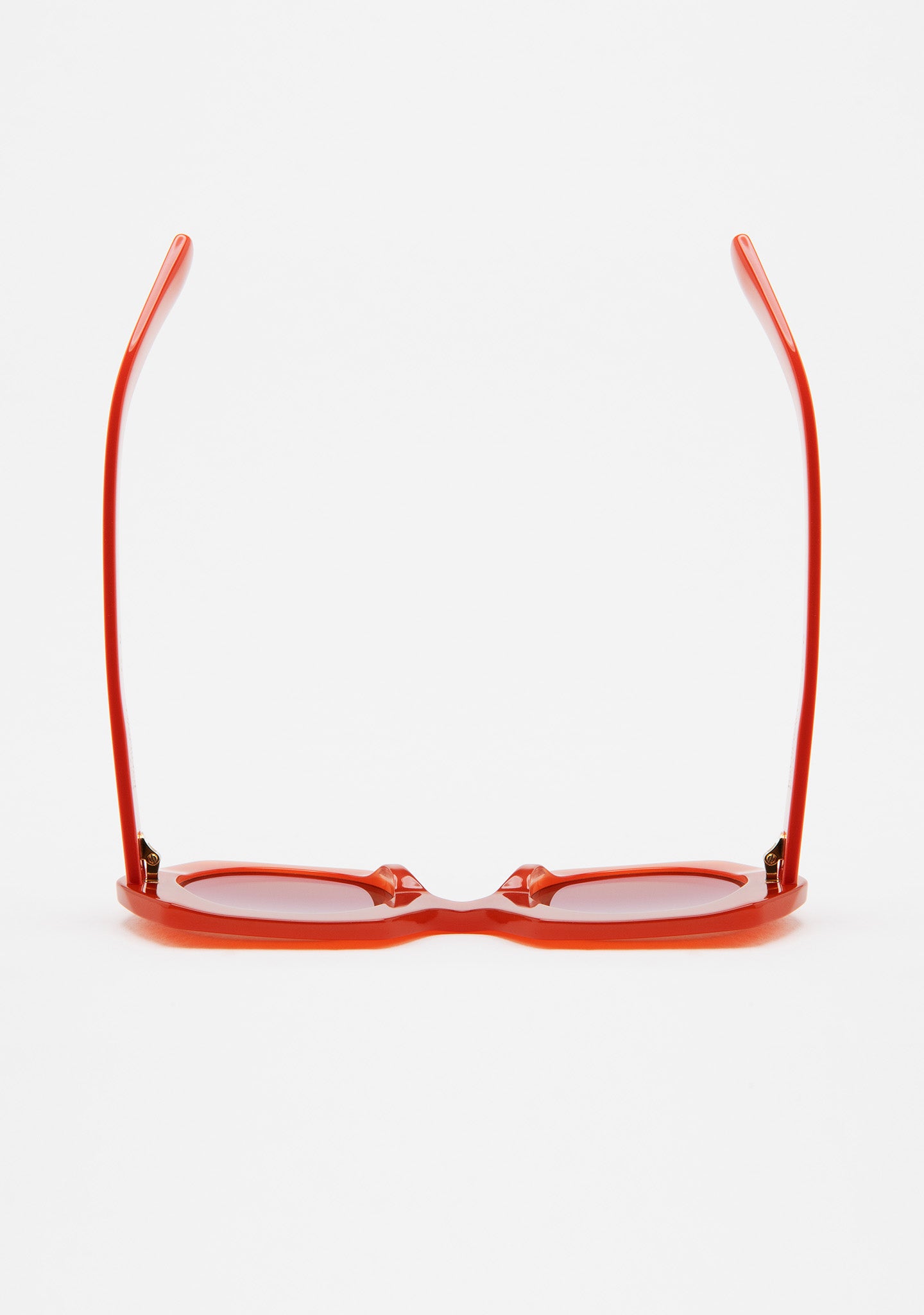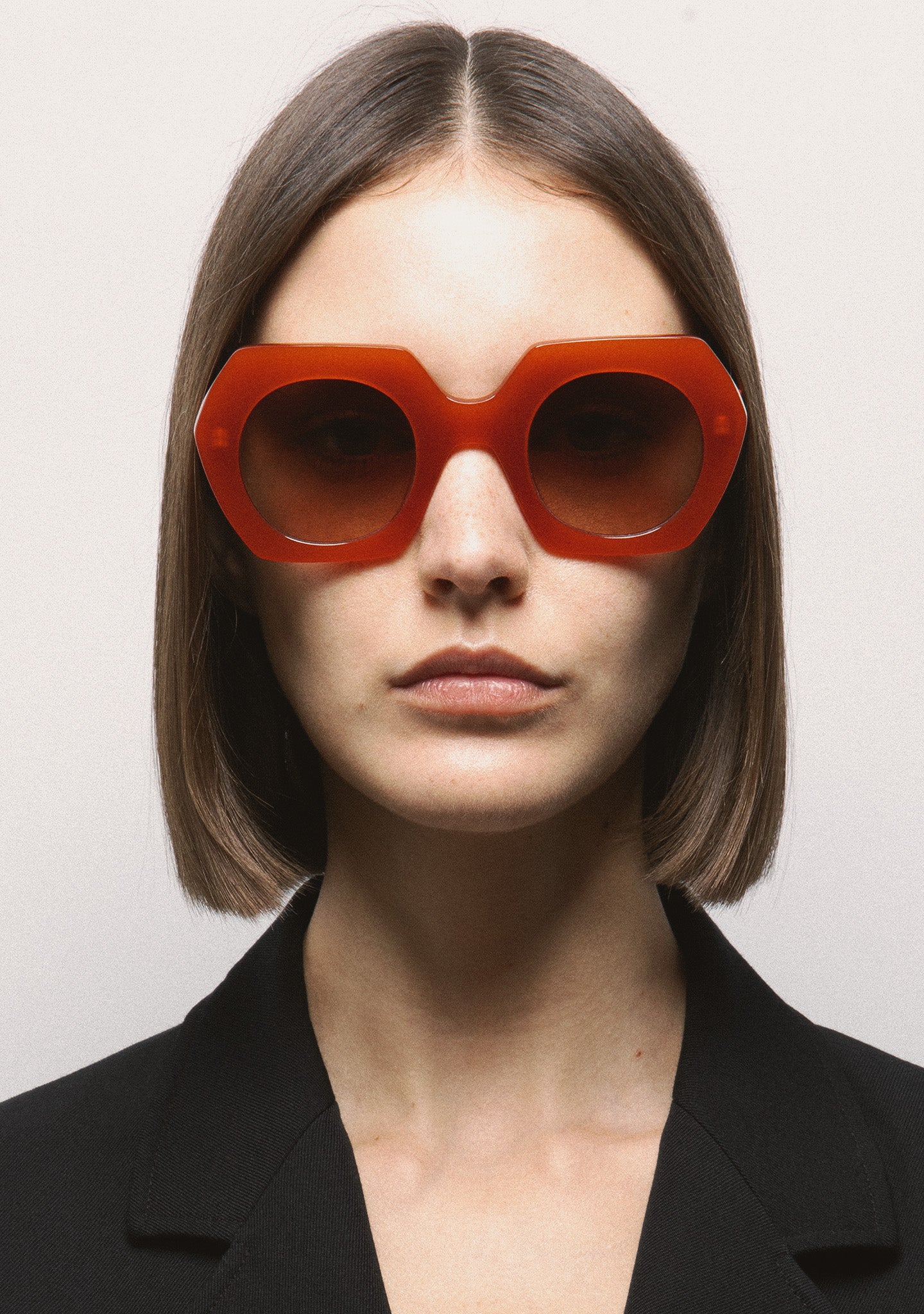 Hexagonal-shaped sunglasses. Black acetate front with translucent beige laminate. Black acetate temples. Black gradient 2-base lens with 100% UV protection and anti-reflective treatment. Category 3 lens. Built-in acetate nose pads. Handmade.