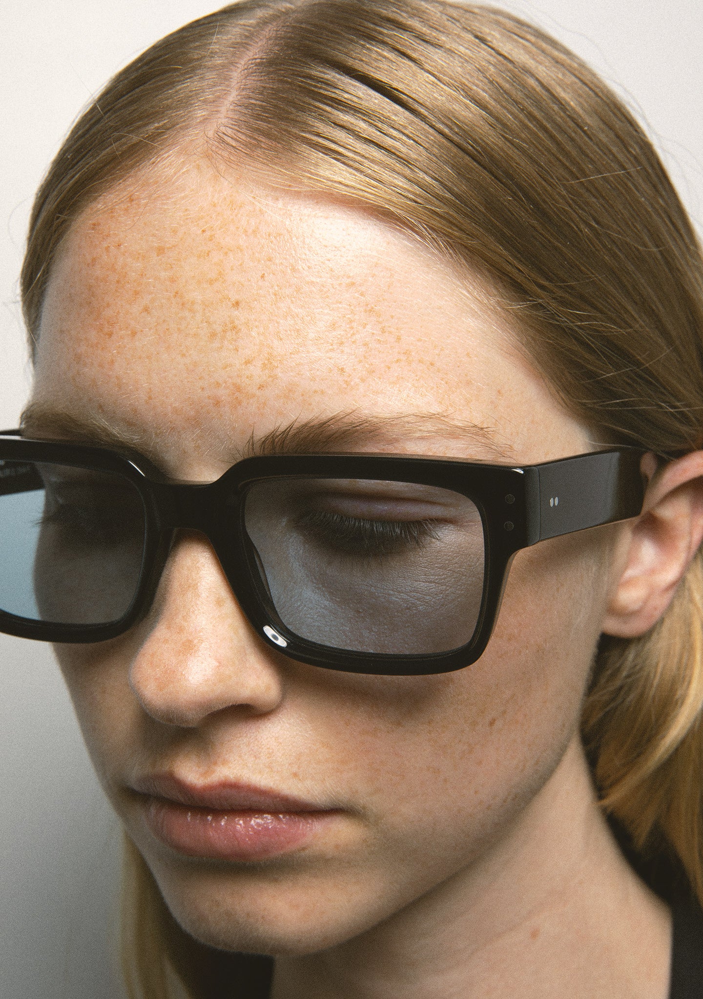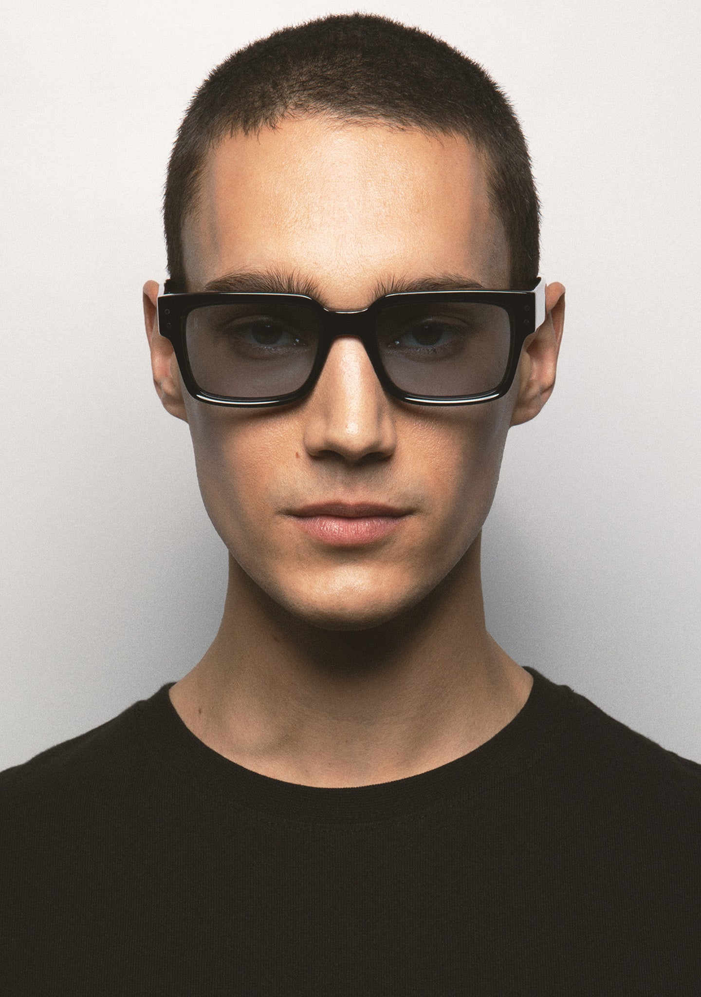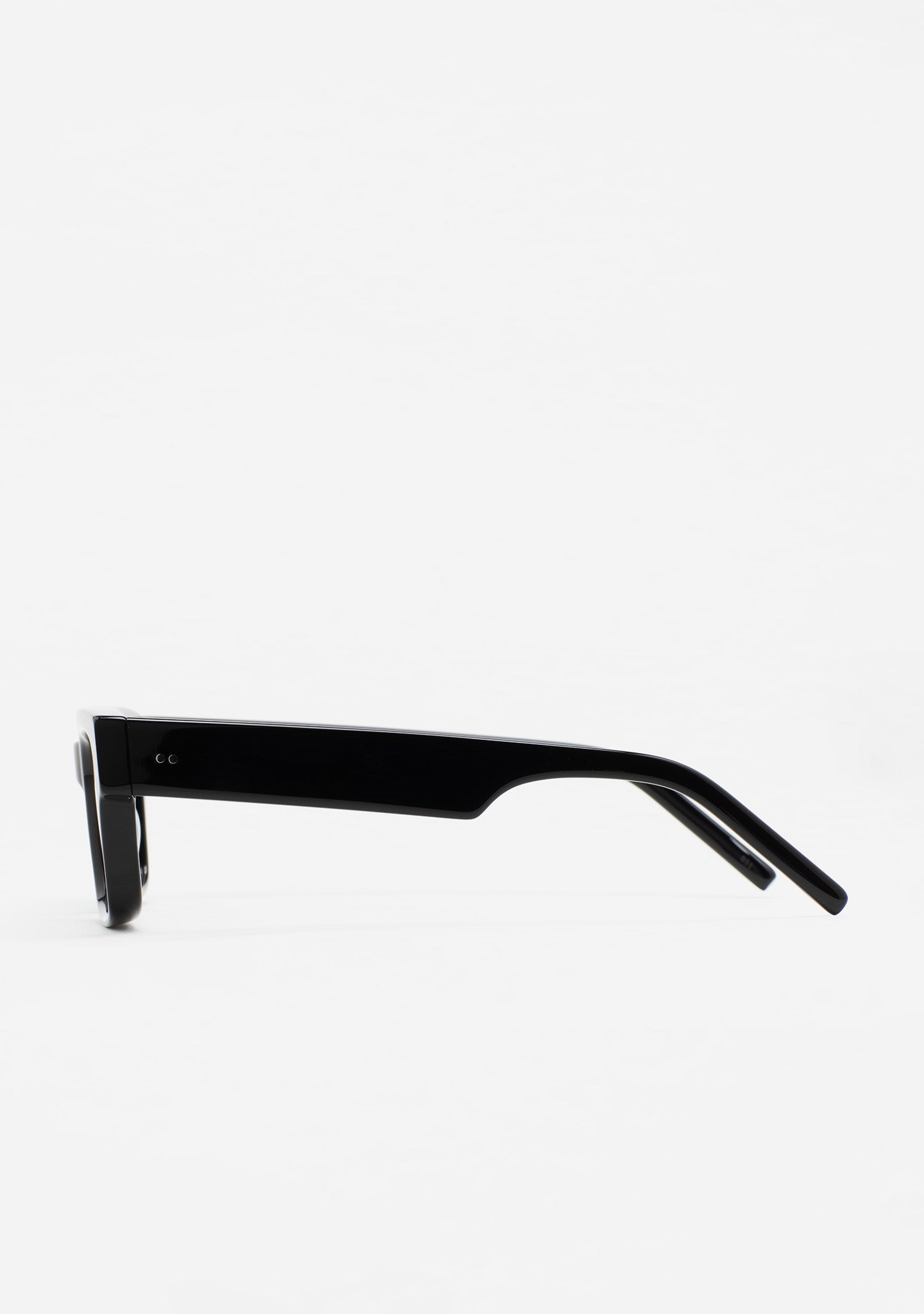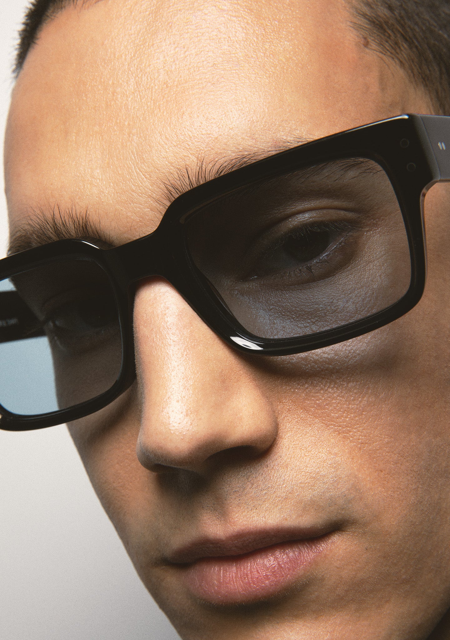 Rectangular-shaped optical glasses. Black acetate front and temples. Silver rivet hinges on the corners and temples. Blue photochromic gradient 2-base lens with UV protection and anti-reflective treatment. Category 1-3 lenses. Built-in acetate nose pads. Handmade.