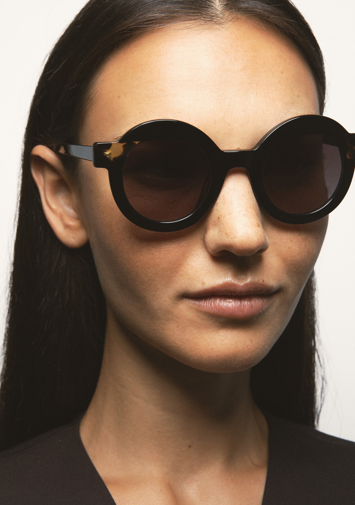 Round-shaped sunglasses. Front made of black acetate with dark Havana brown laminate. Black acetate temples. Grey gradient lens, category 2, with 100% UV protection and anti-reflective coating. Category 3 lens. Integrated acetate nose pads. Handmade.