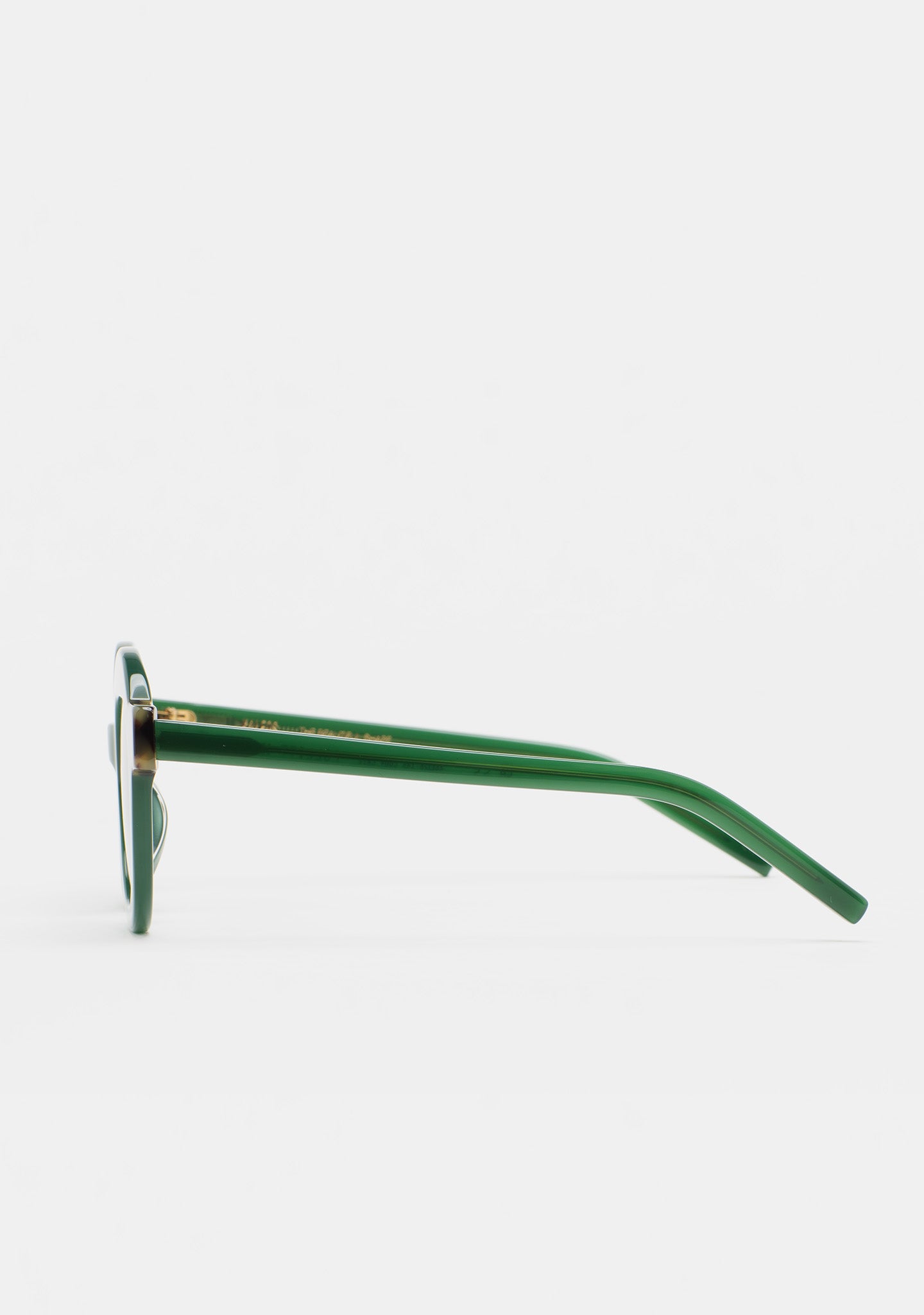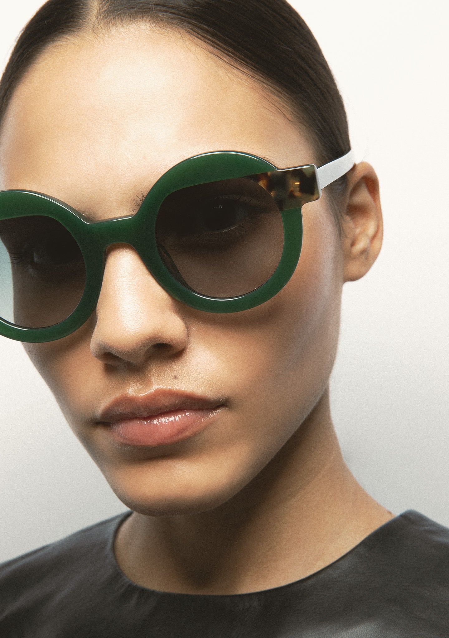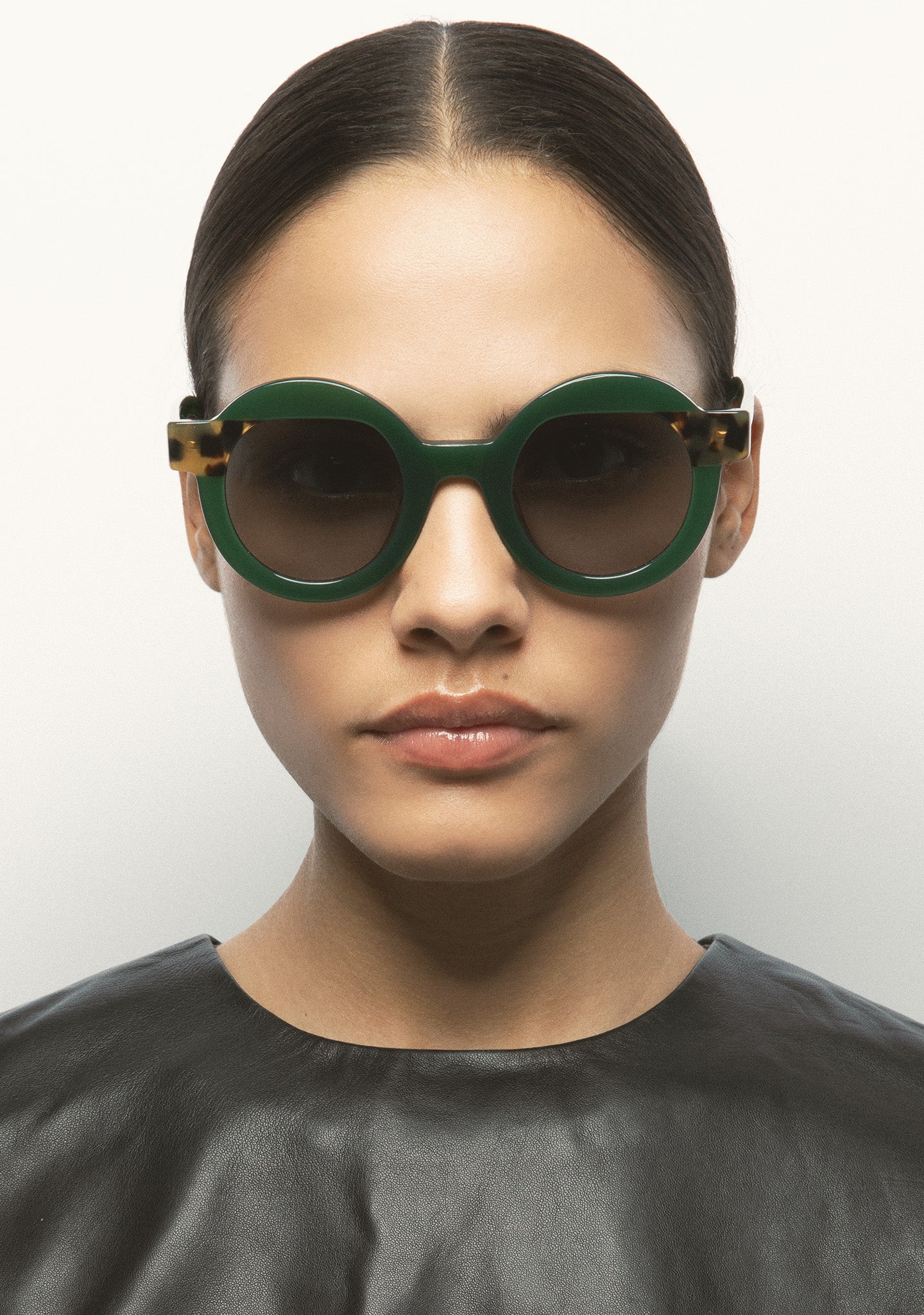 Round-shaped sunglasses. Front made of black acetate with dark Havana brown laminate. Black acetate temples. Grey gradient lens, category 2, with 100% UV protection and anti-reflective coating. Category 3 lens. Integrated acetate nose pads. Handmade.