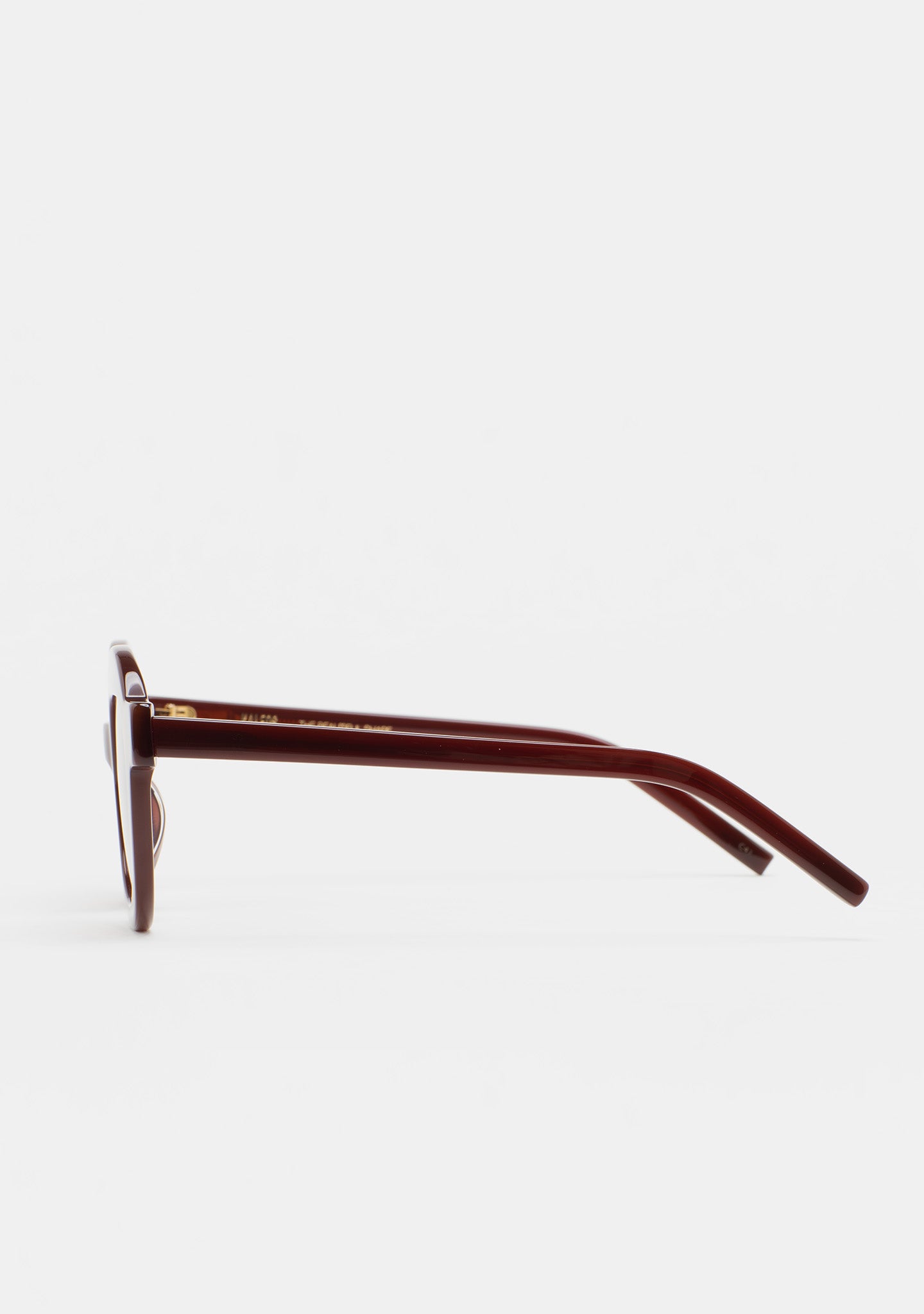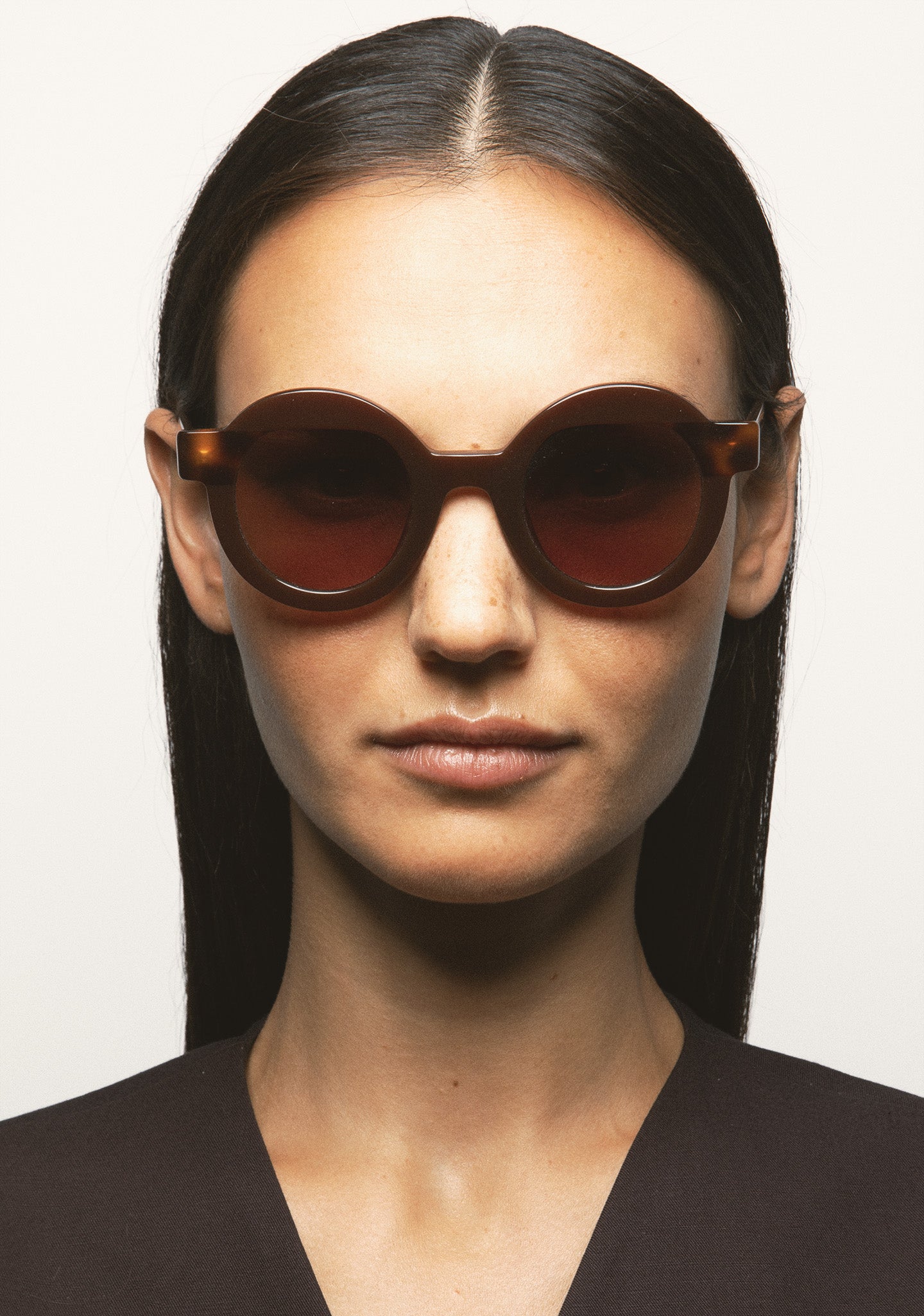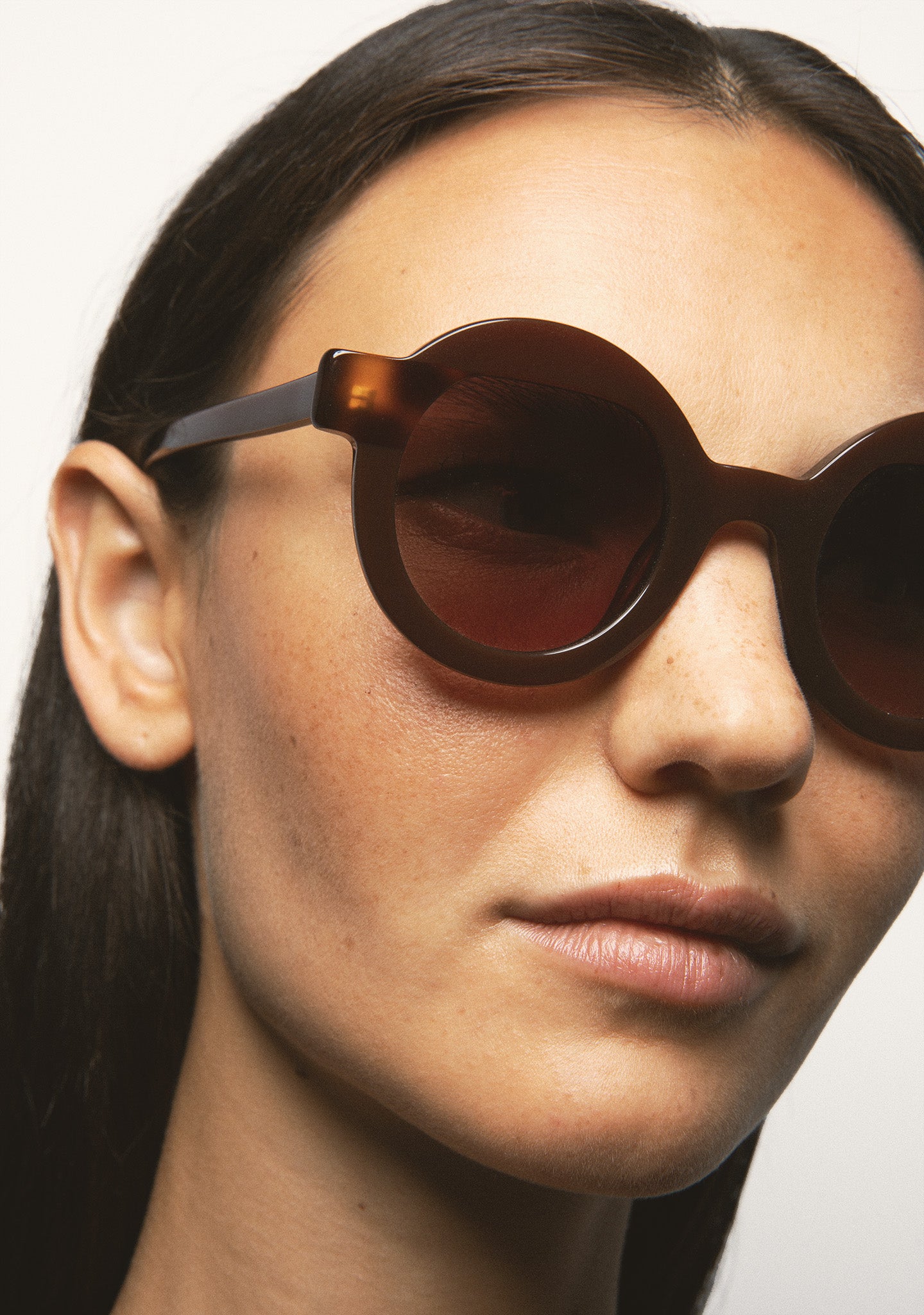 Round-shaped sunglasses. Front made of black acetate with dark Havana brown laminate. Black acetate temples. Grey gradient lens, category 2, with 100% UV protection and anti-reflective coating. Category 3 lens. Integrated acetate nose pads. Handmade.