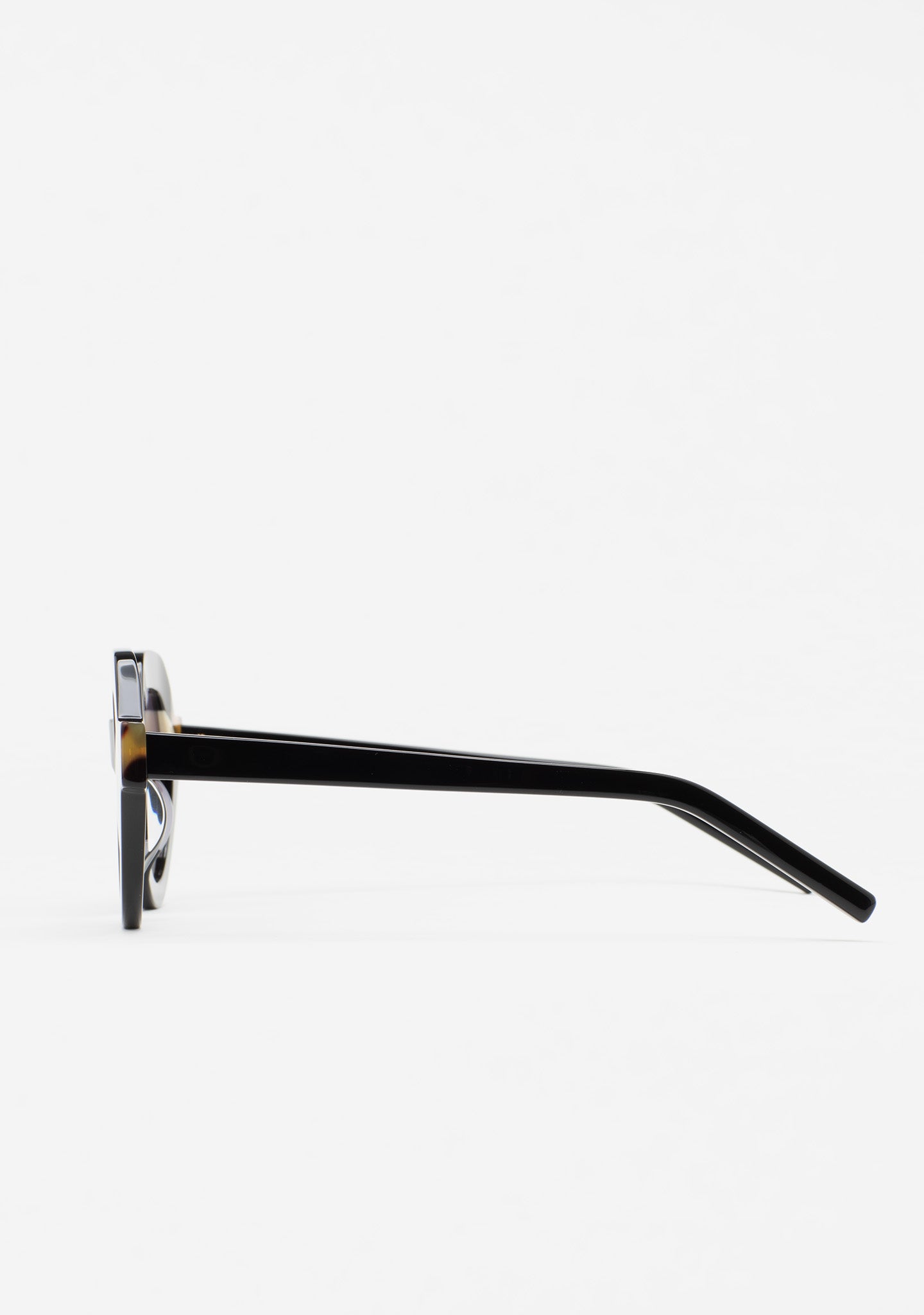 Round-shaped sunglasses with a design featuring a pronounced temple and a front in a different color. Front of black acetate with double-layered Havana brown and white laminate. Black acetate temples. Black gradient lens, base 2, with 100% UV protection and anti-reflective coating. Lens Category 3. Acetate nose pads incorporated. Handmade.