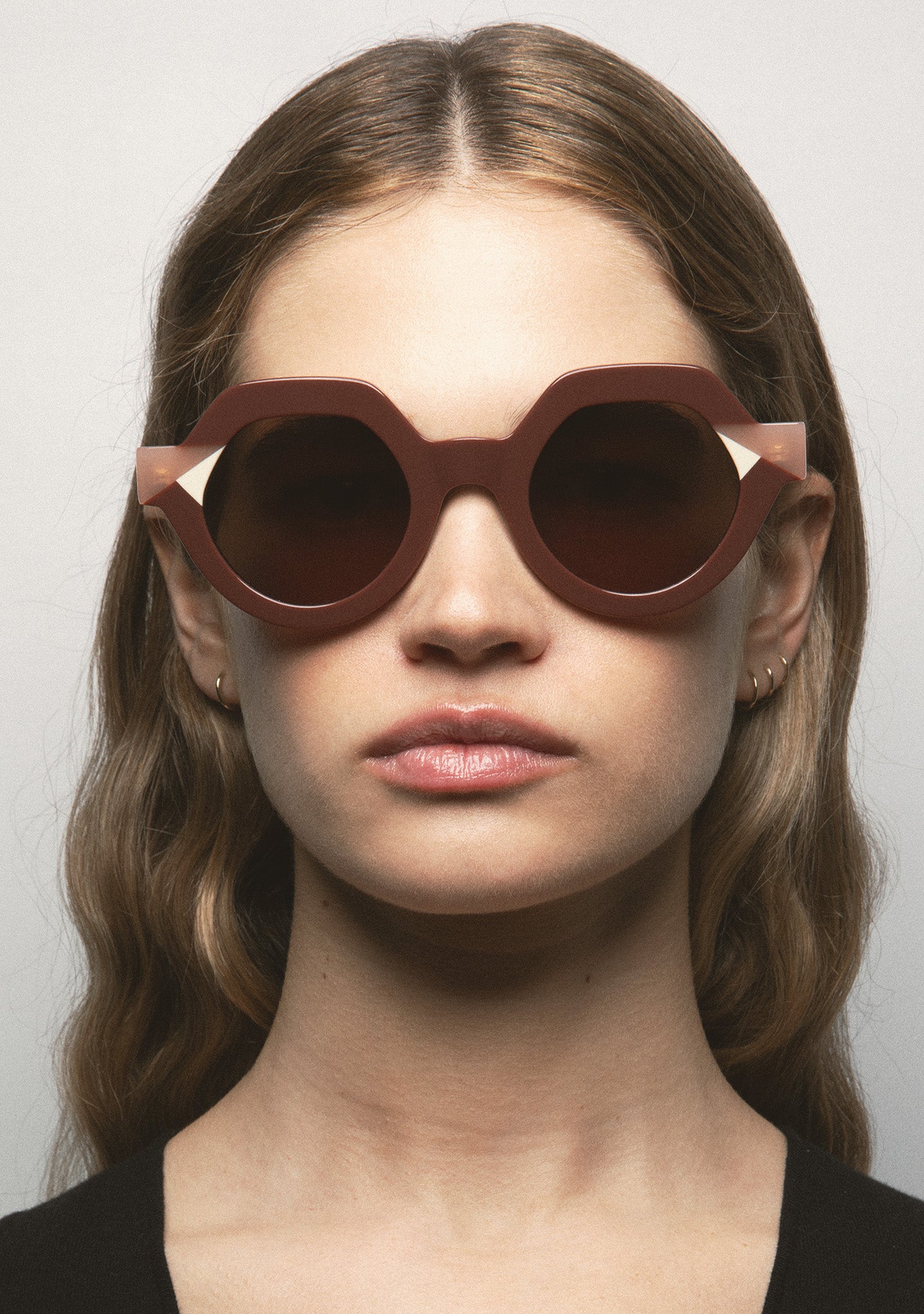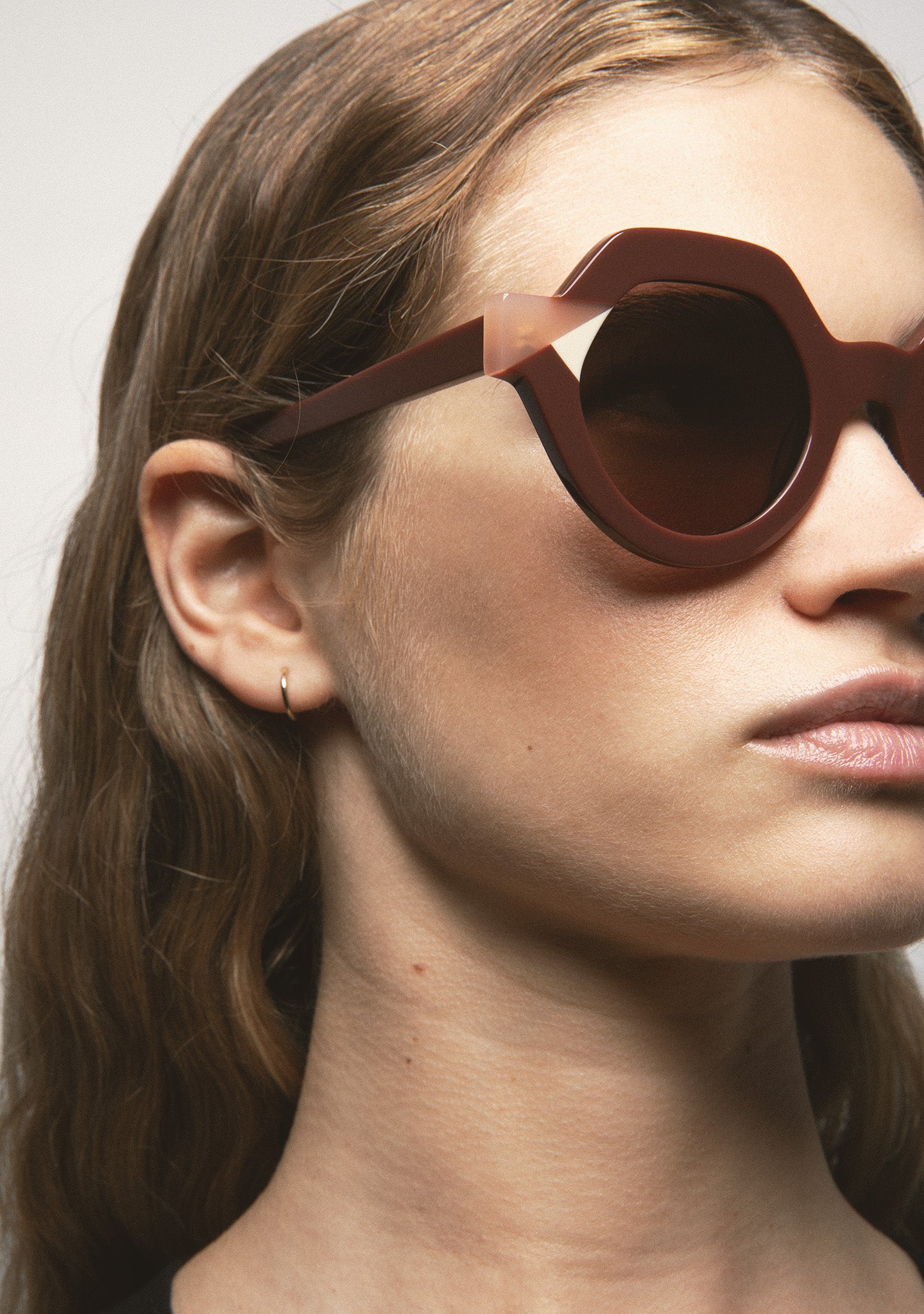 Round-shaped sunglasses with a design featuring a pronounced temple and a front in a different color. Front of black acetate with double-layered Havana brown and white laminate. Black acetate temples. Black gradient lens, base 2, with 100% UV protection and anti-reflective coating. Lens Category 3. Acetate nose pads incorporated. Handmade.
