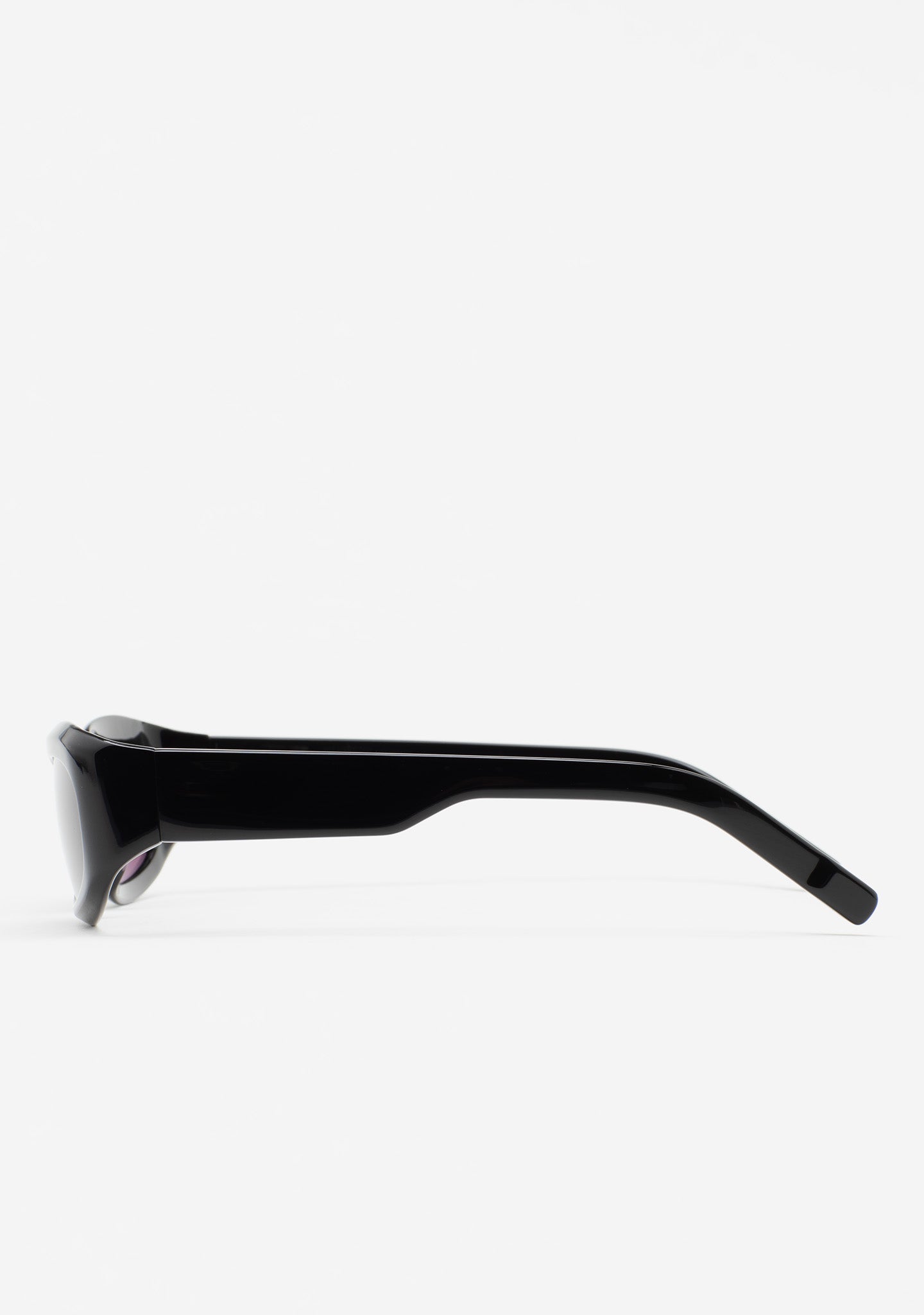 Rectangular sunglasses with carving across the entire front (top and bottom). Black acetate frame and temples. Curved temple-tip. Photochromic blue lens, base 6, with UV protection and anti-reflective treatment. Category 1-3 lens. Integrated acetate nose pads. Handcrafted.
